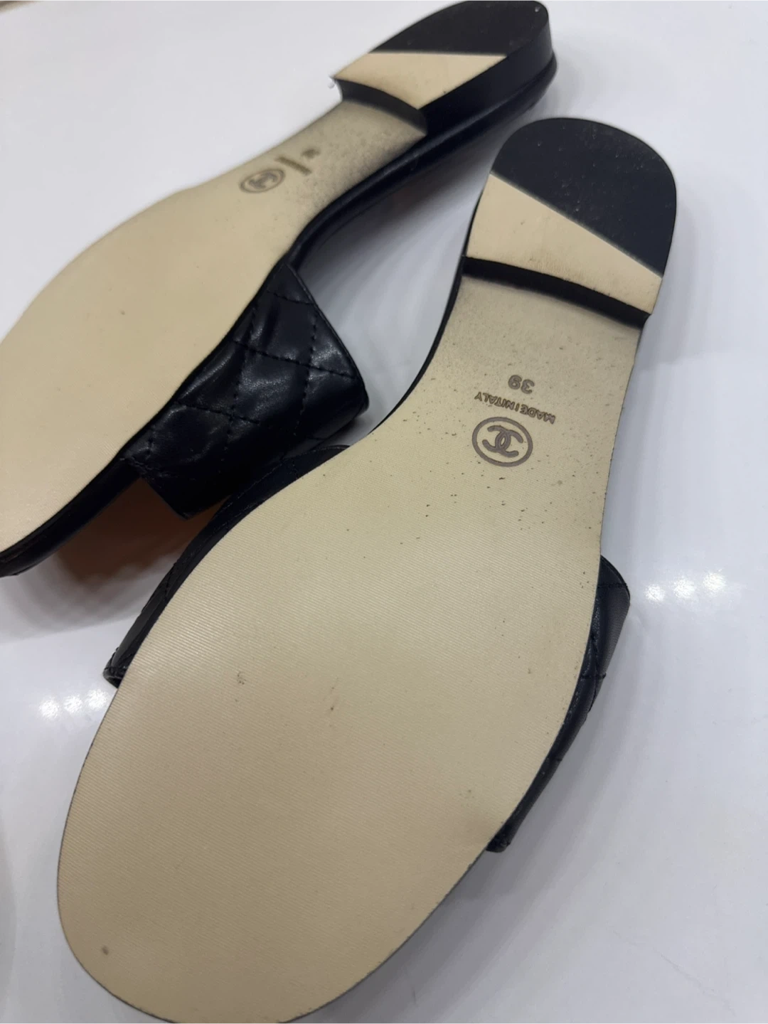 Selling a pair of Chanel sandals in black leather. They are in good condition and are a size 39. Perfect for a casual day out or dressing up for an evening event!