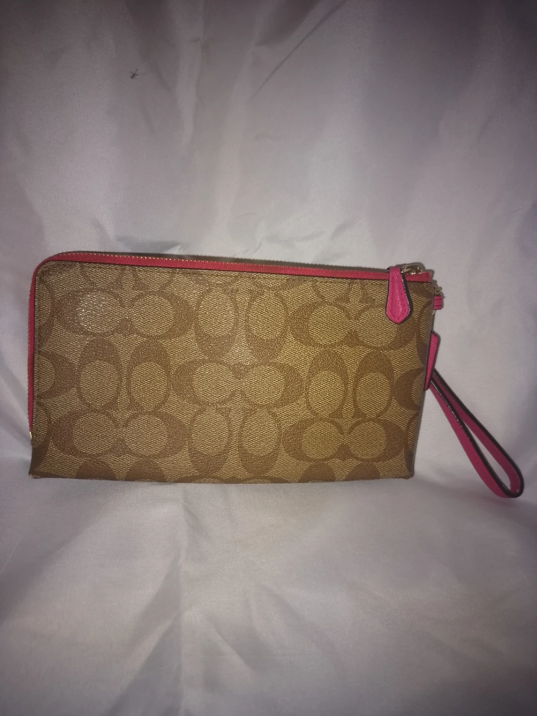 Selling a Coach wristlet wallet in a brown signature print with pink accents. It's in great condition and perfect for carrying your essentials!