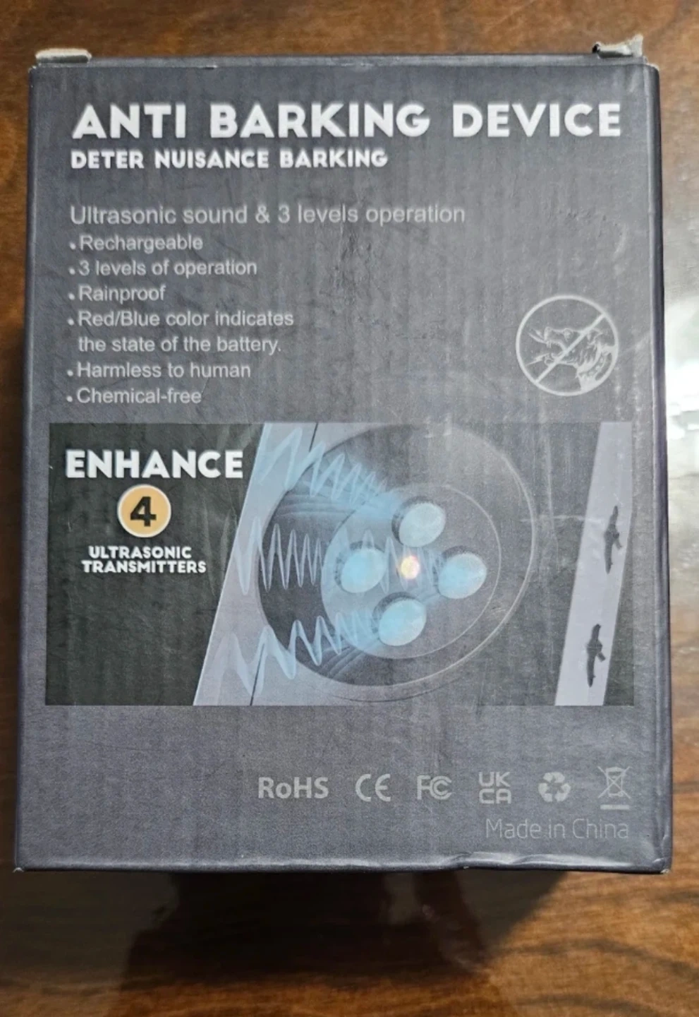 Selling an anti-barking device that uses ultrasonic sound to deter nuisance barking.