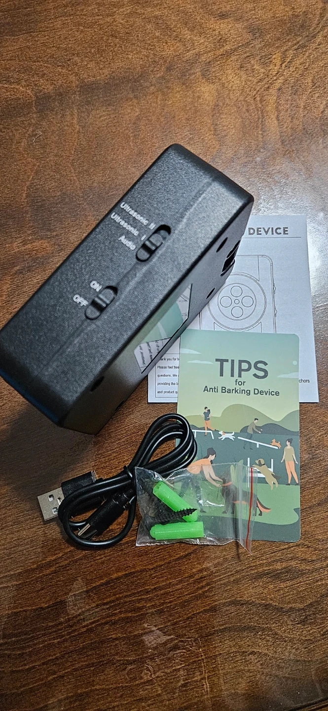 Included is the device, USB charging cable, and instruction manual. It's a harmless solution to help with dog barking issues