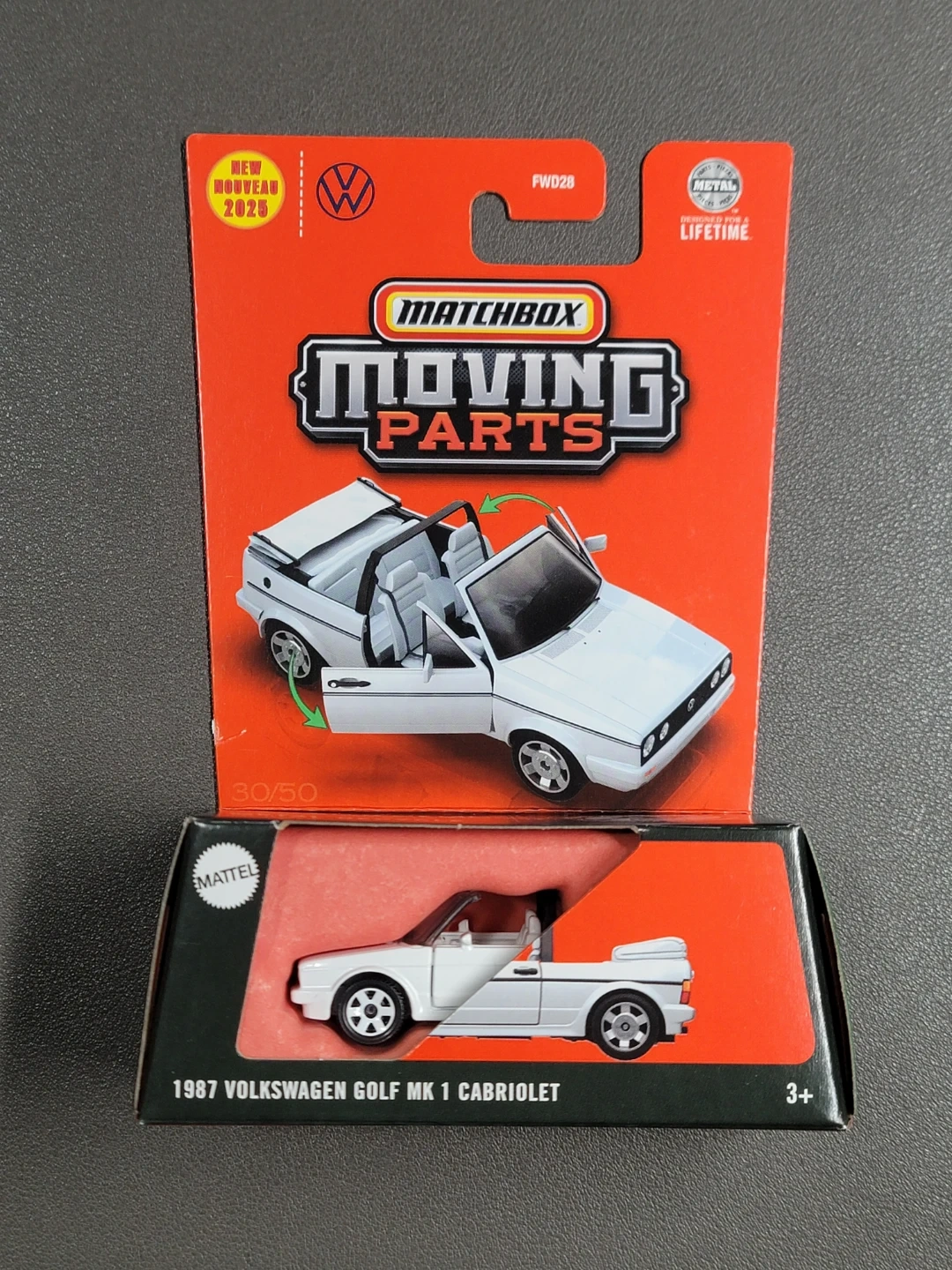 I have a brand new Matchbox 1987 Volkswagen Golf MK 1 Cabriolet for sale! This cool toy car has moving parts and is designed for a lifetime of fun. It's part of the Moving Parts series from Matchbox, so it's a great addition to any collection!
