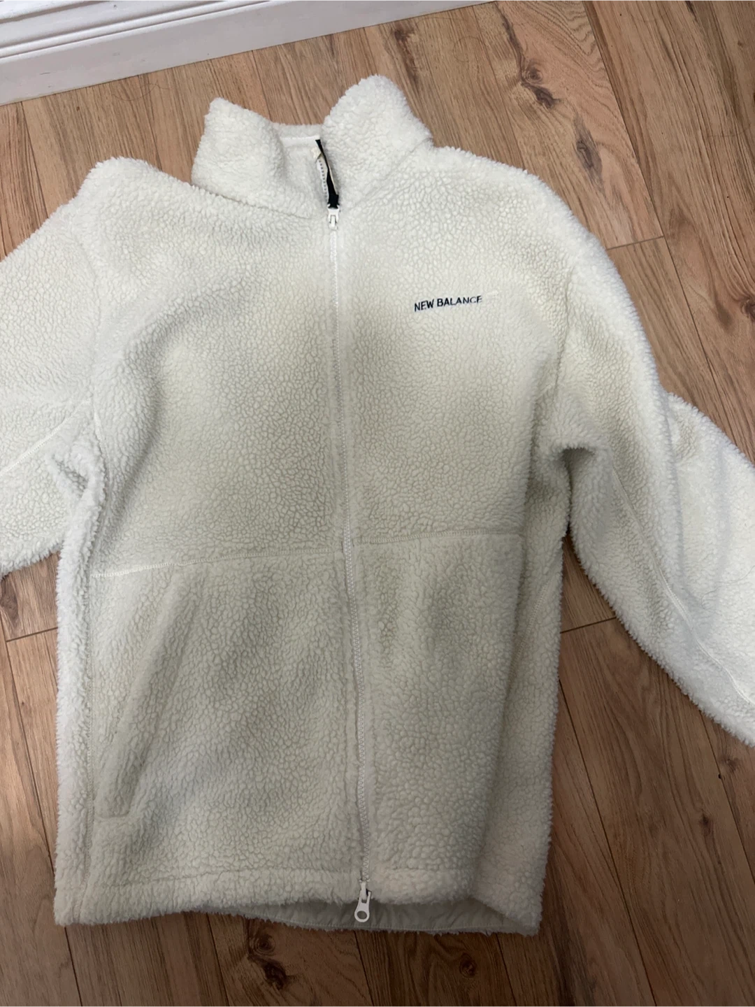 Cozy up with this New Balance fleece jacket! It's a lovely cream/off-white colour and perfect for layering during the cooler months. It's in great condition and ready for a new owner!