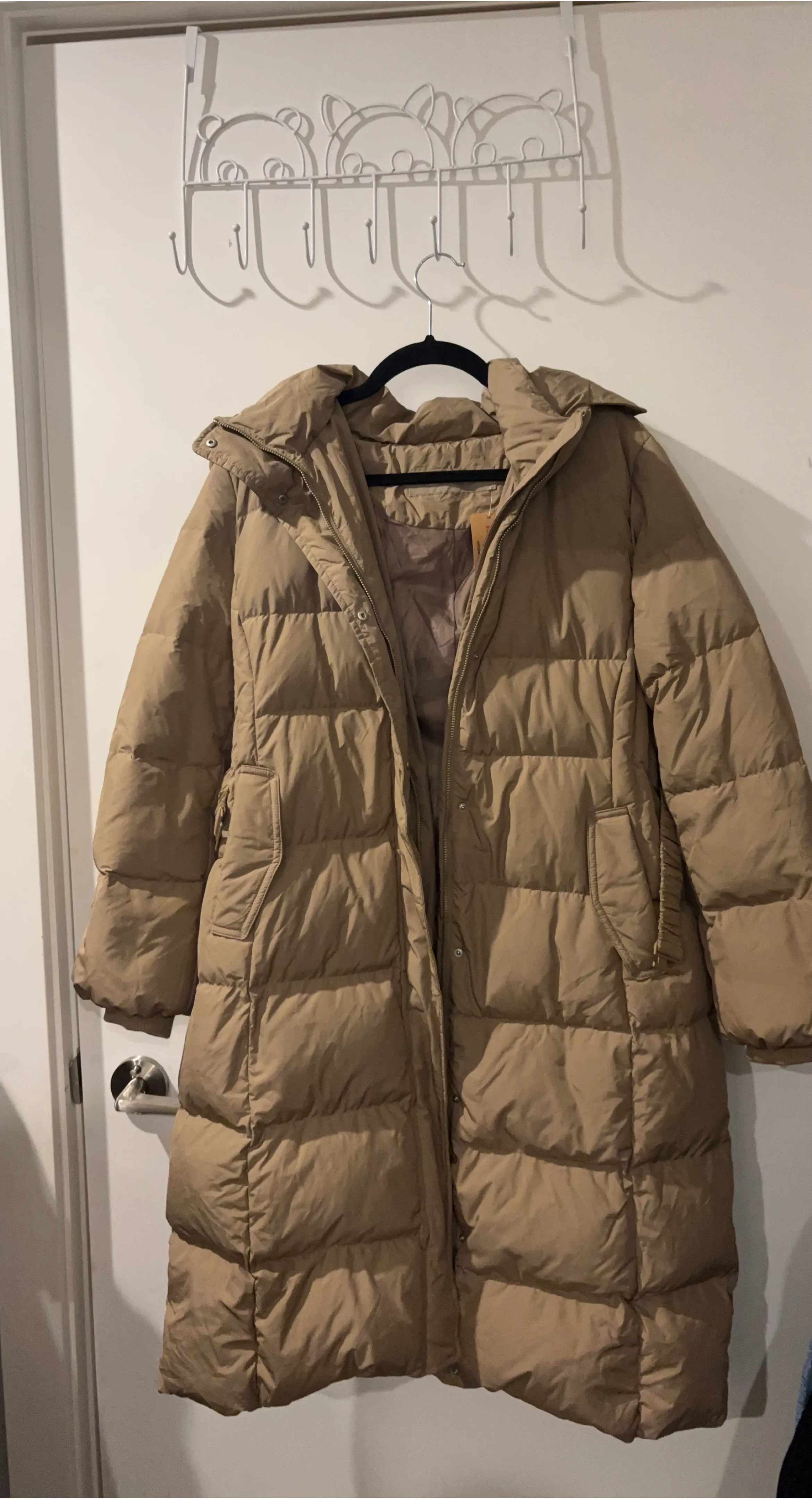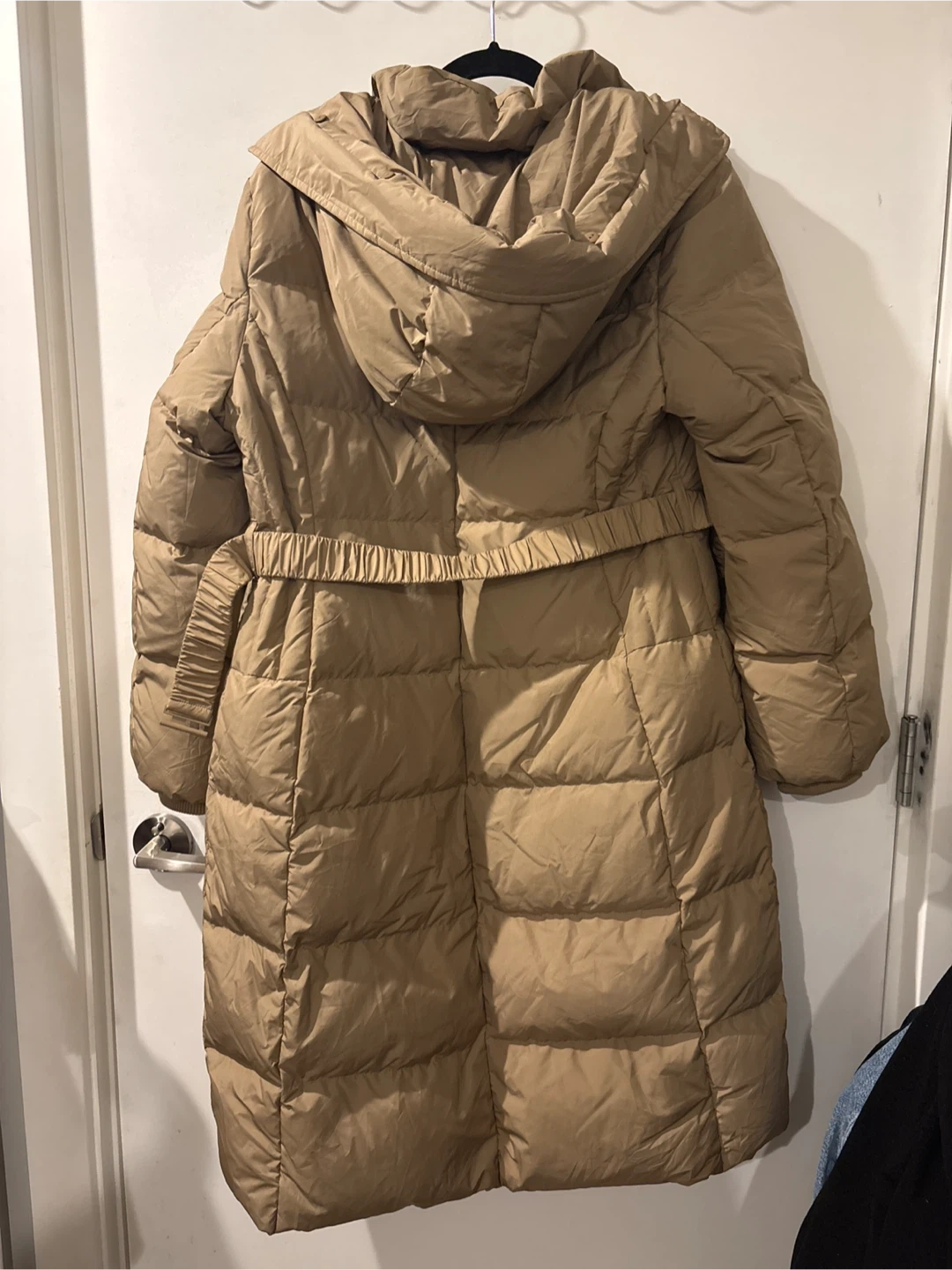 Selling a cozy beige puffer coat! It's totally new, never worn before and perfect for staying warm during the colder months. It features a hood and a belt.