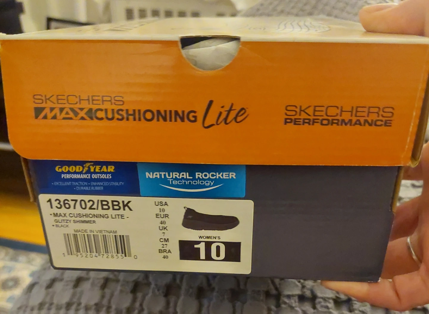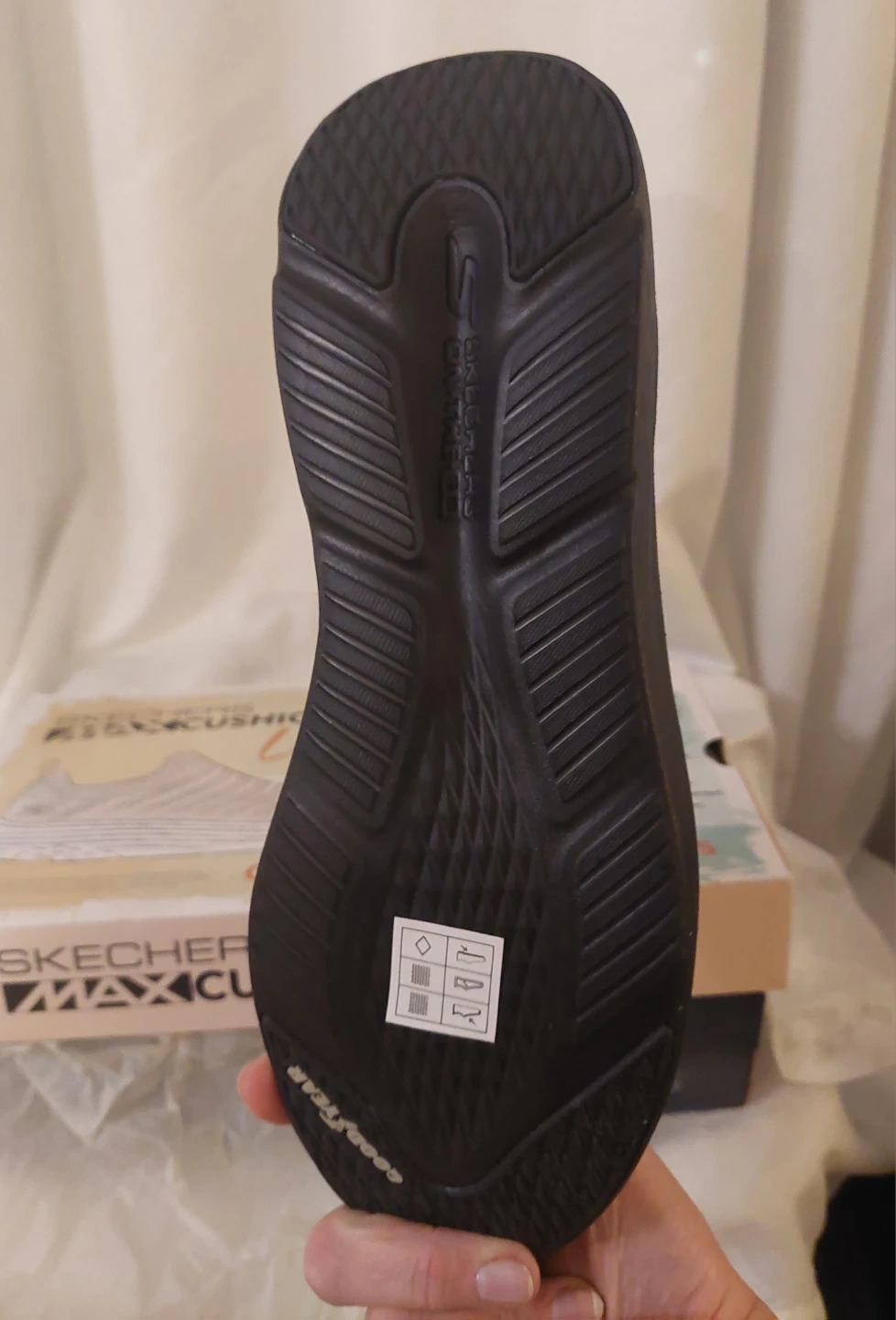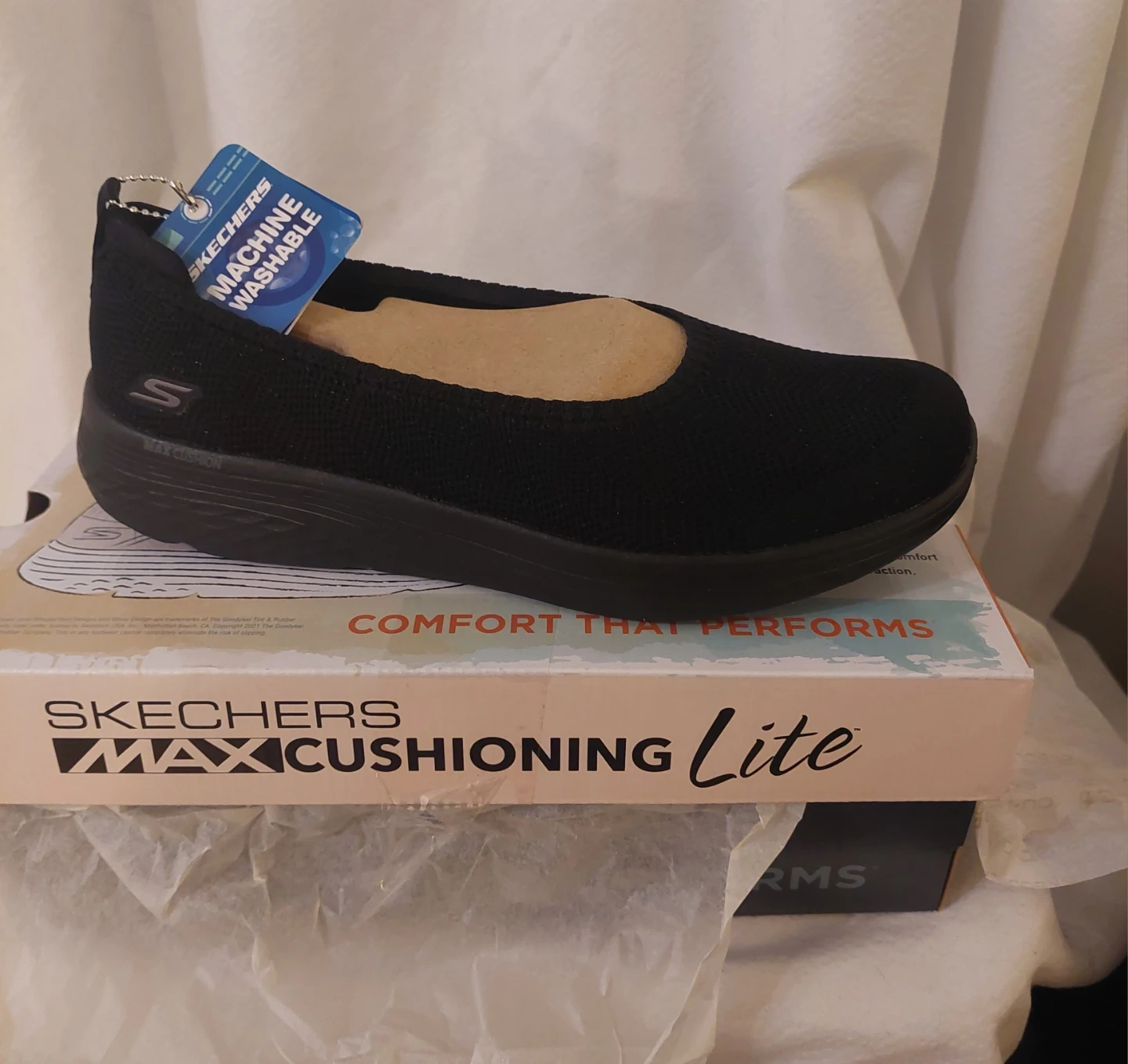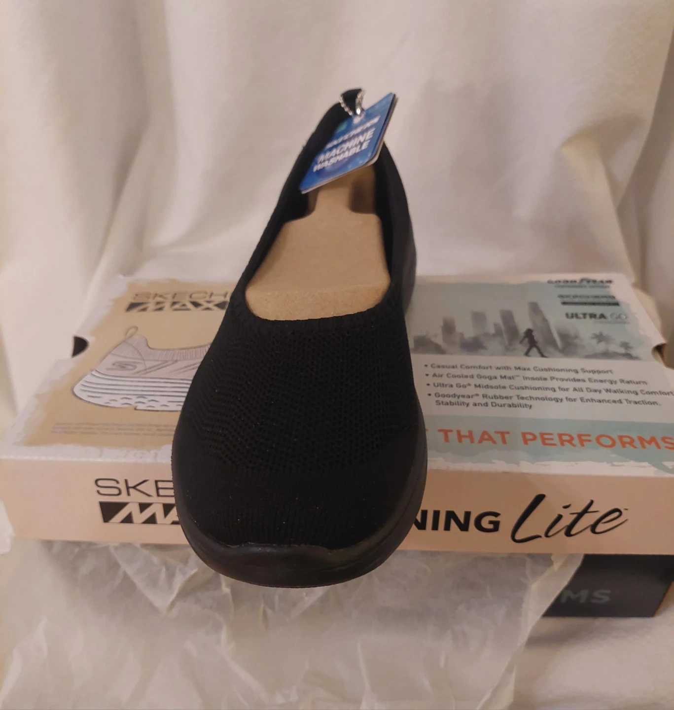 These Skechers Max Cushioning Lite shoes in black are a women's size 10. They feature Goodyear Performance Outsoles and Natural Rocker Technology for enhanced stability and durability. The box is included! New. Only tried them on once. All packeging is present.