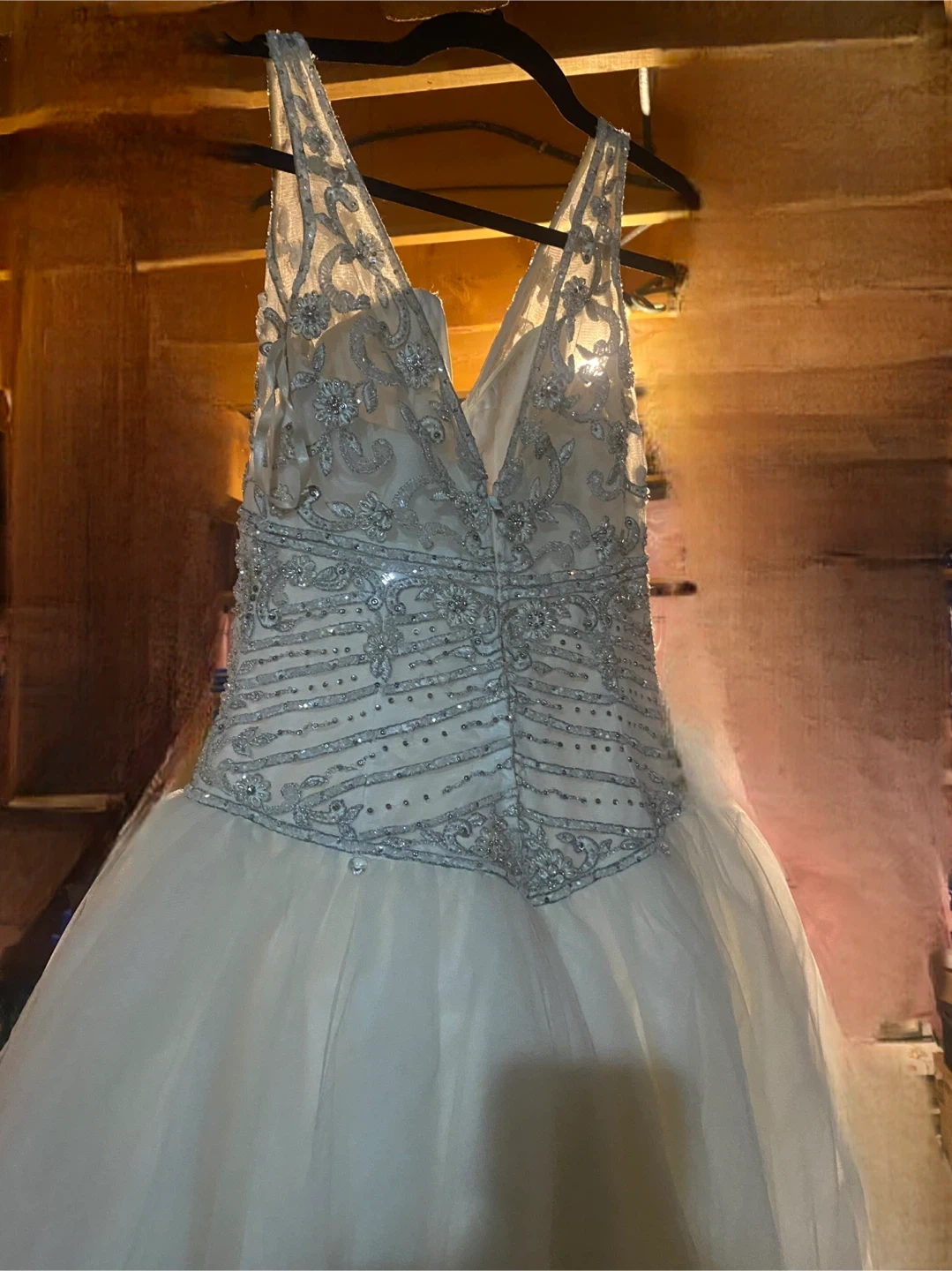 Beautiful white wedding dress with delicate silver detailing. It features a V-neck and a full skirt. Perfect for your special day! Comes with a long and short veil.