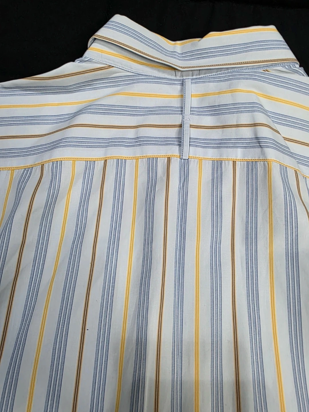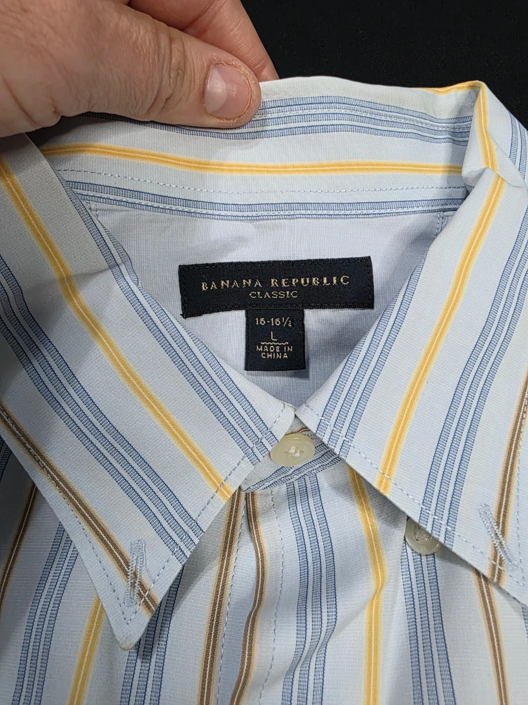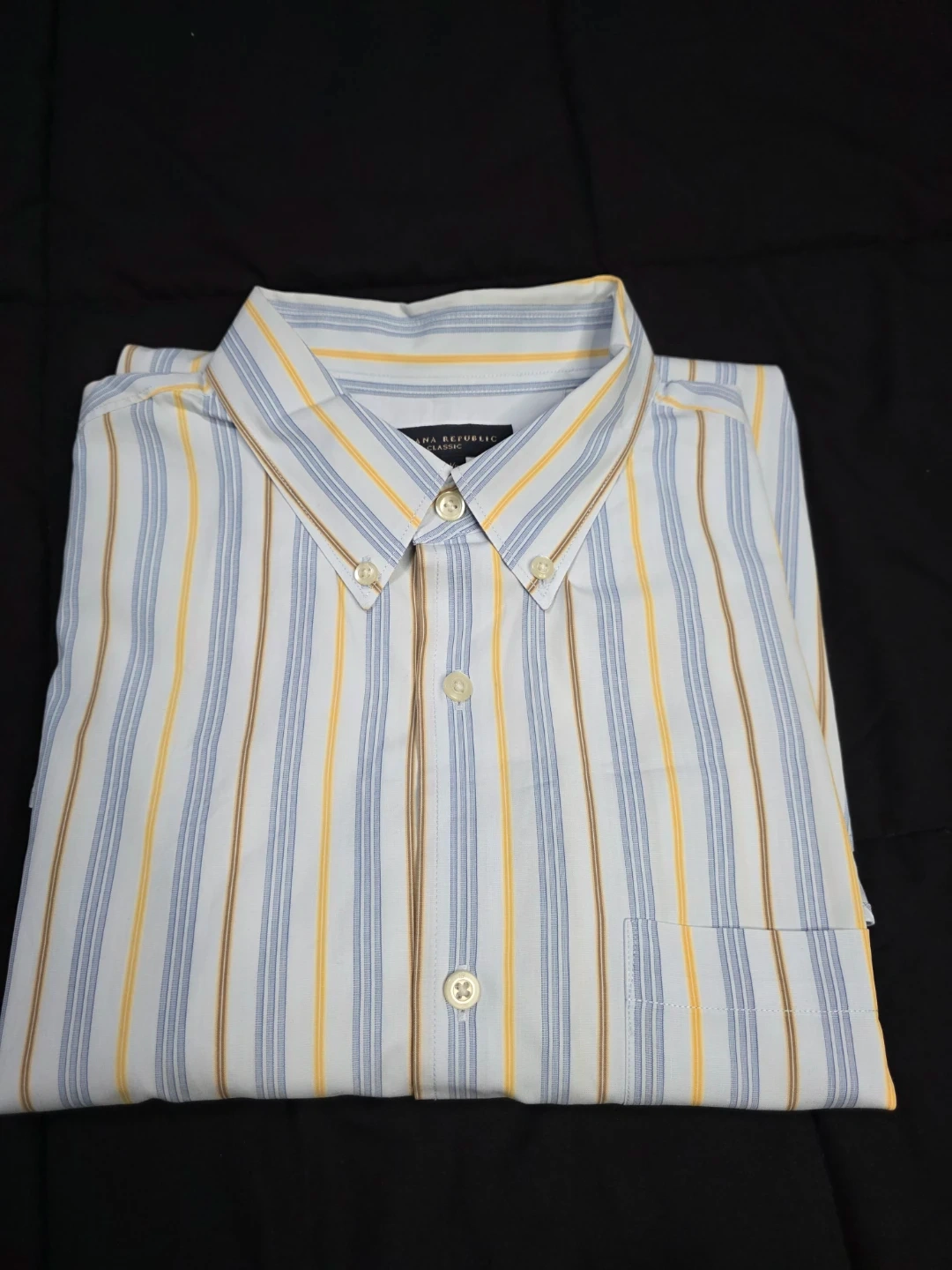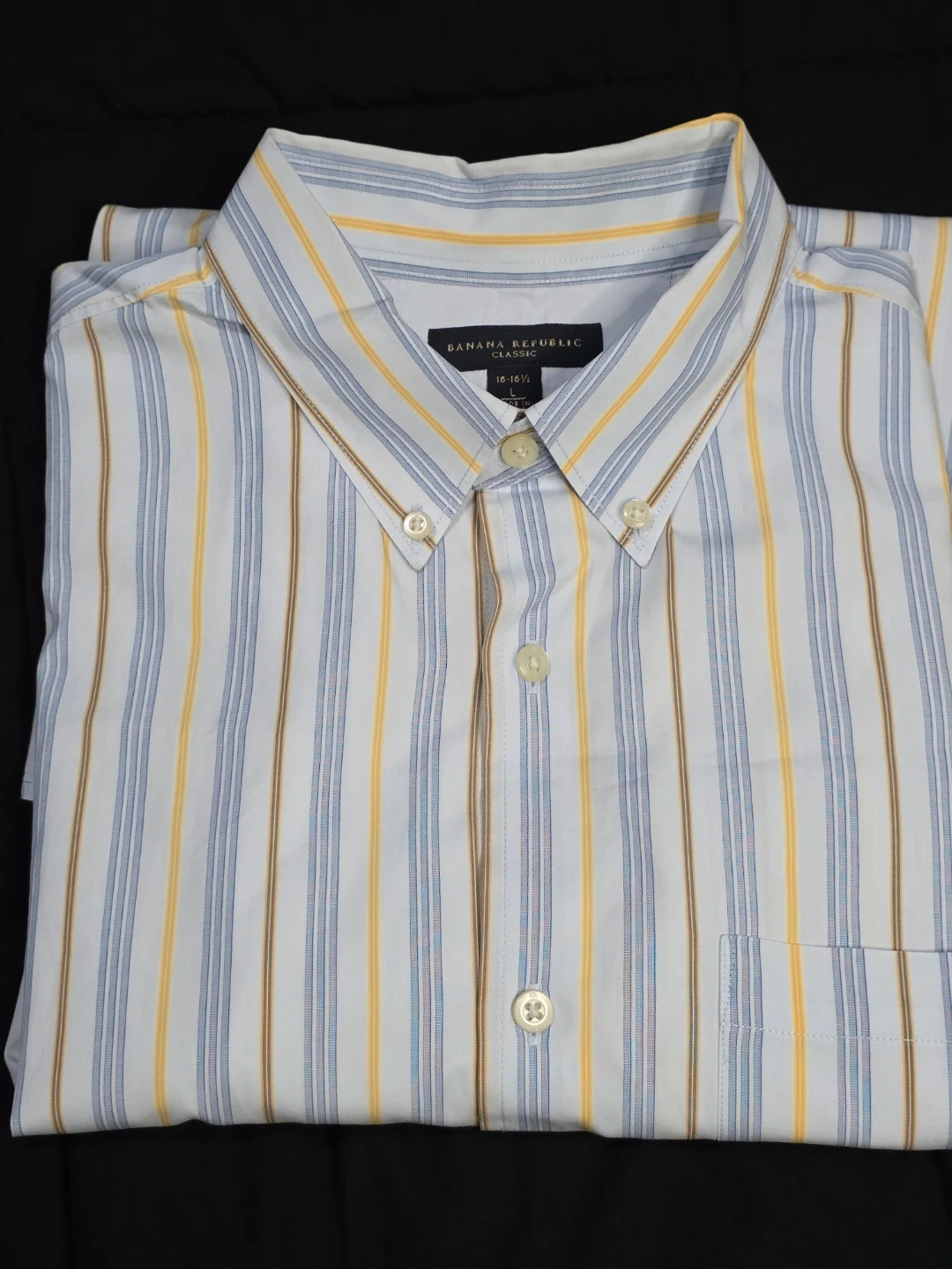 Here's a Banana Republic Classic shirt up for grabs! It features a stylish striped pattern in shades of blue, yellow, and brown. The size is 16-16½.
