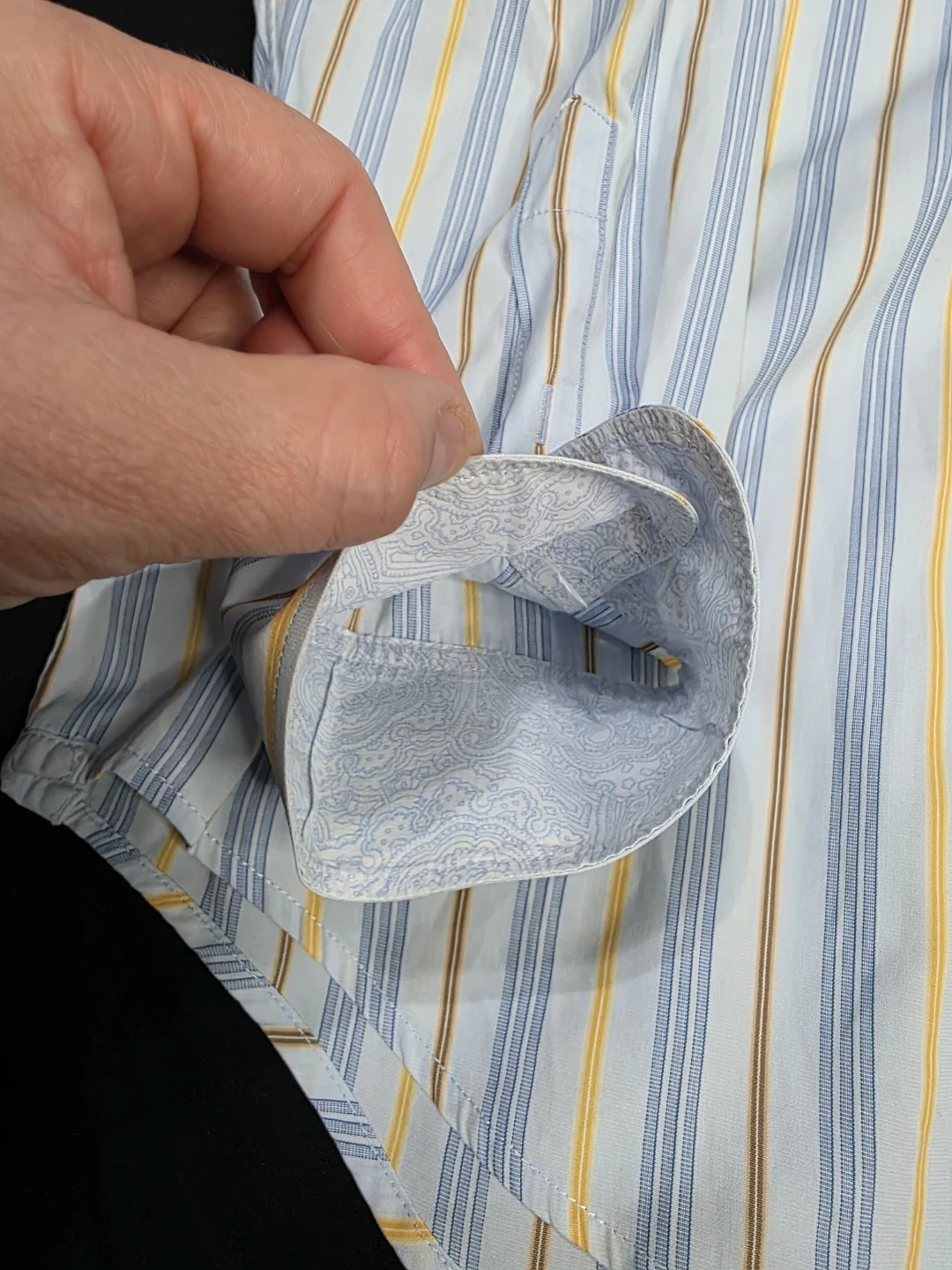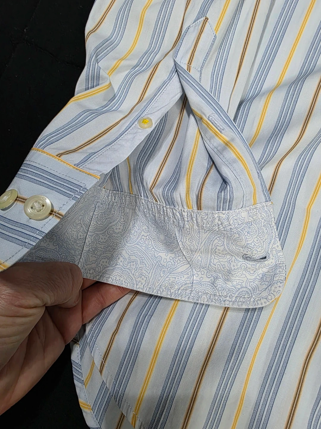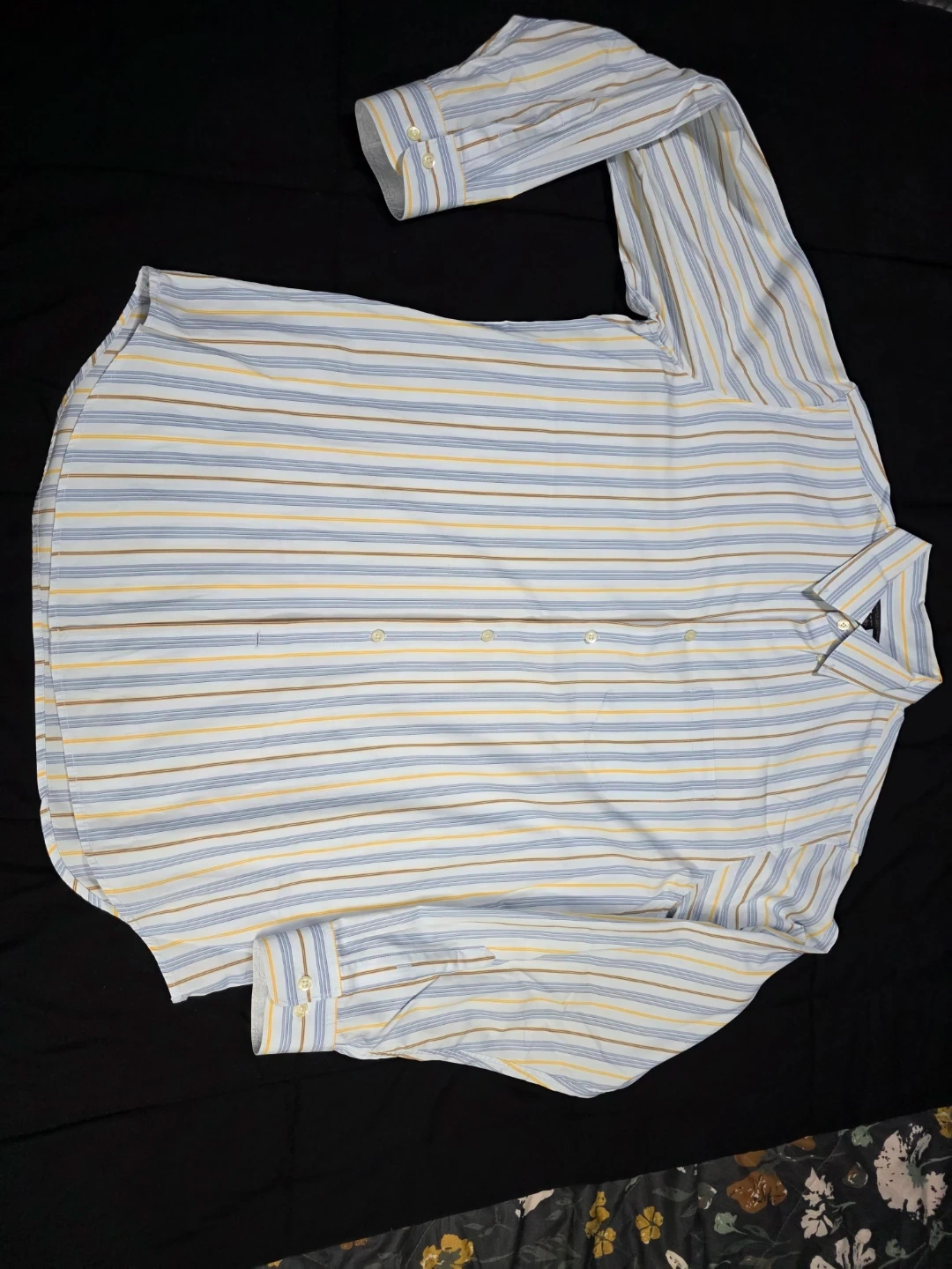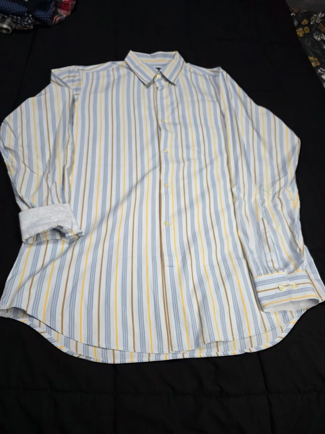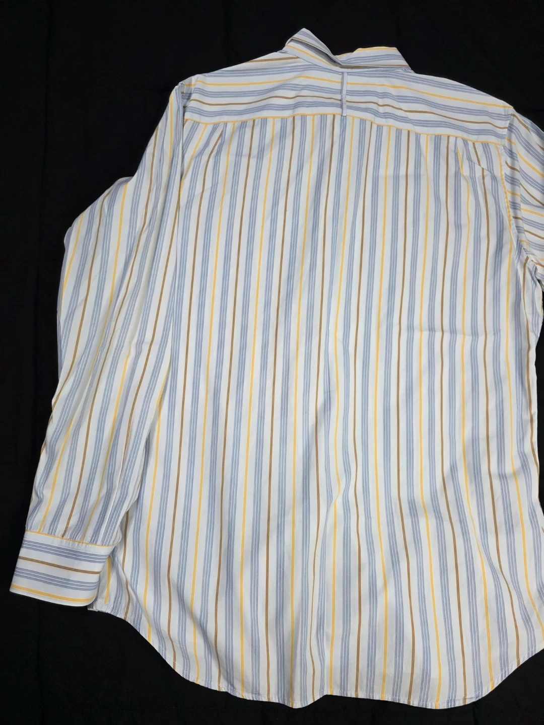 Here's a Banana Republic Classic shirt up for grabs! It features a stylish striped pattern in shades of blue, yellow, and brown. The size is 16-16½.