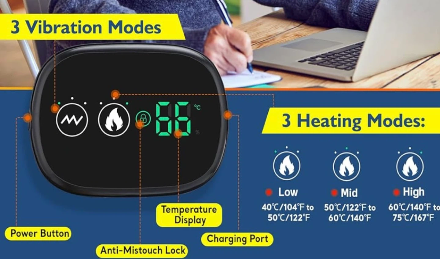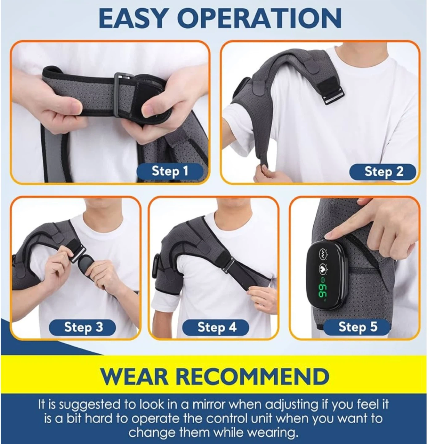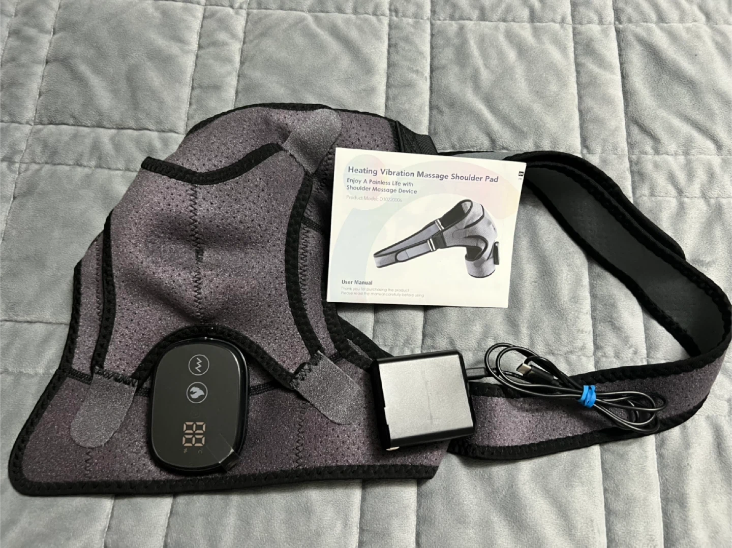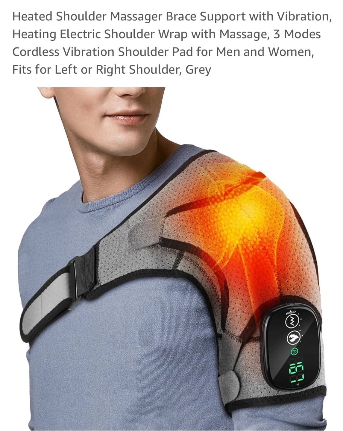 This is a grey heated shoulder massager brace that provides with 3 vibration & 3 heating settings. It is designed to fit either the left or right shoulder.