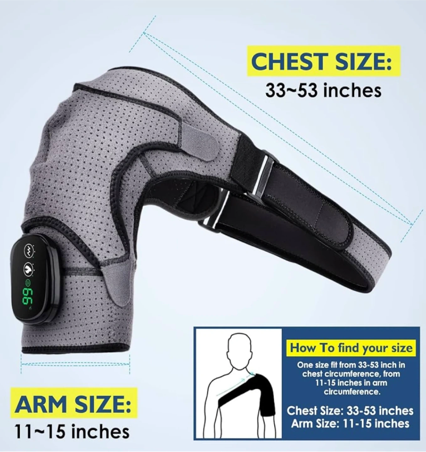 Fits chest sizes from 33-53 inches & arm sizes from 11-15 inches.