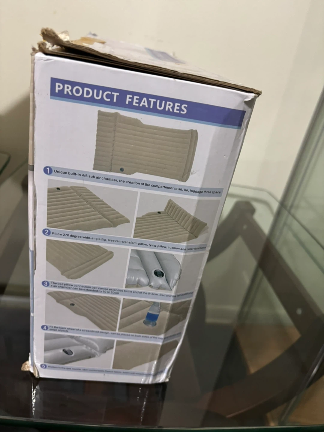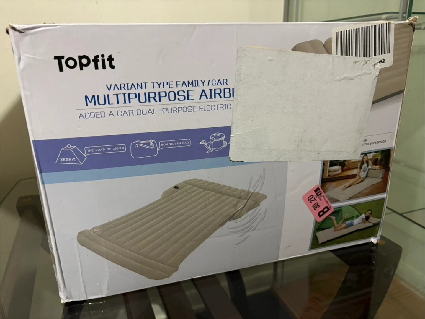 Selling a Topfit variant type family/car multipurpose airbed! It's a dual-purpose electric air mattress, perfect for travel and camping. The box shows some wear, but the airbed itself is in great condition. Features include a unique built-in 4/6 sub air chamber and a pillow with a 270-degree wide-angle flip. The load capacity is 260kg