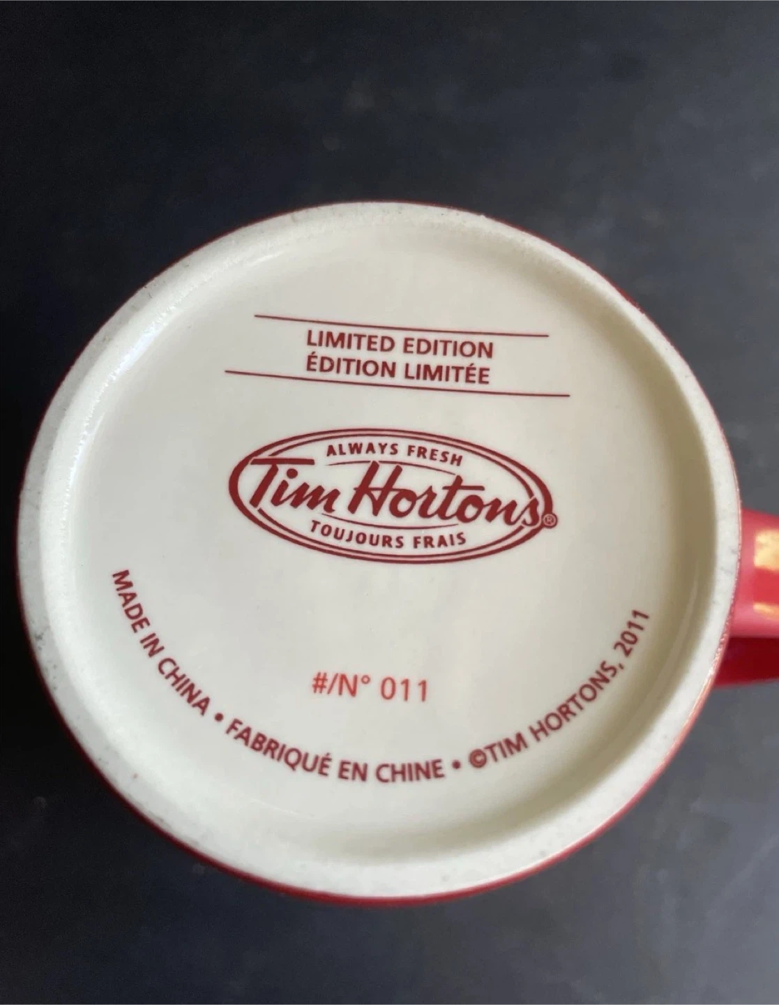 This mug is in good condition and features a charming design, perfect for collectors or Tim Hortons enthusiasts. The mug is a limited edition from 2011.
