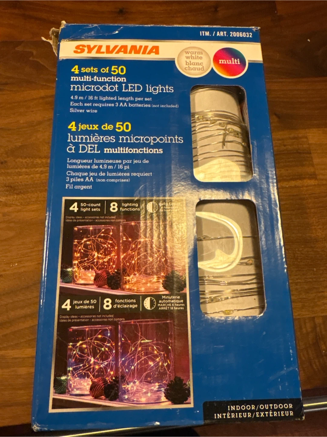 Selling a box of Christmas lights. Sylvania multi-function microdot LED lights. There are 4 sets of 50 lights. Each set has a 4.9 m/16 ft lighted length and requires 3 AA batteries (not included). They have silver wire and can be used indoor or outdoor. The box includes 8 lighting functions and an auto timer!
