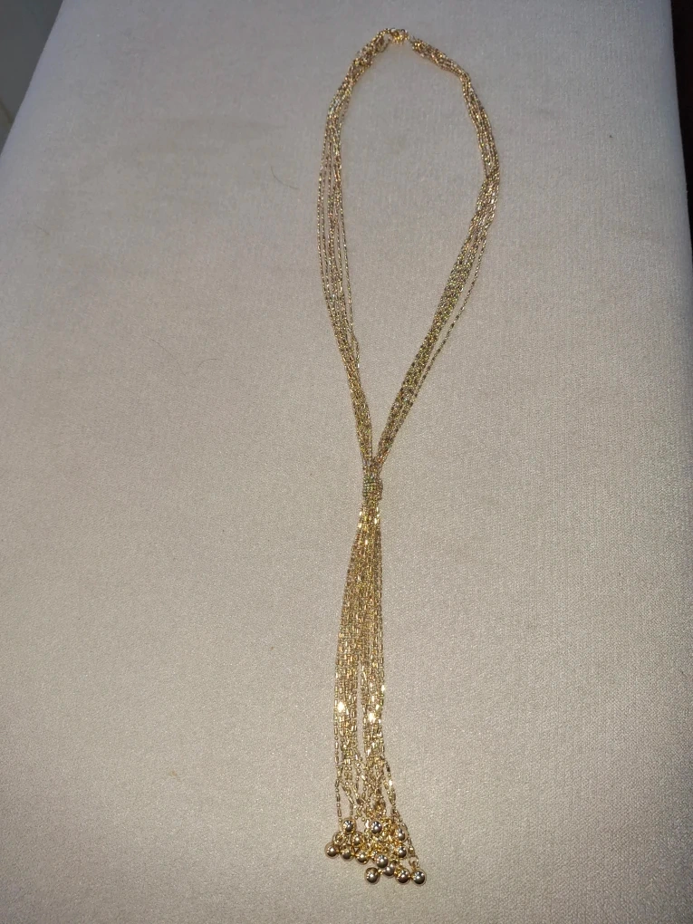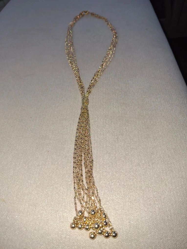 Selling a beautiful gold-tone multi-strand necklace! This piece features a unique tassel design. It's perfect for adding a touch of elegance to any outfit