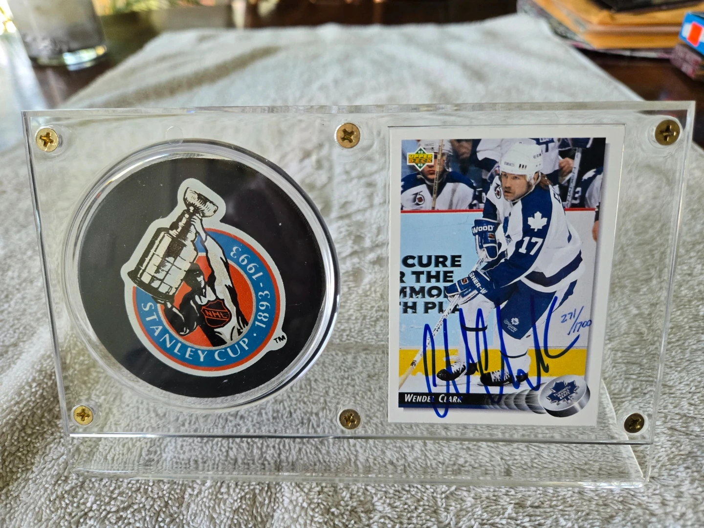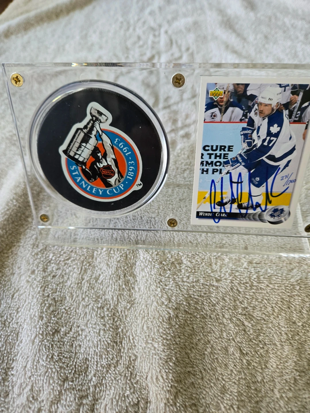 Selling Autographed Wendel Clark, Authentic, Limited Edition (271 of 1700) Card with Official Game Puck. Includes certificate of authenticity and is in its original crystal clear display holder.