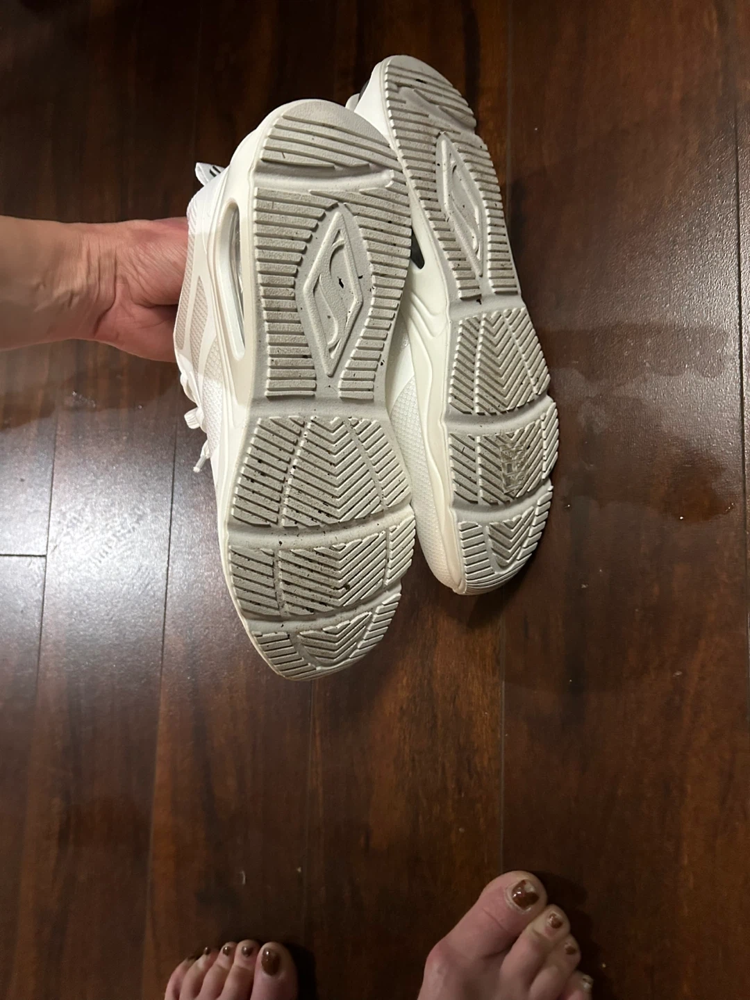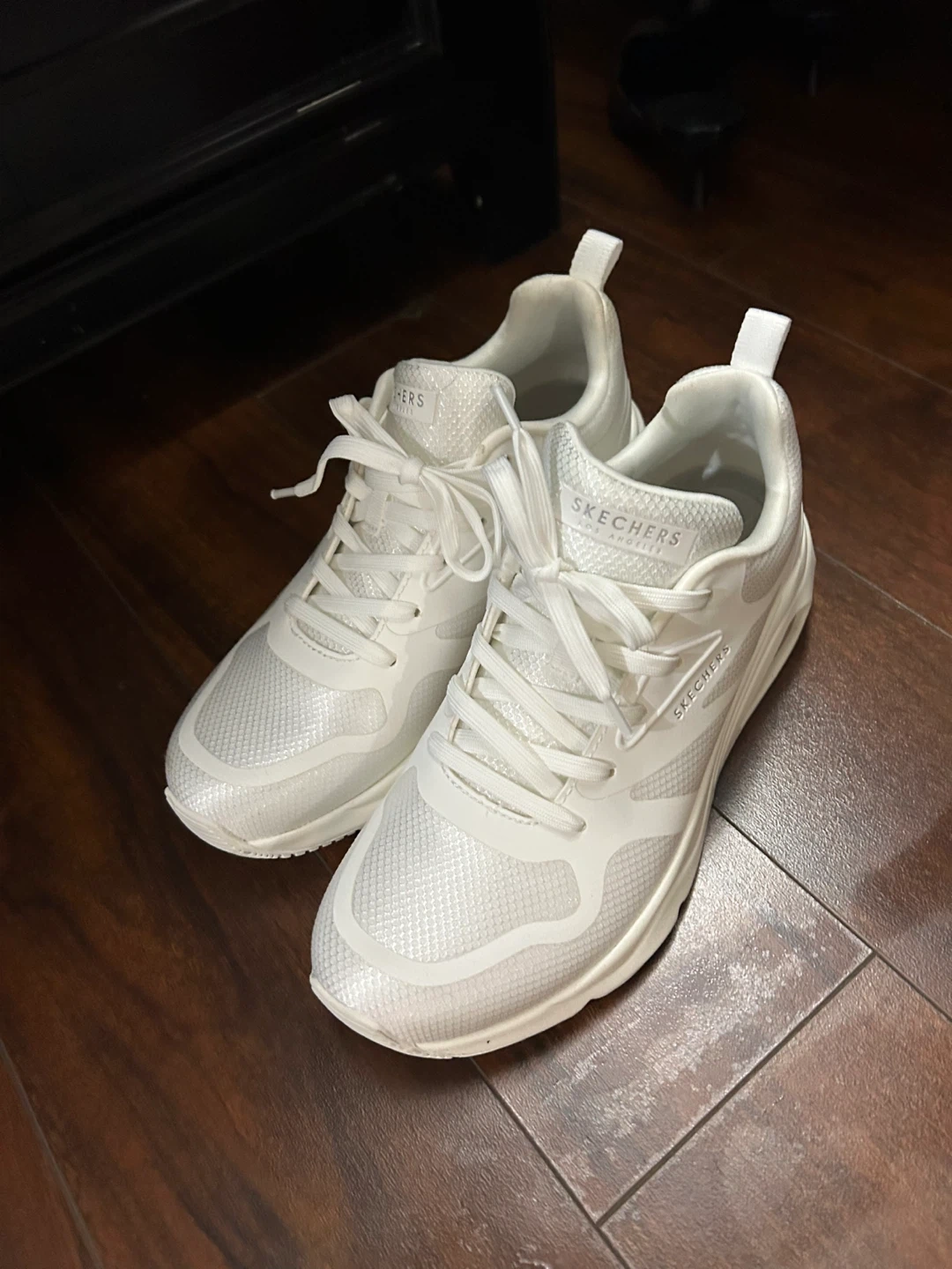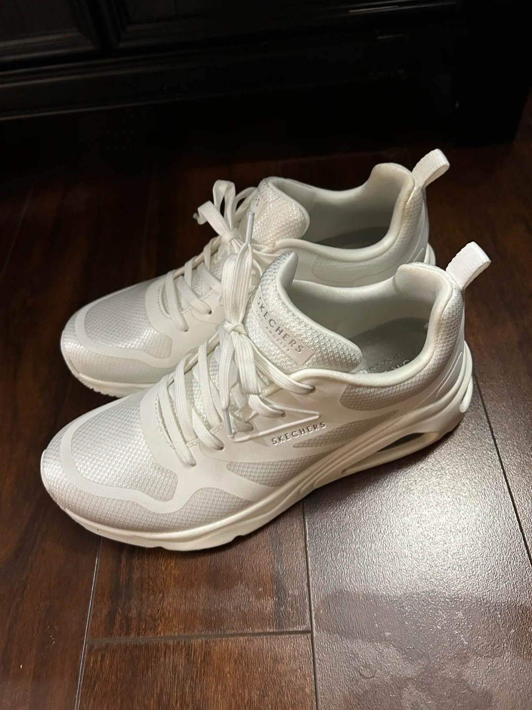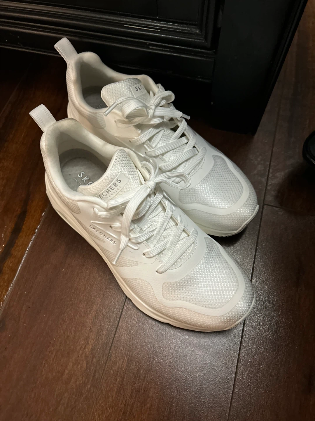 Selling a pair of Skechers women's lace-up sneakers in white. They're in great shape and super comfy for everyday wear!