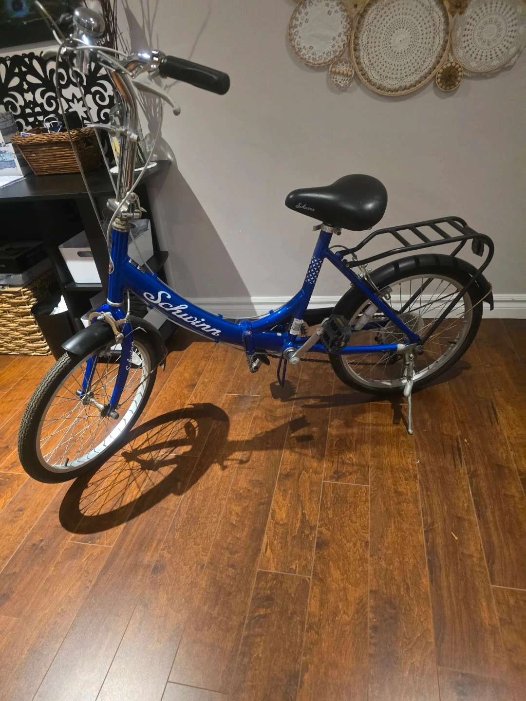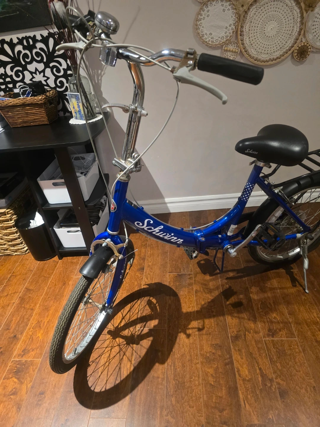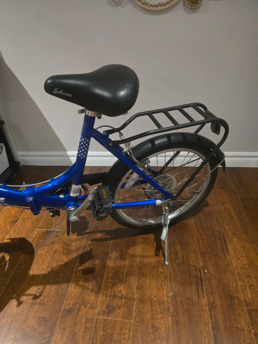 Selling a Schwinn folding bike in blue. It's in good condition and perfect for commuting or recreational rides. Folds up easily for storage or transport!