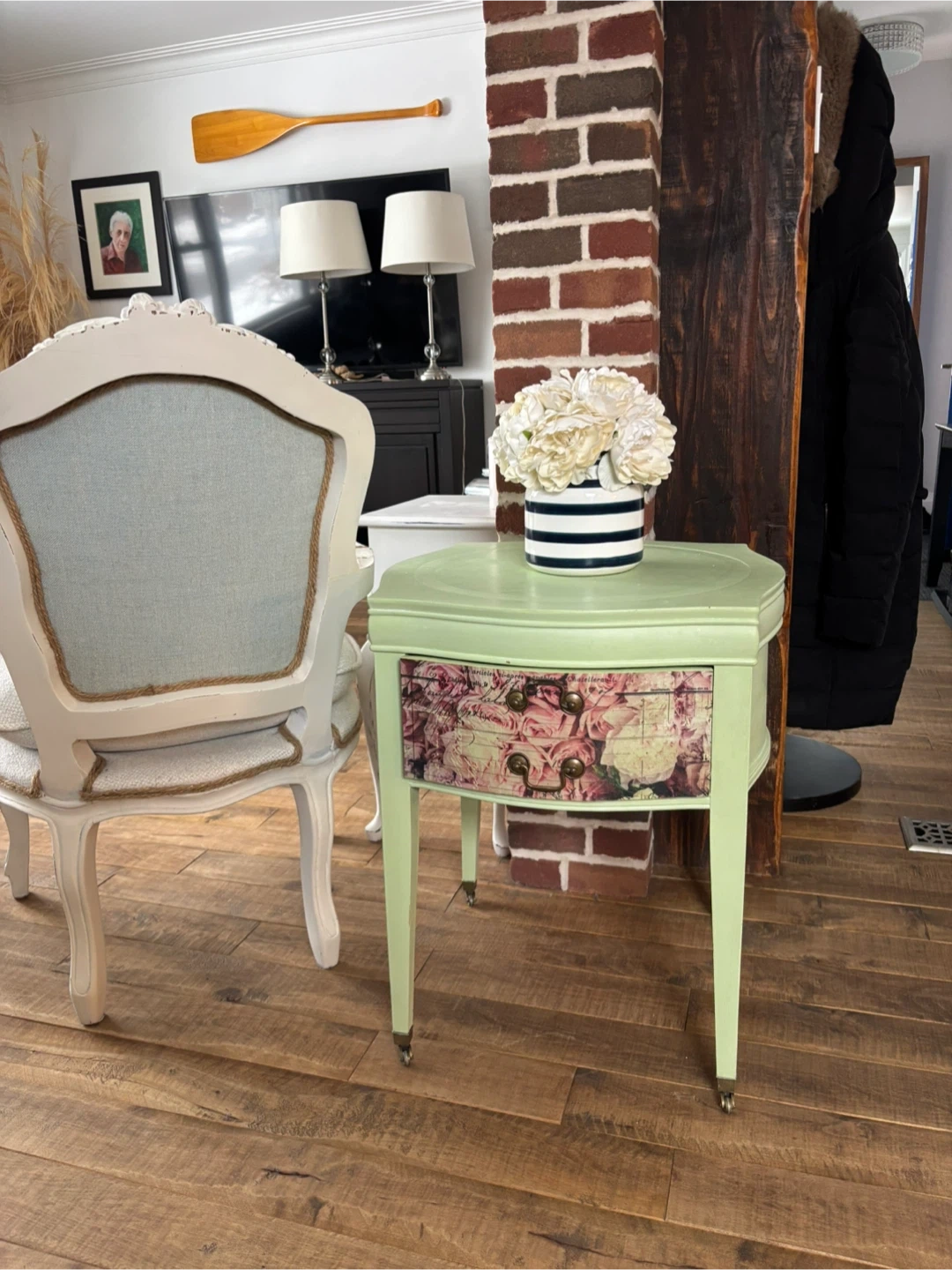 Selling a cute accent table! It's painted a lovely light green and has a unique floral design on the drawer. It would be a great addition to any room as a side table or nightstand