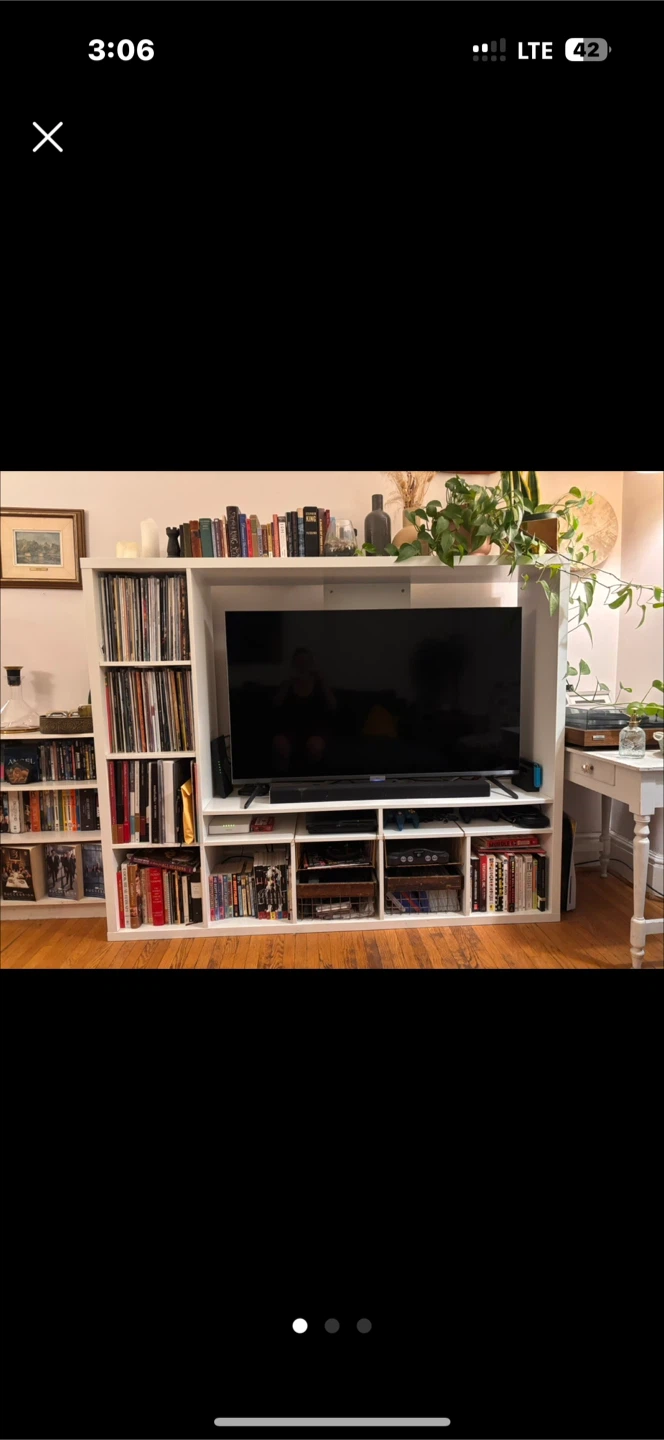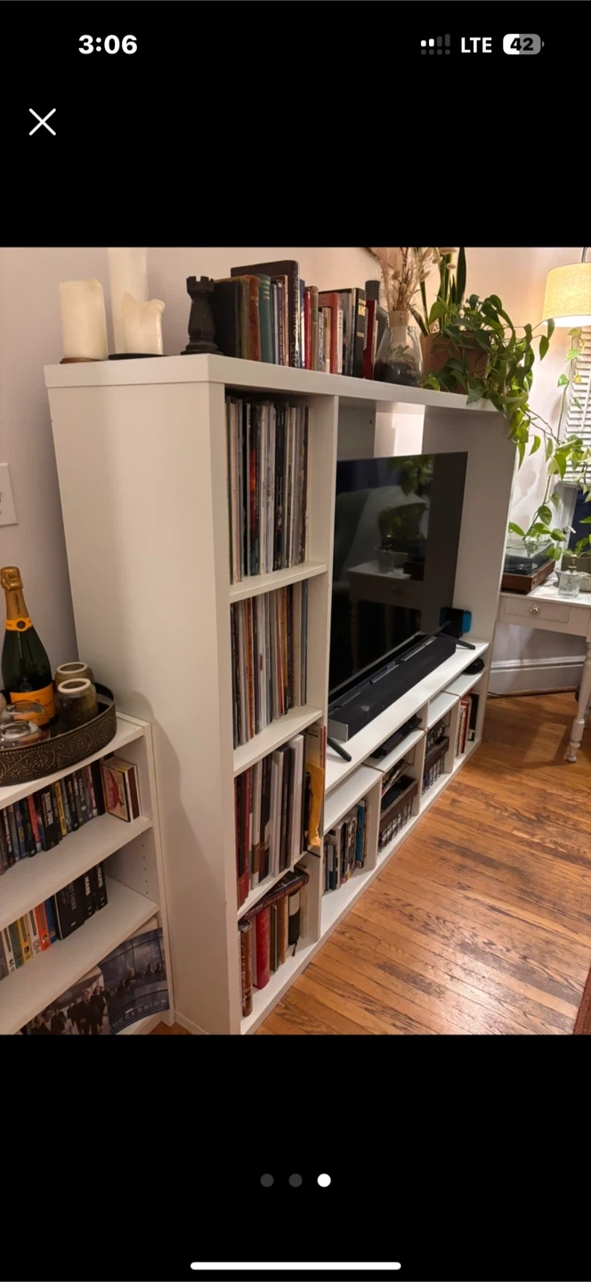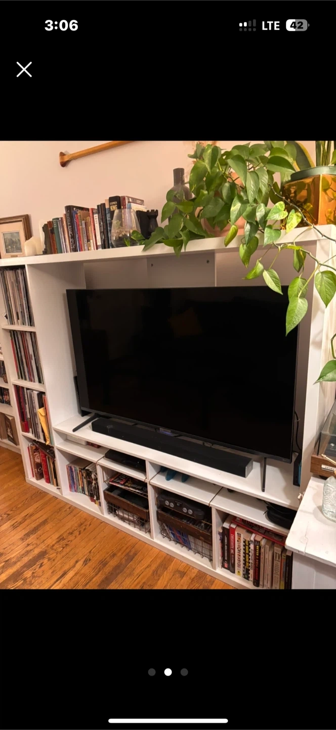 Selling a white TV stand with built-in bookshelves! It's in great condition and perfect for organizing your media and books. A great addition to any living room or entertainment space!