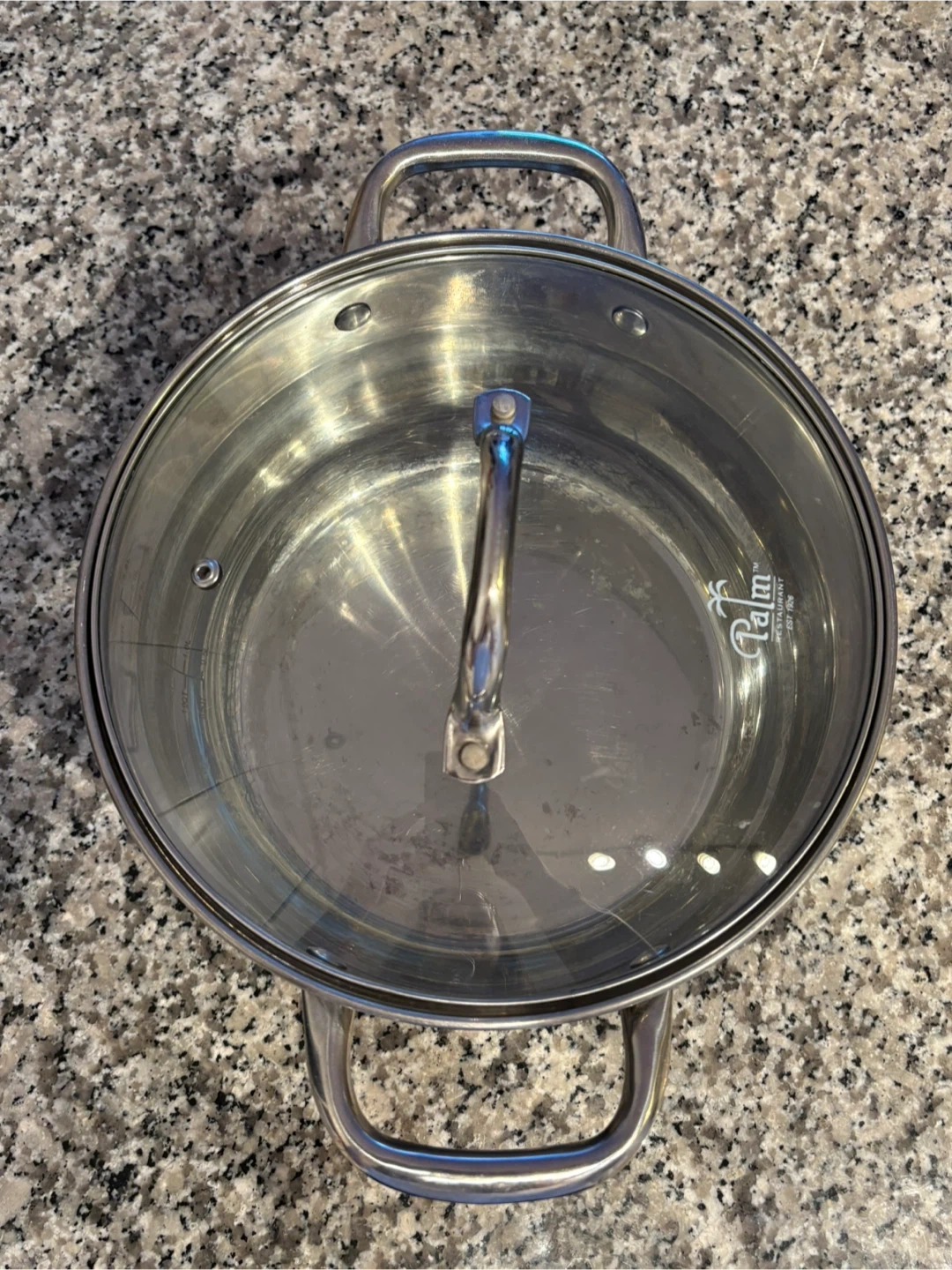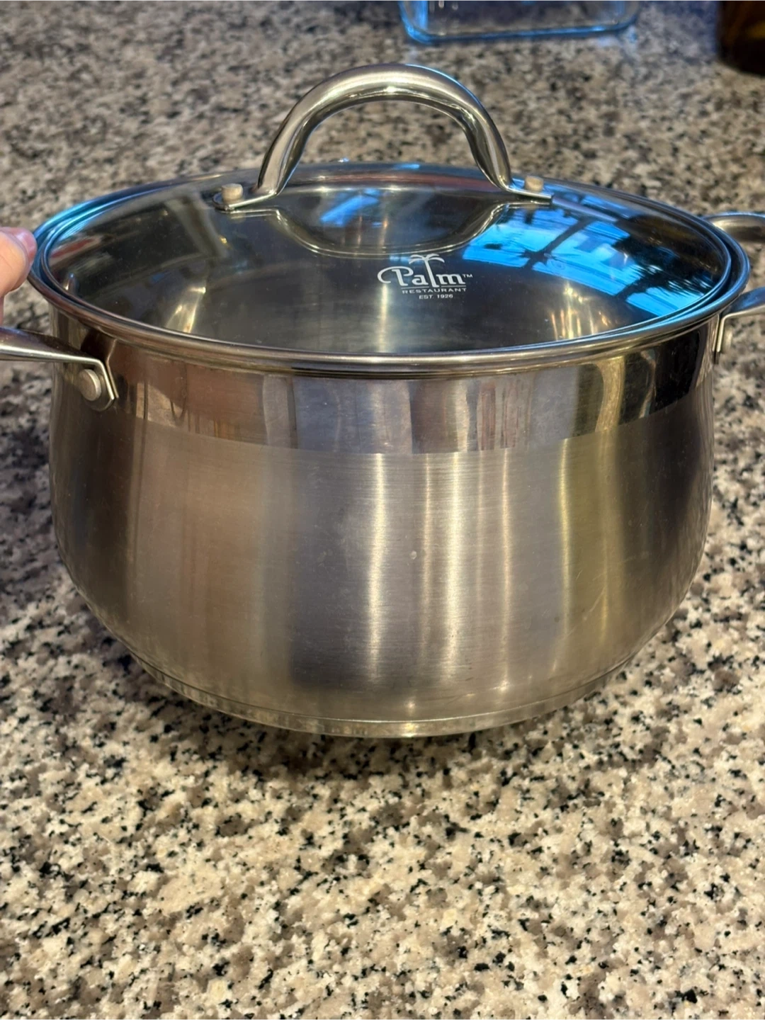 Selling a Palm Restaurant stainless steel stock pot with a glass lid. It has a capacity of 5.5 quarts. Perfect for making soups, stews, or stocks!