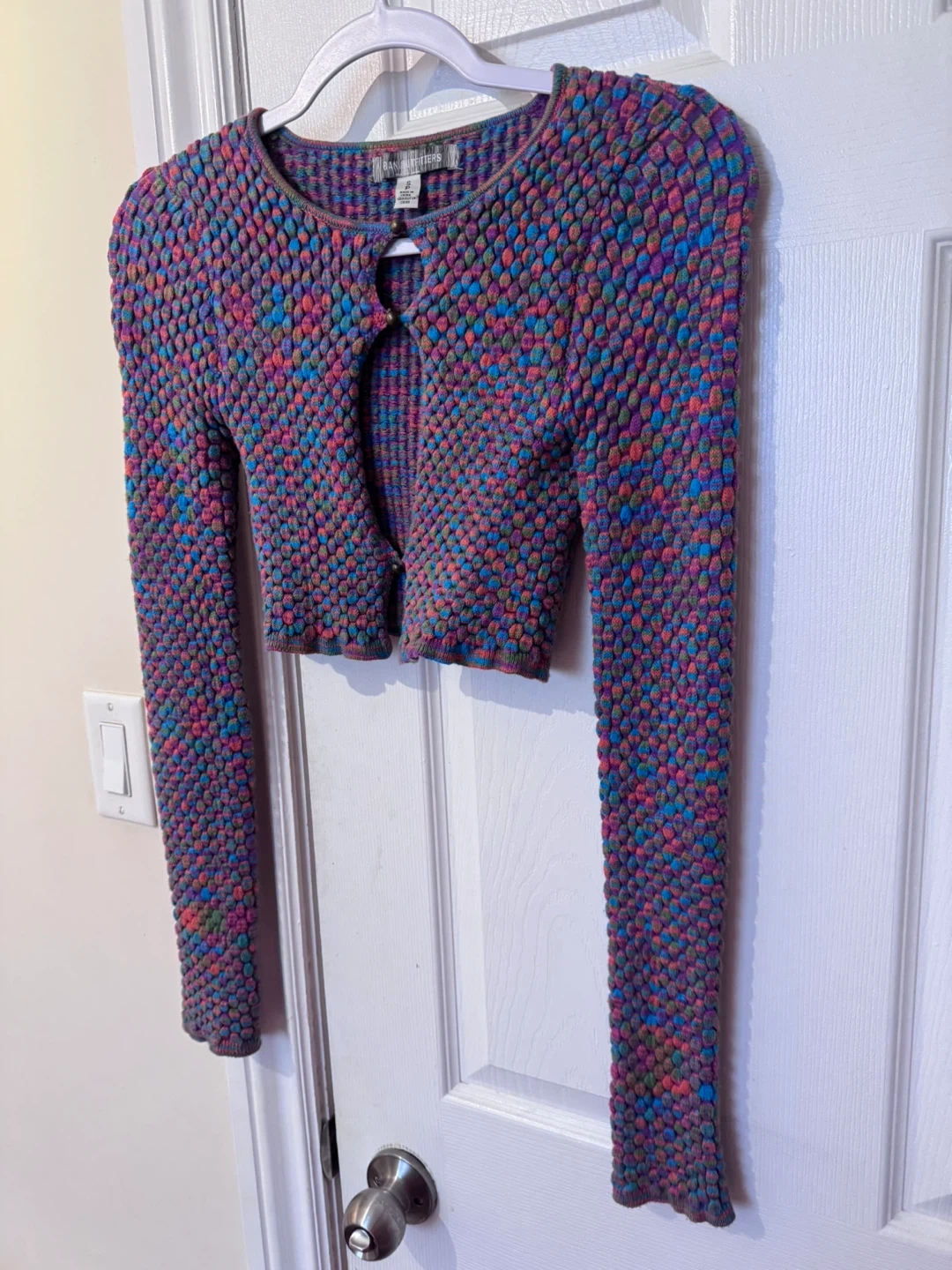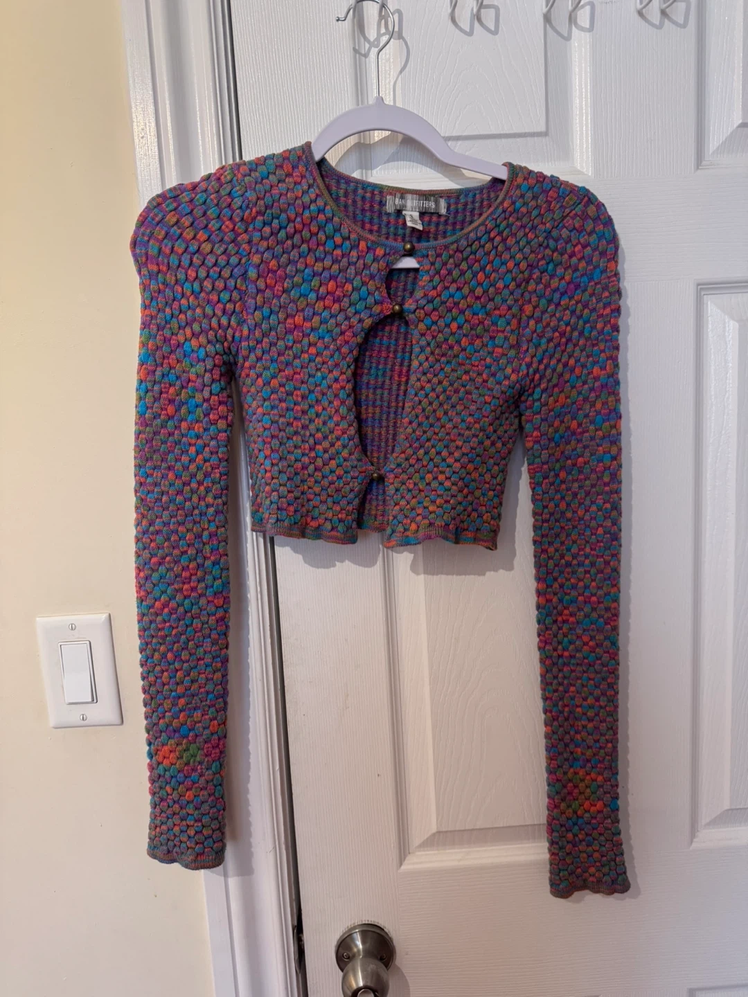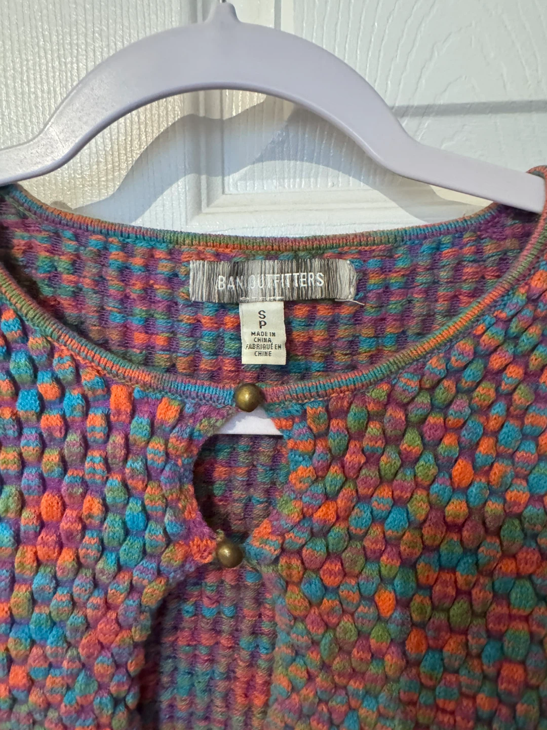 Selling a colourful cardigan from Urban Outfitters! It's a size small and in great condition. The material is soft and comfortable, perfect for layering. It’s cropped!