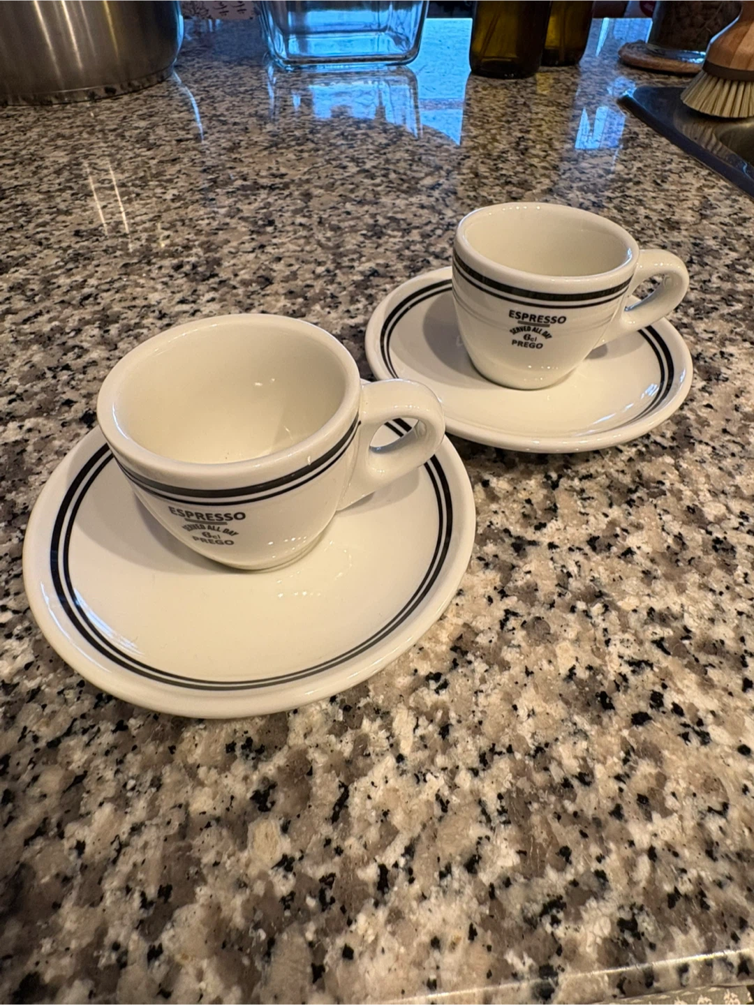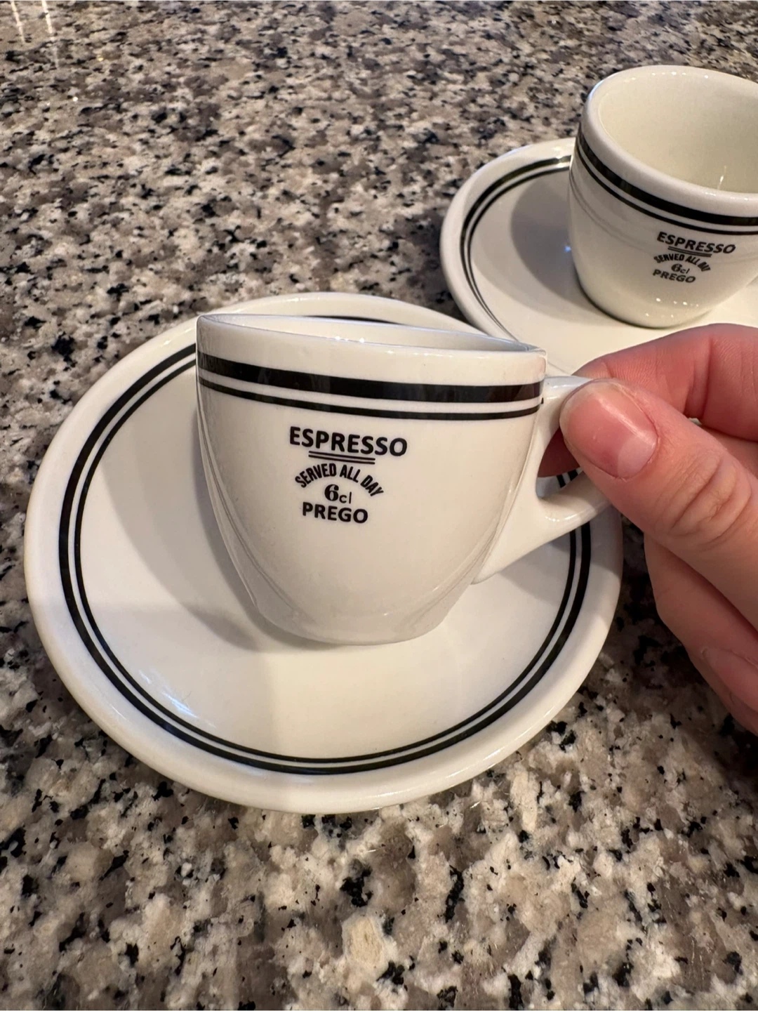 Selling a cute espresso cup and saucer set! These are white with a black stripe design. The cups say 'Espresso Served All Day Prego'. Perfect for your morning espresso. Brand new with tags
