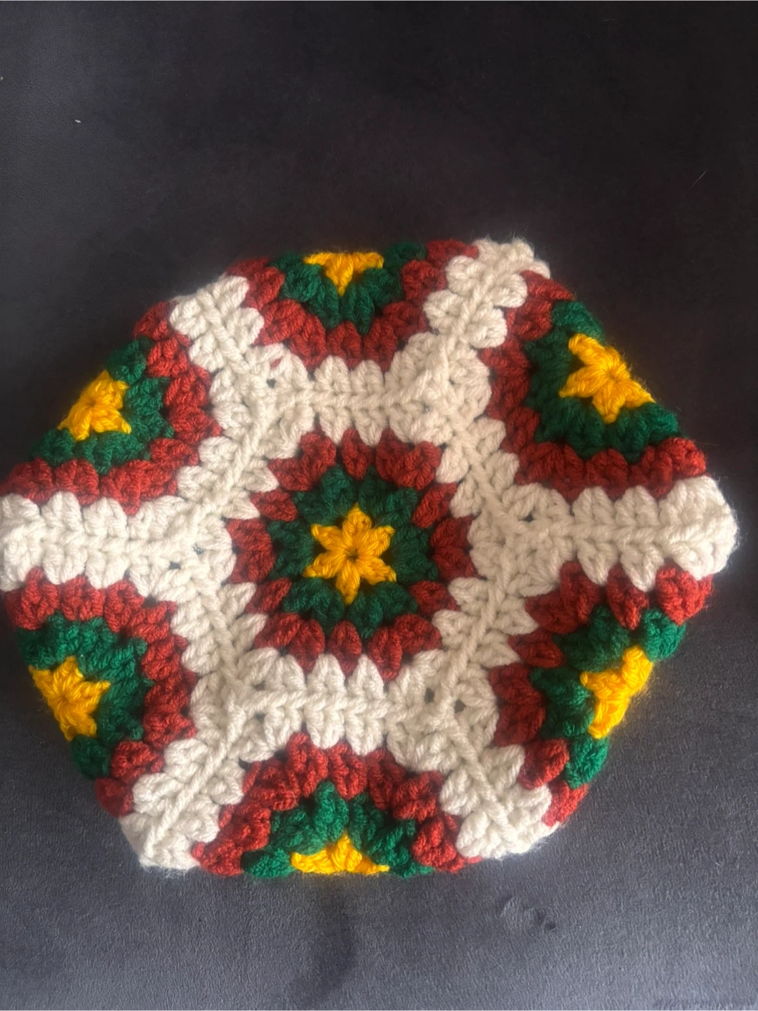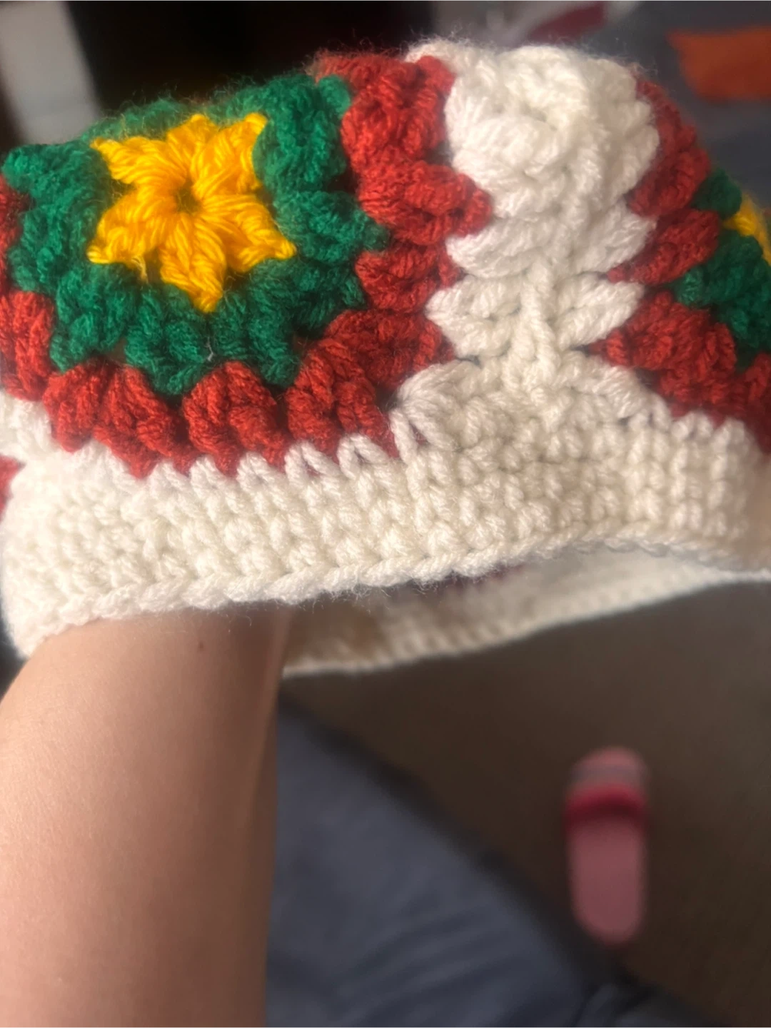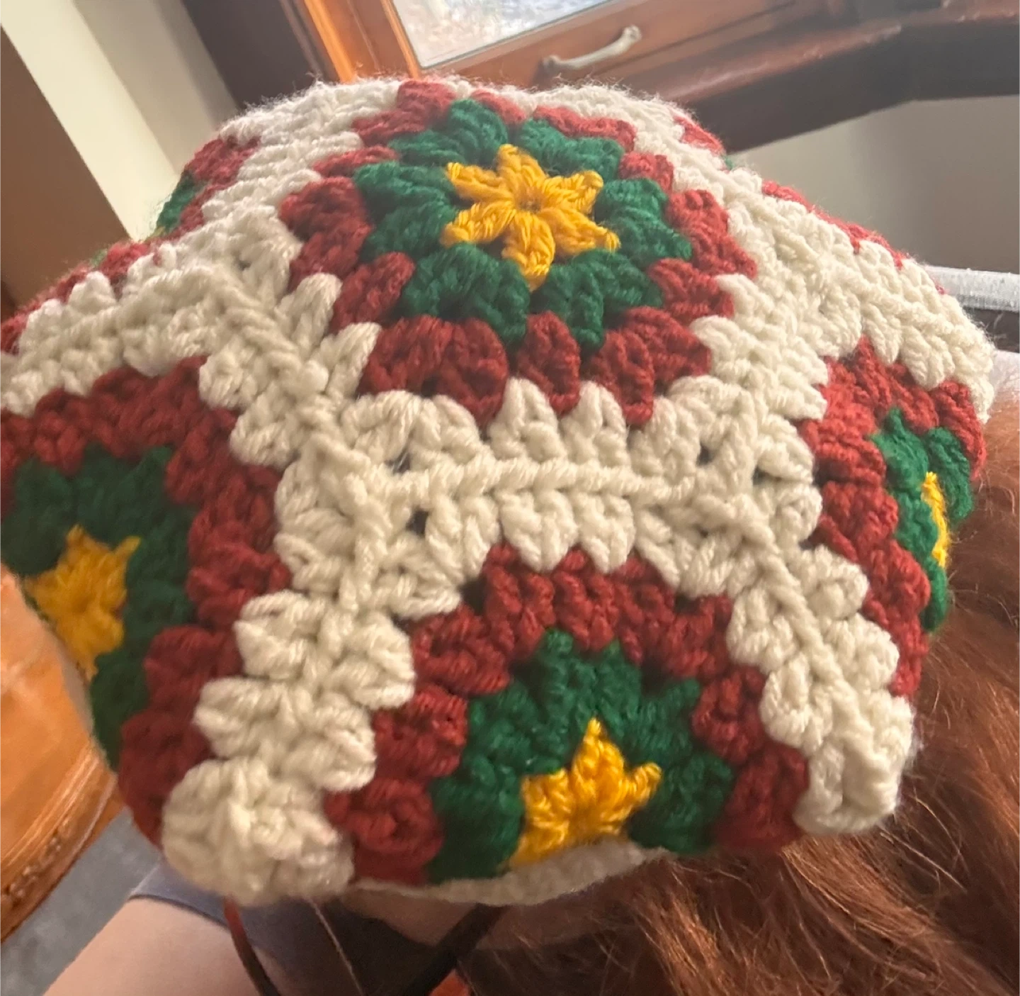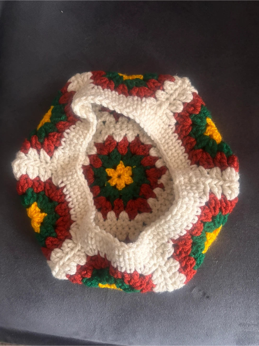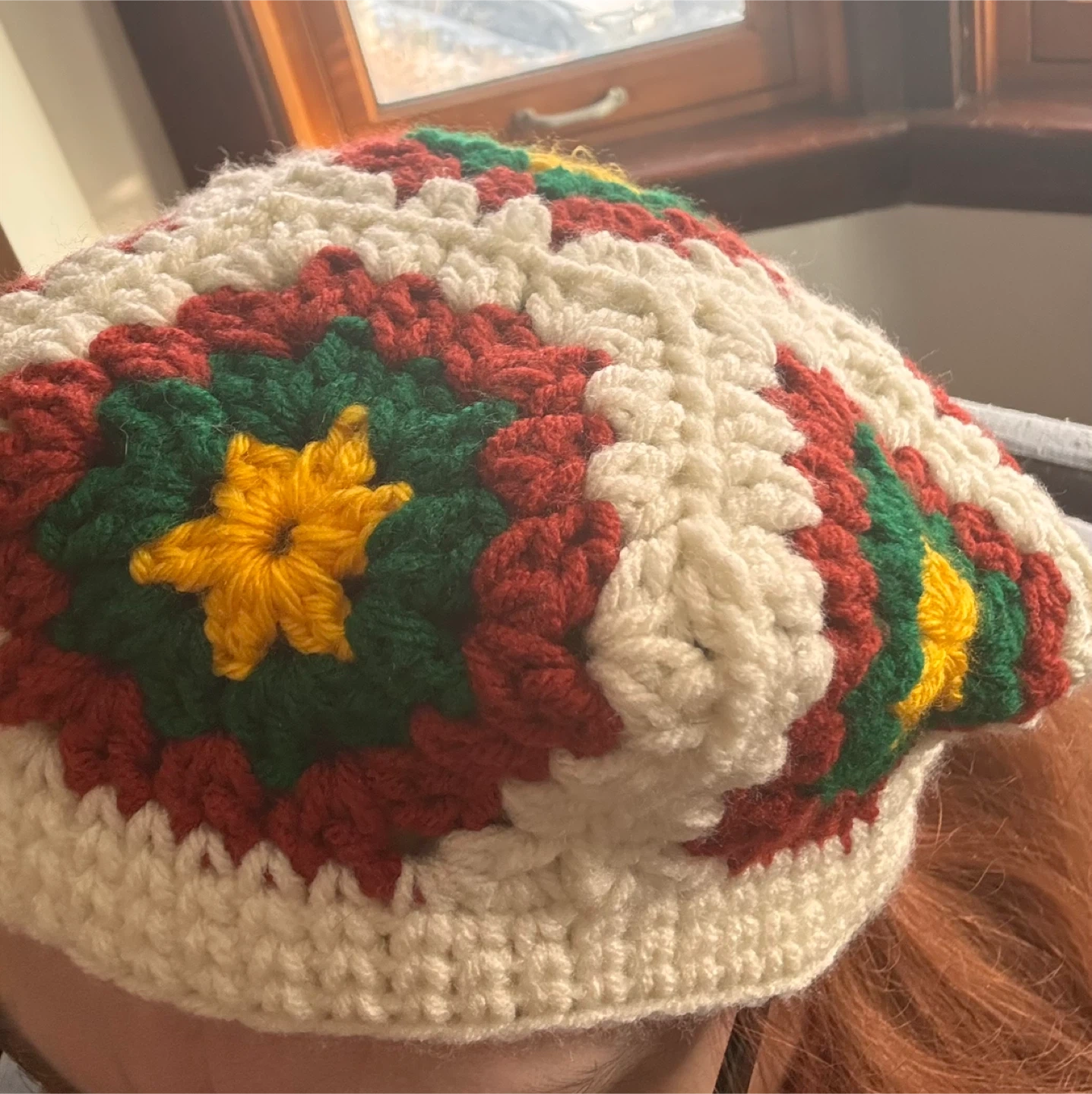 Selling a handmade crochet beanie. It features a unique design with red, green, yellow, and white colours. Perfect for adding a touch of warmth and style to your outfit!
