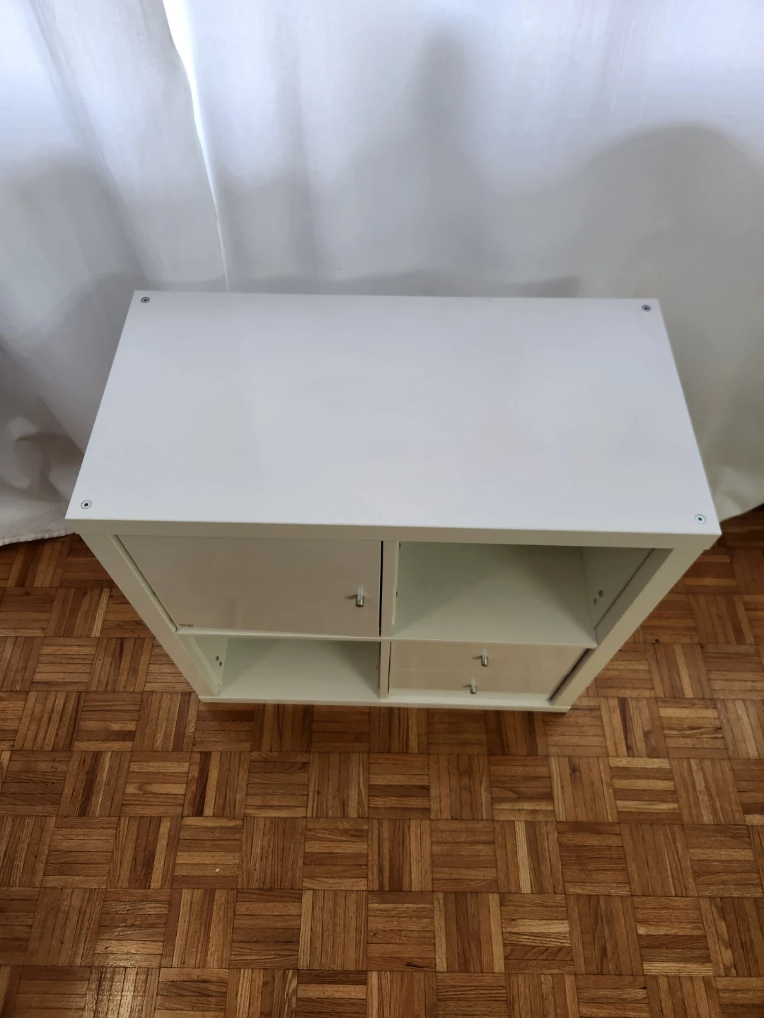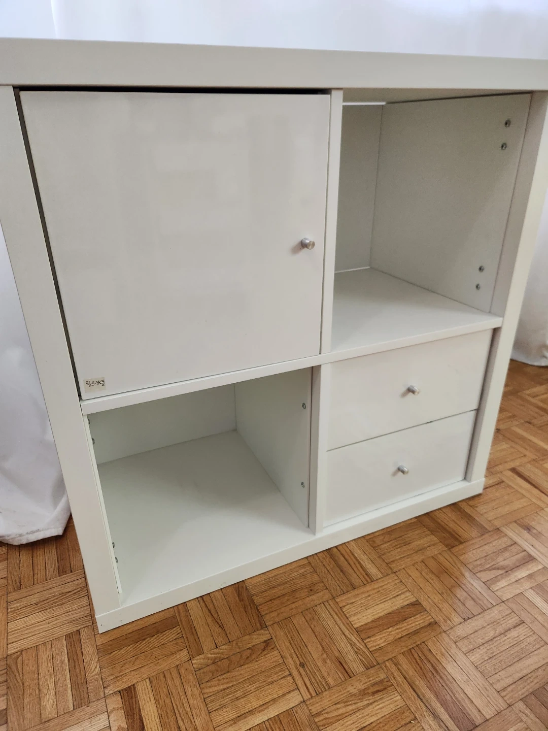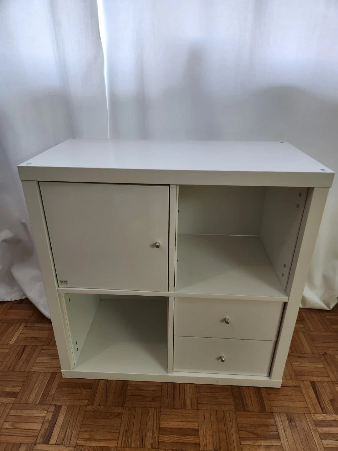 Selling a versatile IKEA Kallax shelf unit in white! It's in great shape and ready to organize your space. Perfect for storing books, toys, or displaying your favourite items. This unit features a combination of open shelves, a cabinet, and two drawers for flexible storage options