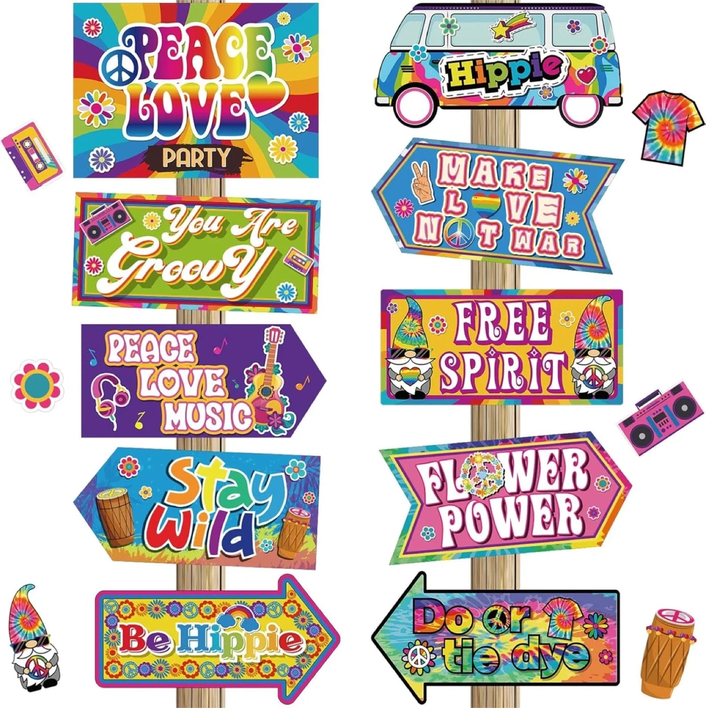 Add some groovy vibes to your next party! Featuring colourful designs and classic hippie sayings like "Peace Love," "Flower Power," and "Stay Wild," these props are sure to bring smiles and laughter to your event. Perfect for themed parties, birthdays, or any occasion that calls for a little bit of retro fun