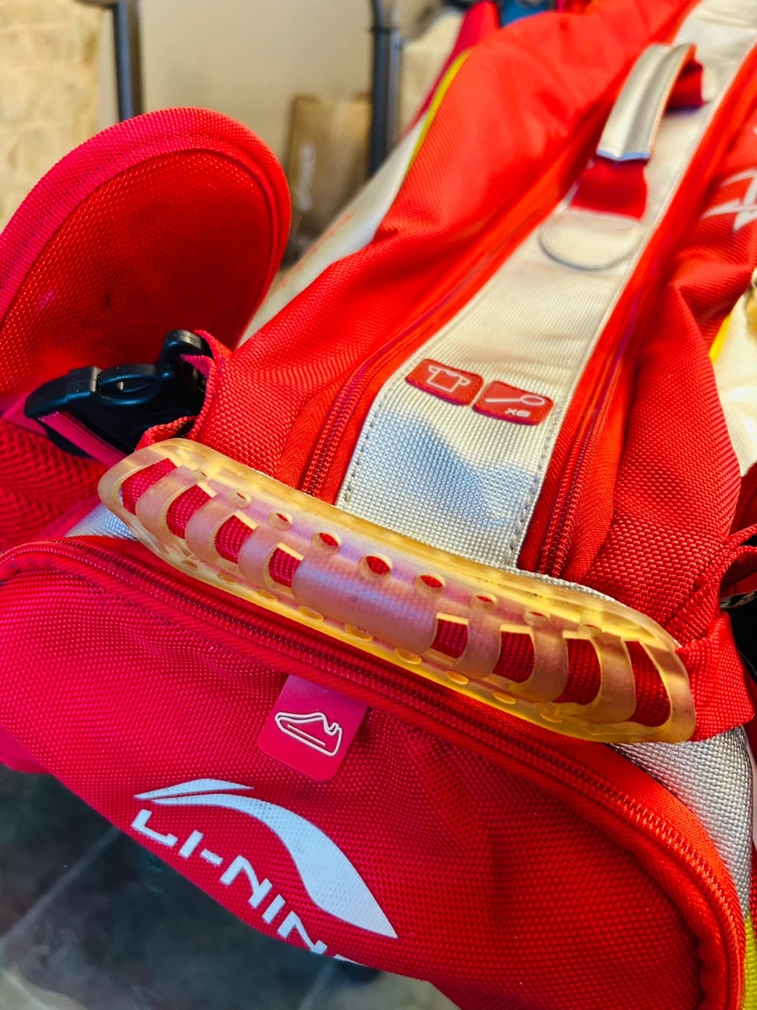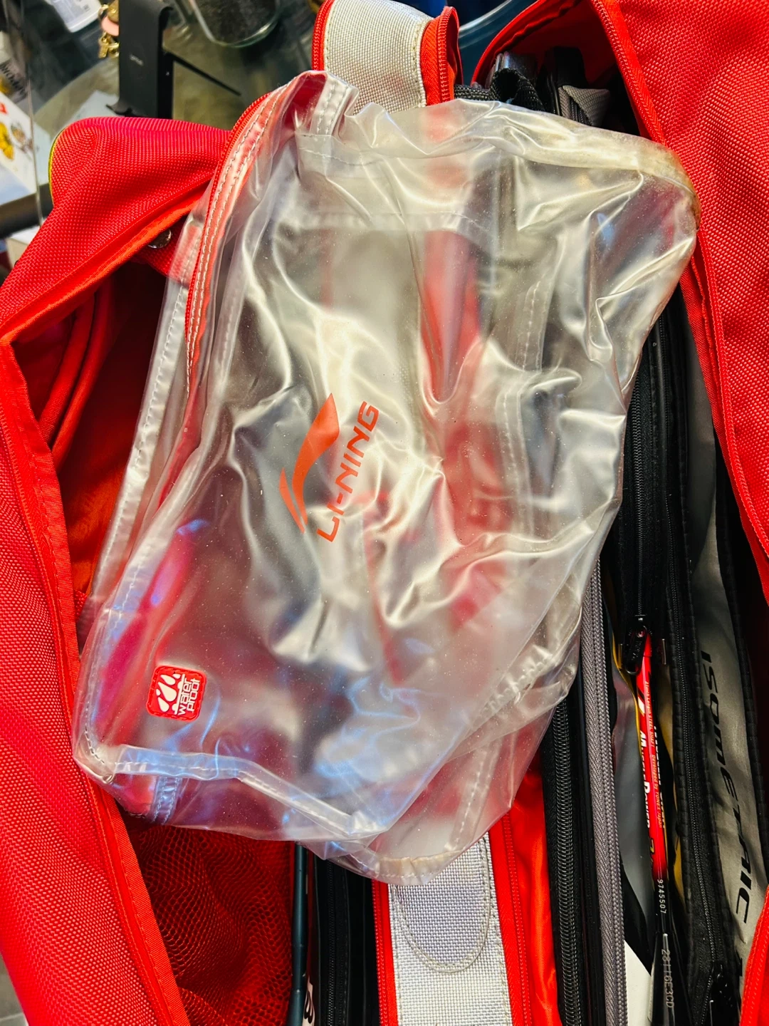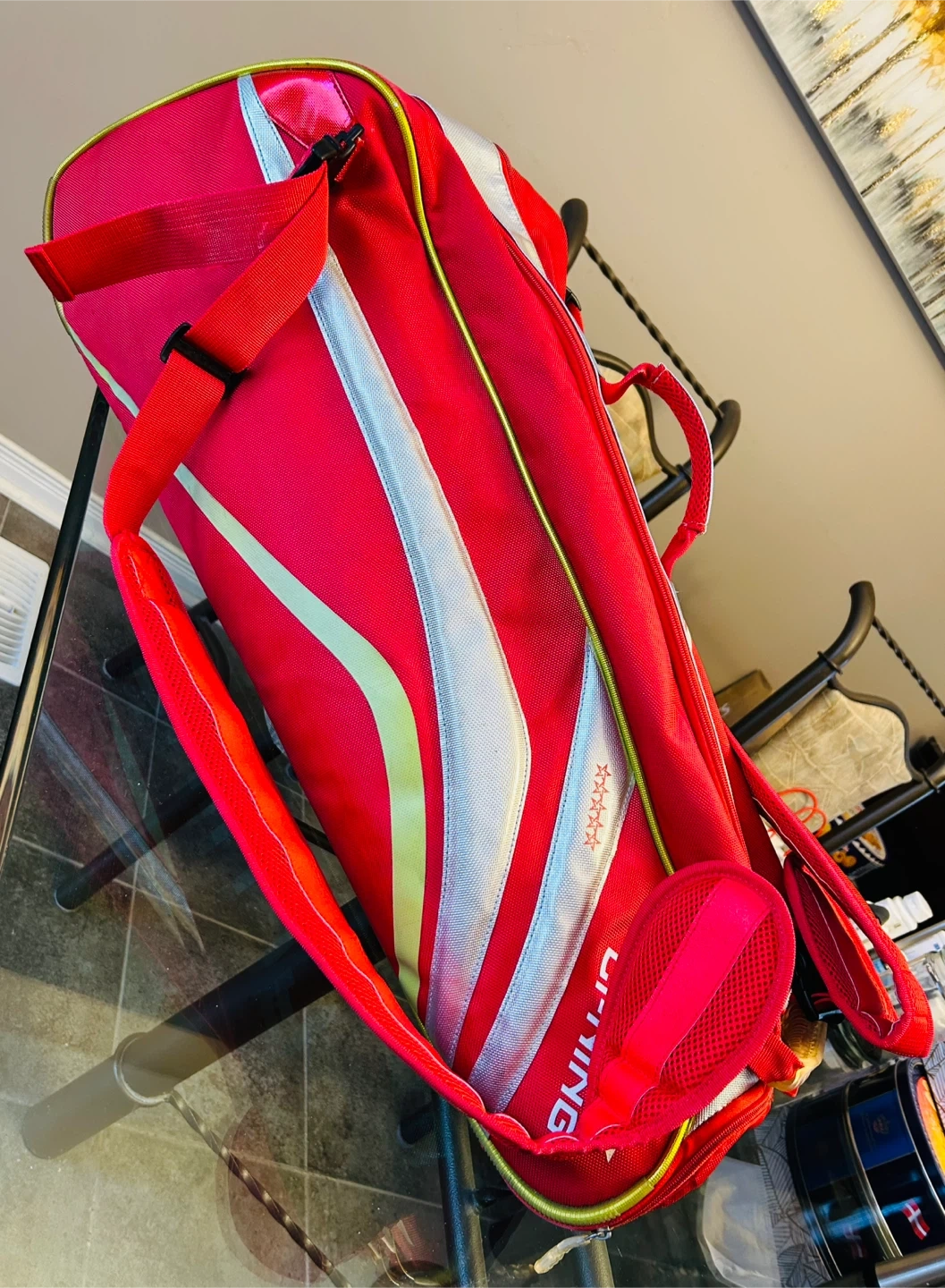 Li-Ning Premium Bag with 2 Compartments Holds up to 12 Badminton Racquets or 6 Tennis Racquets. Good Condition (Modest Wear on Bottom Front as Shown at Fig. 5)