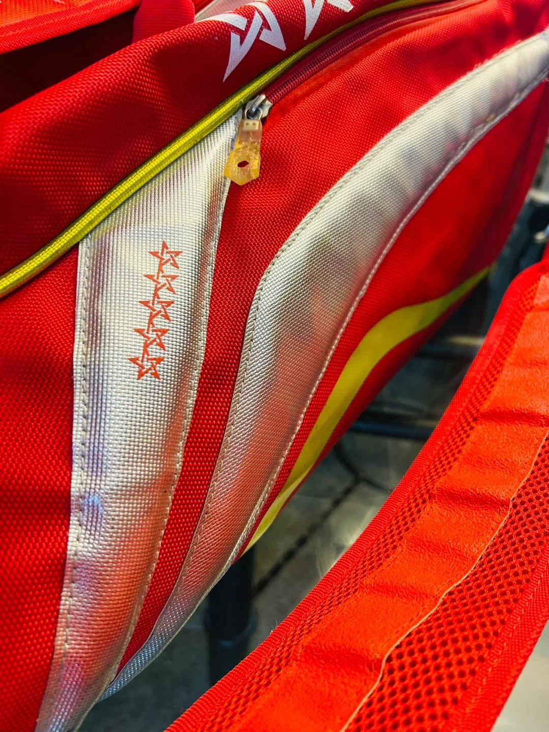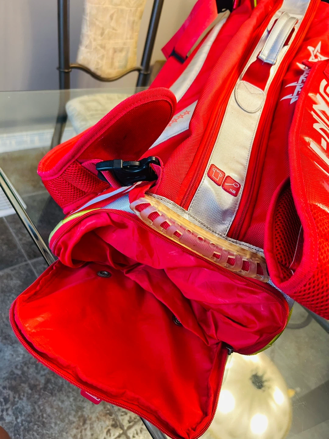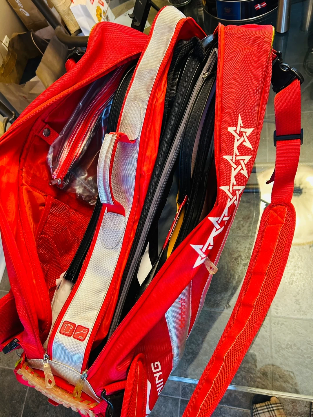 Li-Ning Premium Bag with 2 Compartments Holds up to 12 Badminton Racquets or 6 Tennis Racquets. Good Condition (Modest Wear on Bottom Front as Shown at Fig. 5)