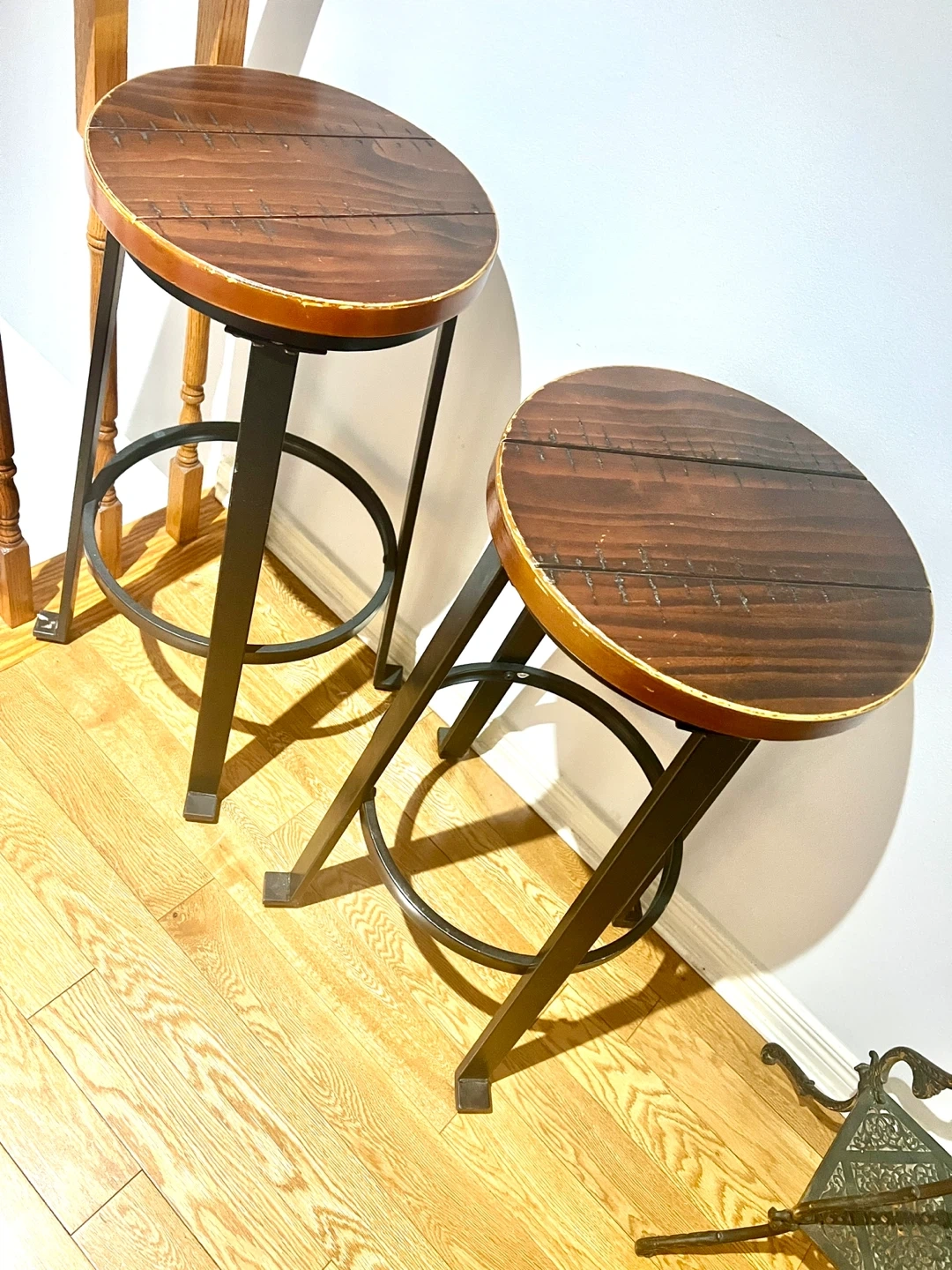 Selling a sett of 6 bar stools from Fujian Kingwell Furniture Co., Ltd. They feature a wooden seat and a metal frame. The production date on the tag is 2021 January 20.