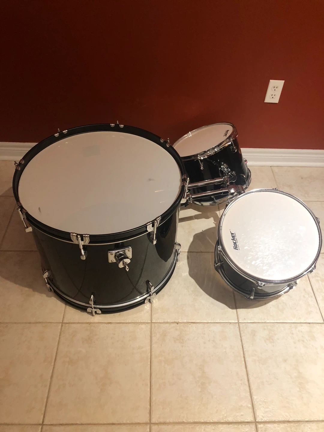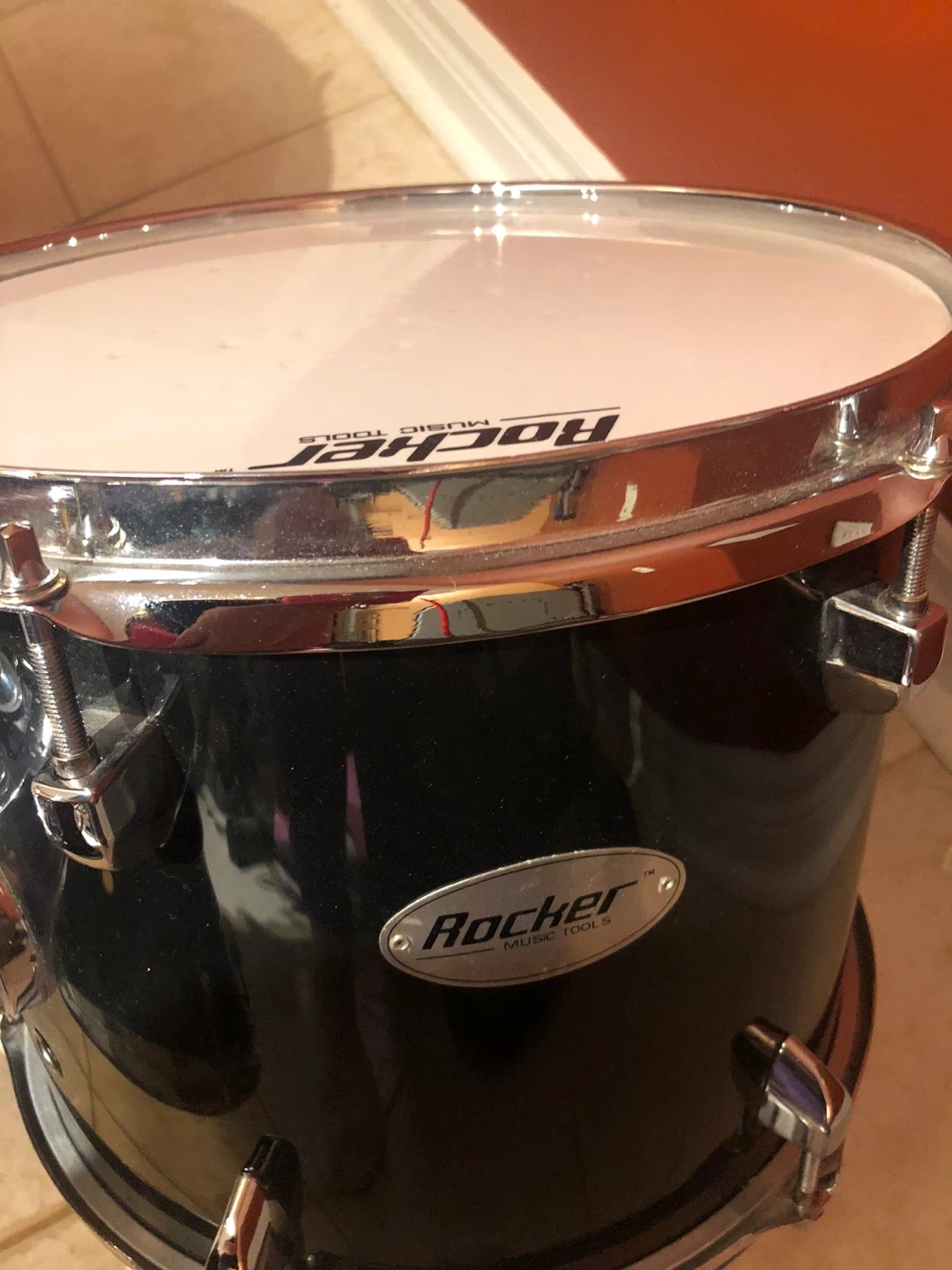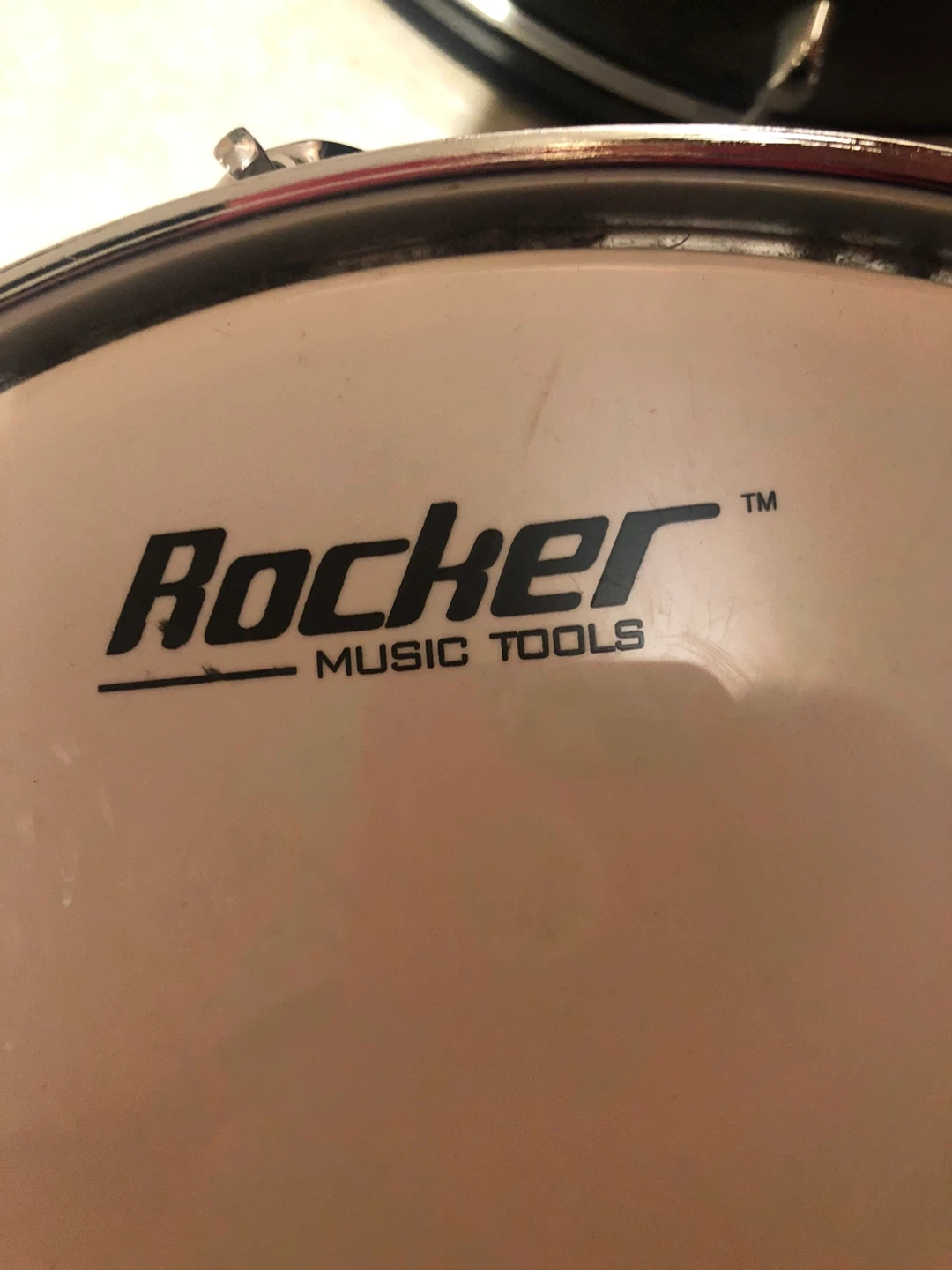 Selling a Rocker Music Tools drum set in black! It includes a bass drum, a tom drum, and a snare drum. Great for beginners or anyone looking to add to their collection!