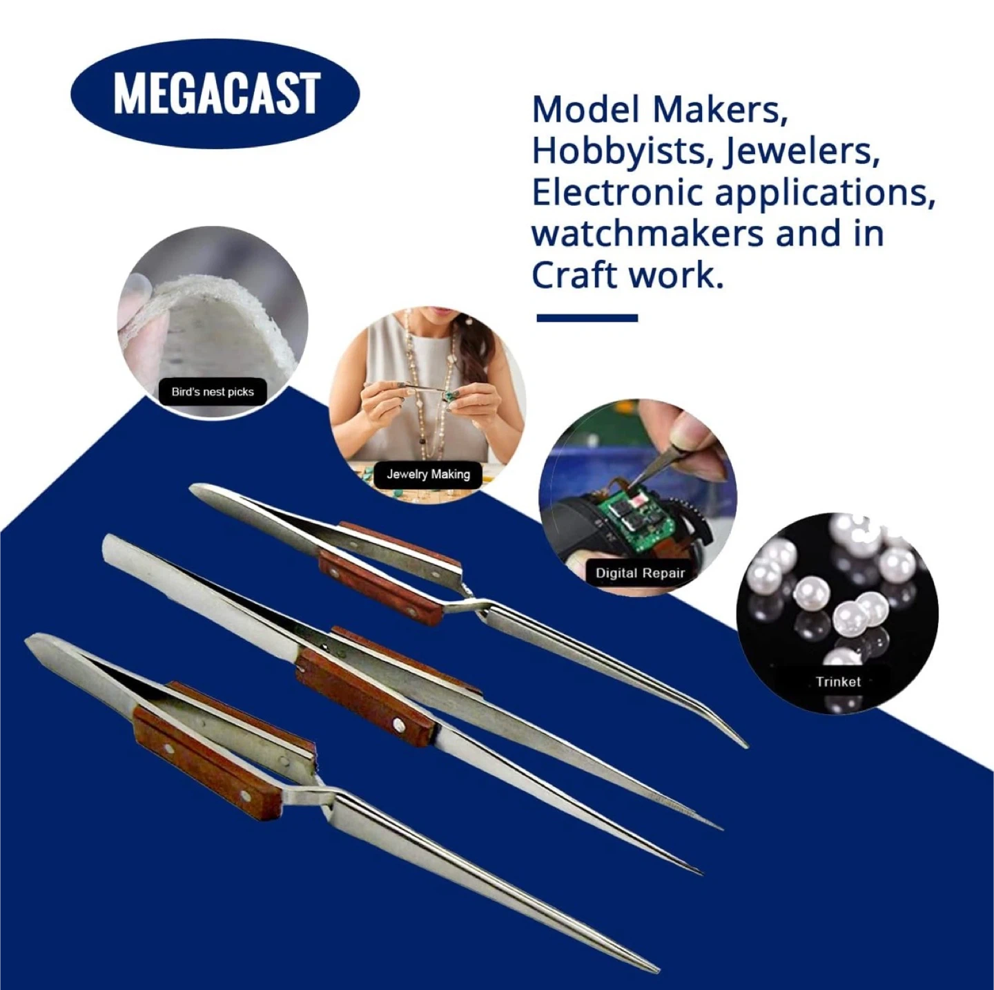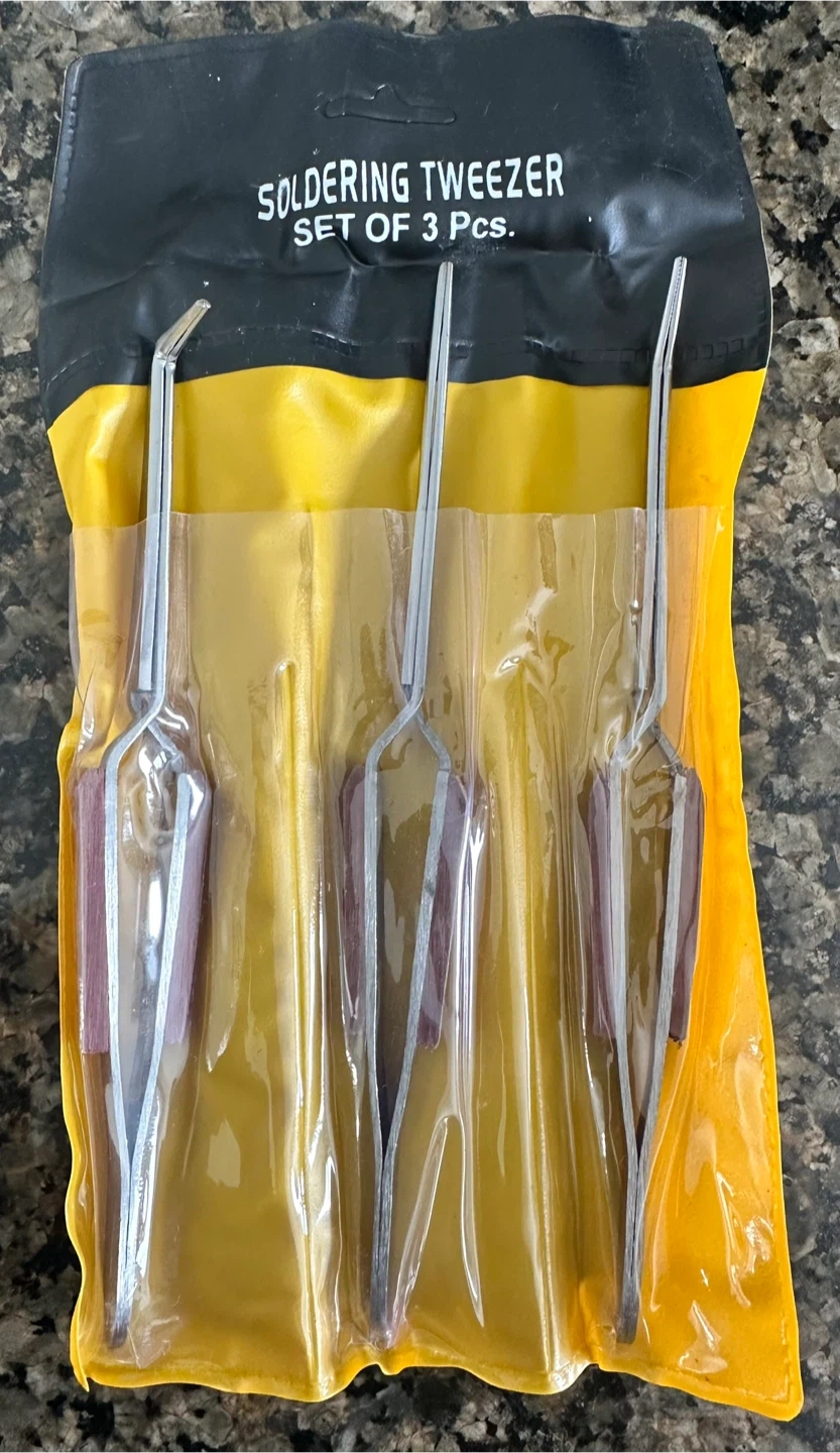 Selling a brand new set of soldering tweezers! This set includes three different tweezers, perfect for model makers, hobbyists, jewelers, electronic applications, watchmakers, and craft work. Each tweezer is 6.5 inches long. Great for digital repair and jewelry making!