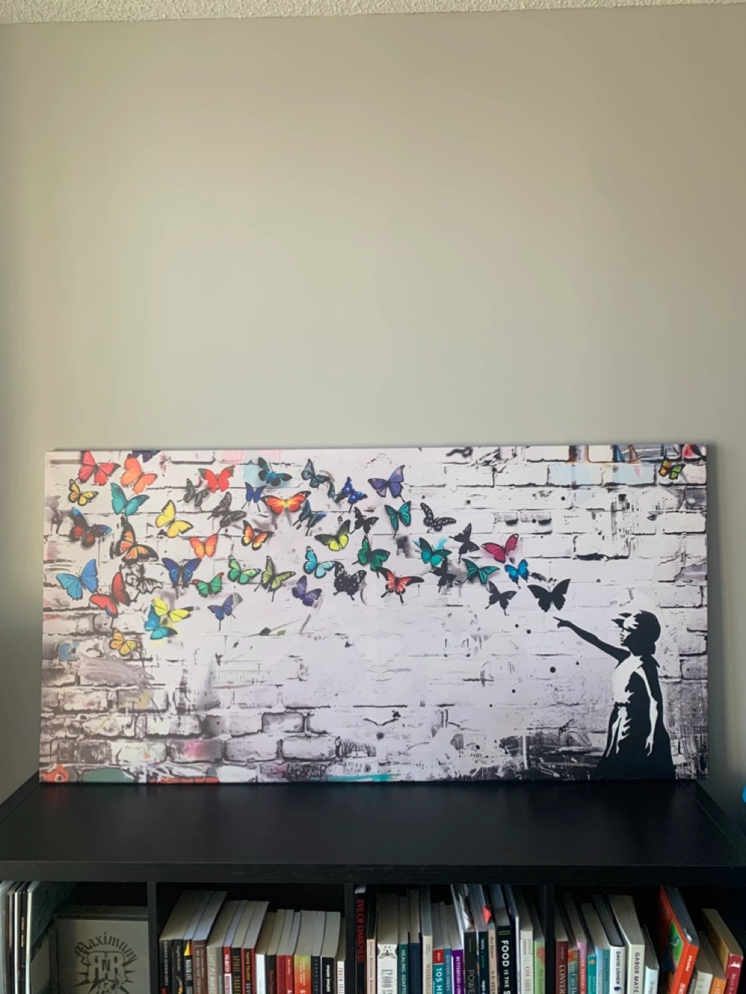 Add a unique touch to your home with this vibrant butterfly graffiti wall art (like a stretched canvas but paper-like texture). It's sure to brighten up any room! 57" x 29". No longer fits my decor. Paid about $150 for it.