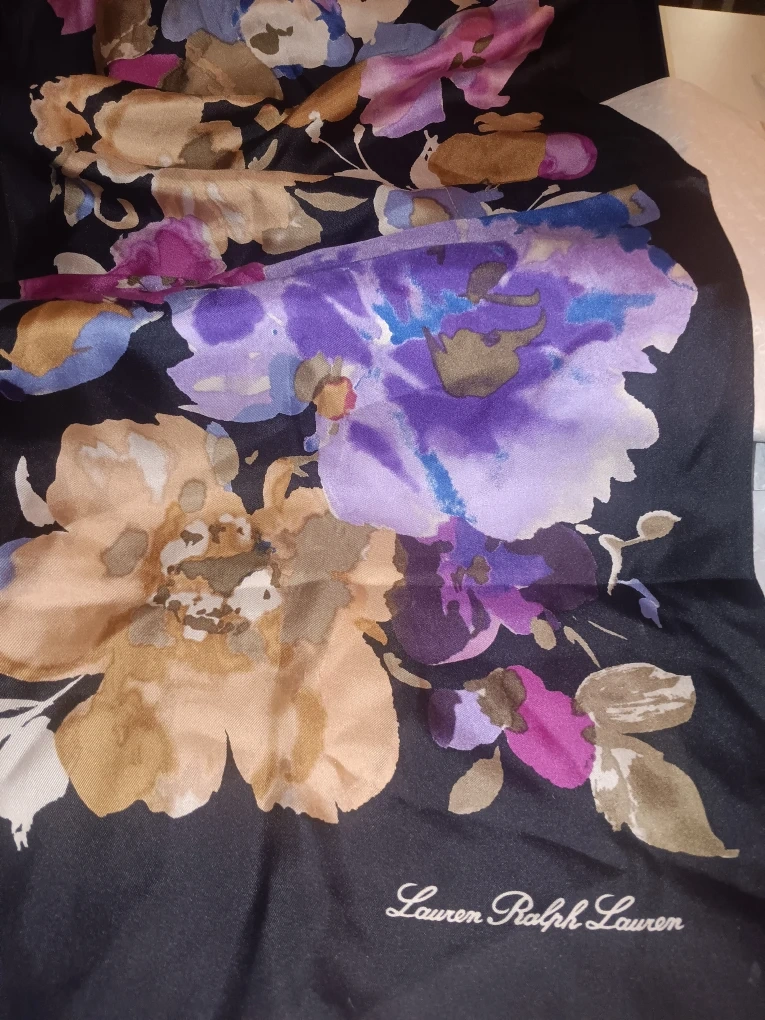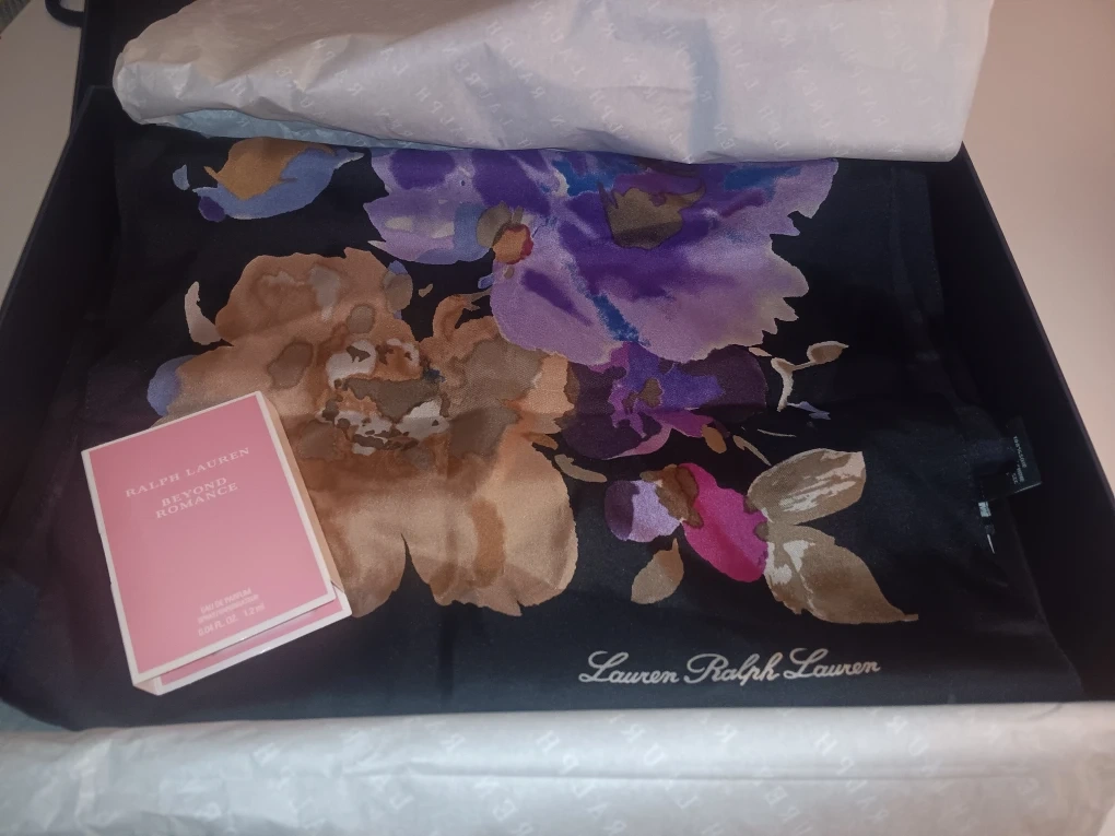 Selling a beautiful Lauren Ralph Lauren scarf with a floral design! It comes in its original box and bag. Includes FREE sample of Ralph Lauren Beyond Romance perfume. It's a lovely set!