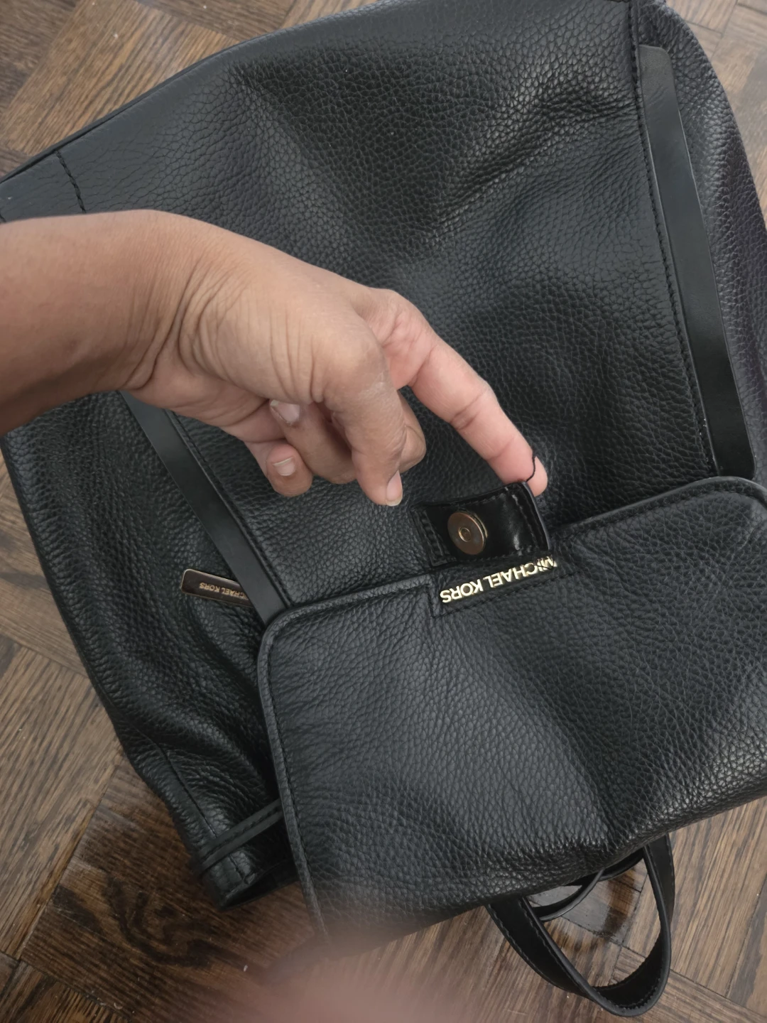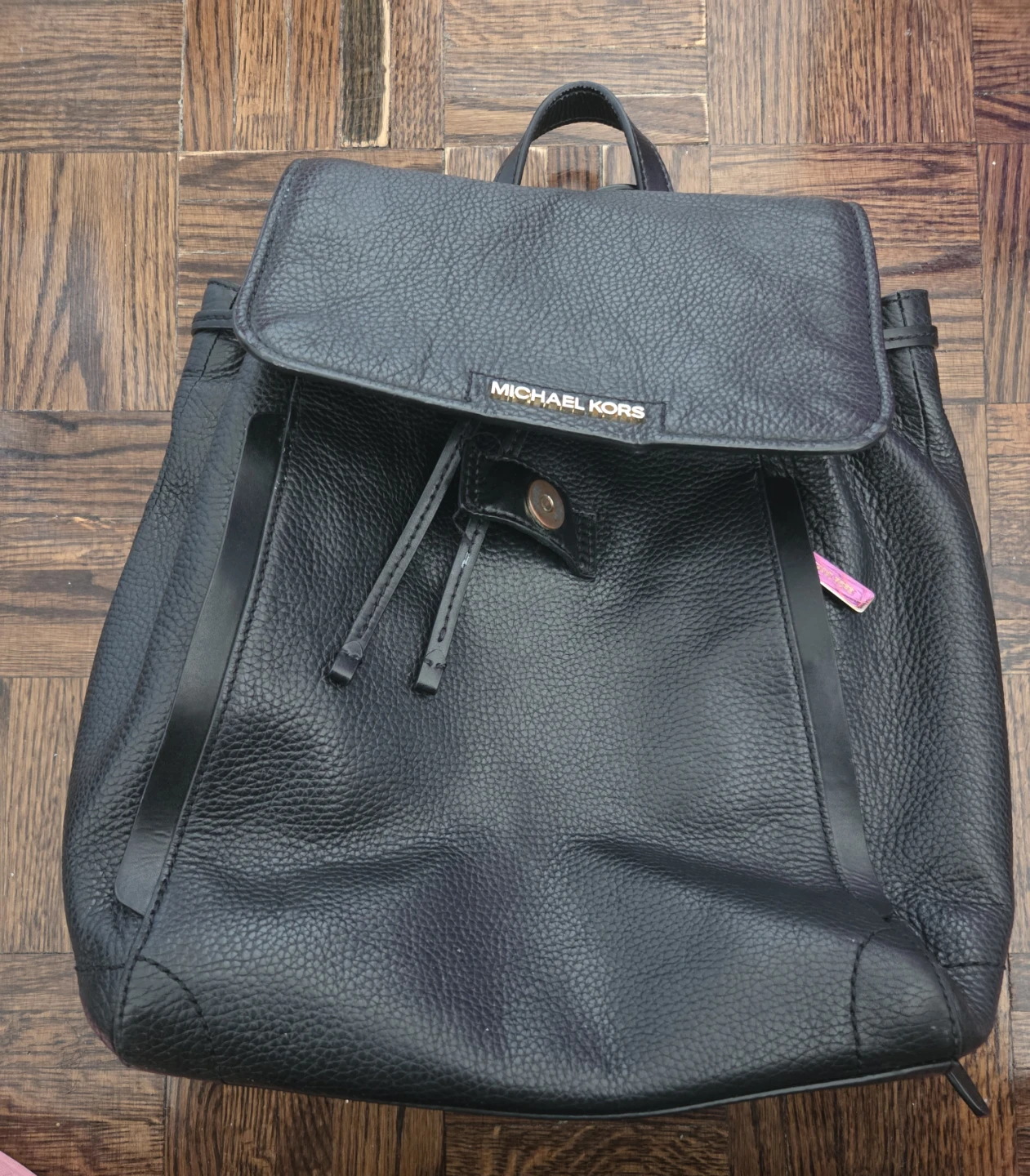 Selling a gently used Michael Kors black leather backpack. It's in good condition and perfect for everyday use! The material is leather and it is black.