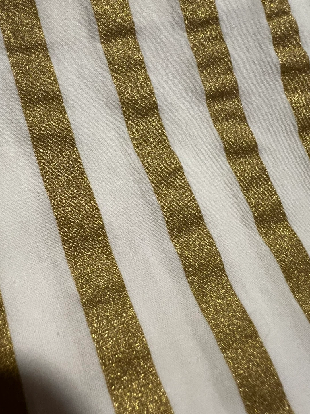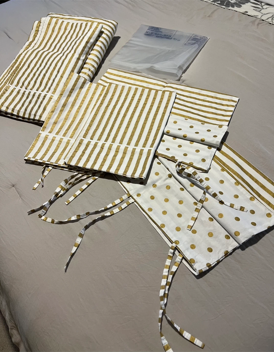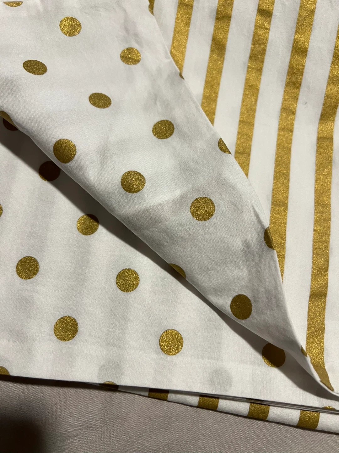 Stylish gold and white stripe , accented with polka dot pattern (shams)