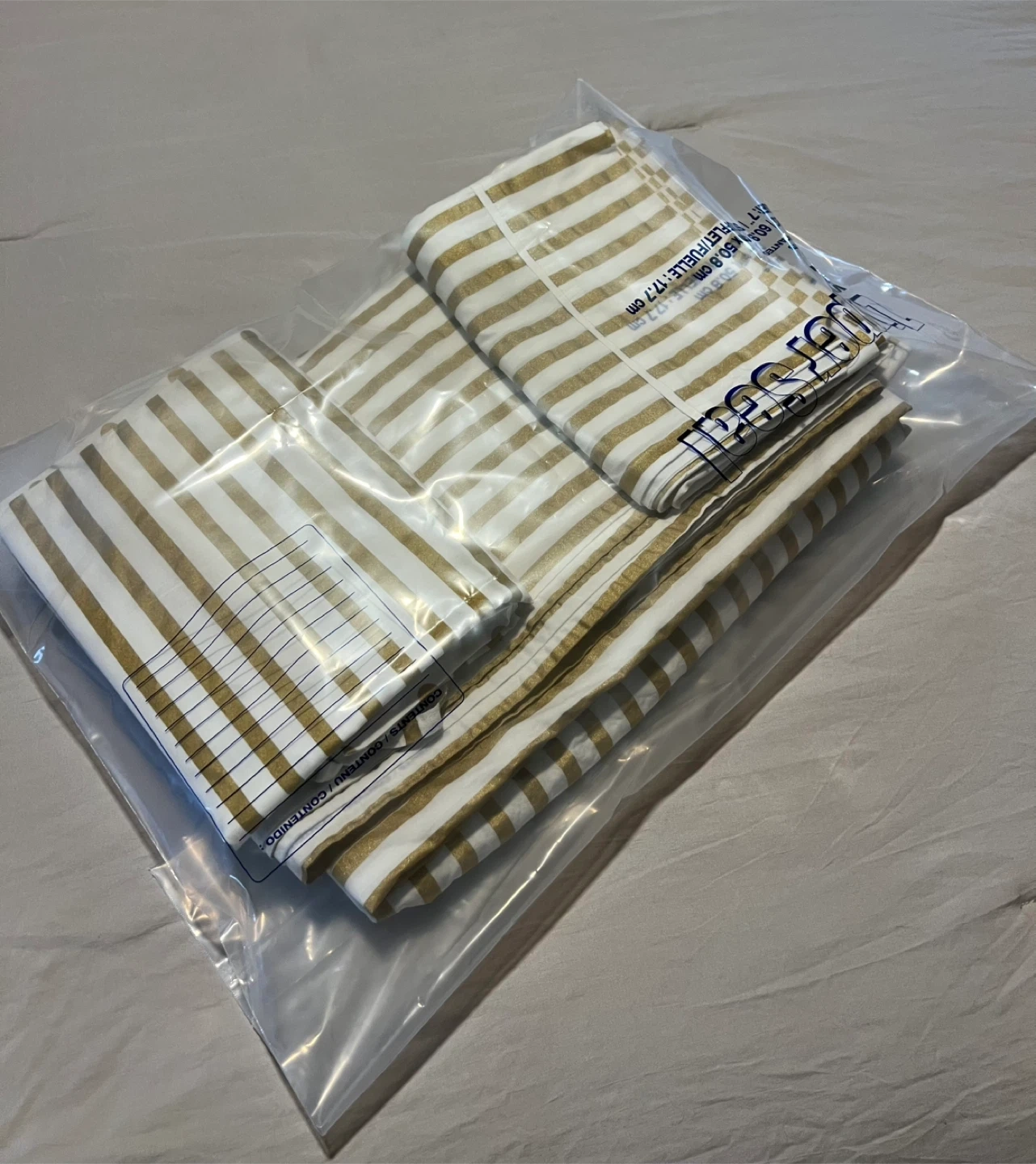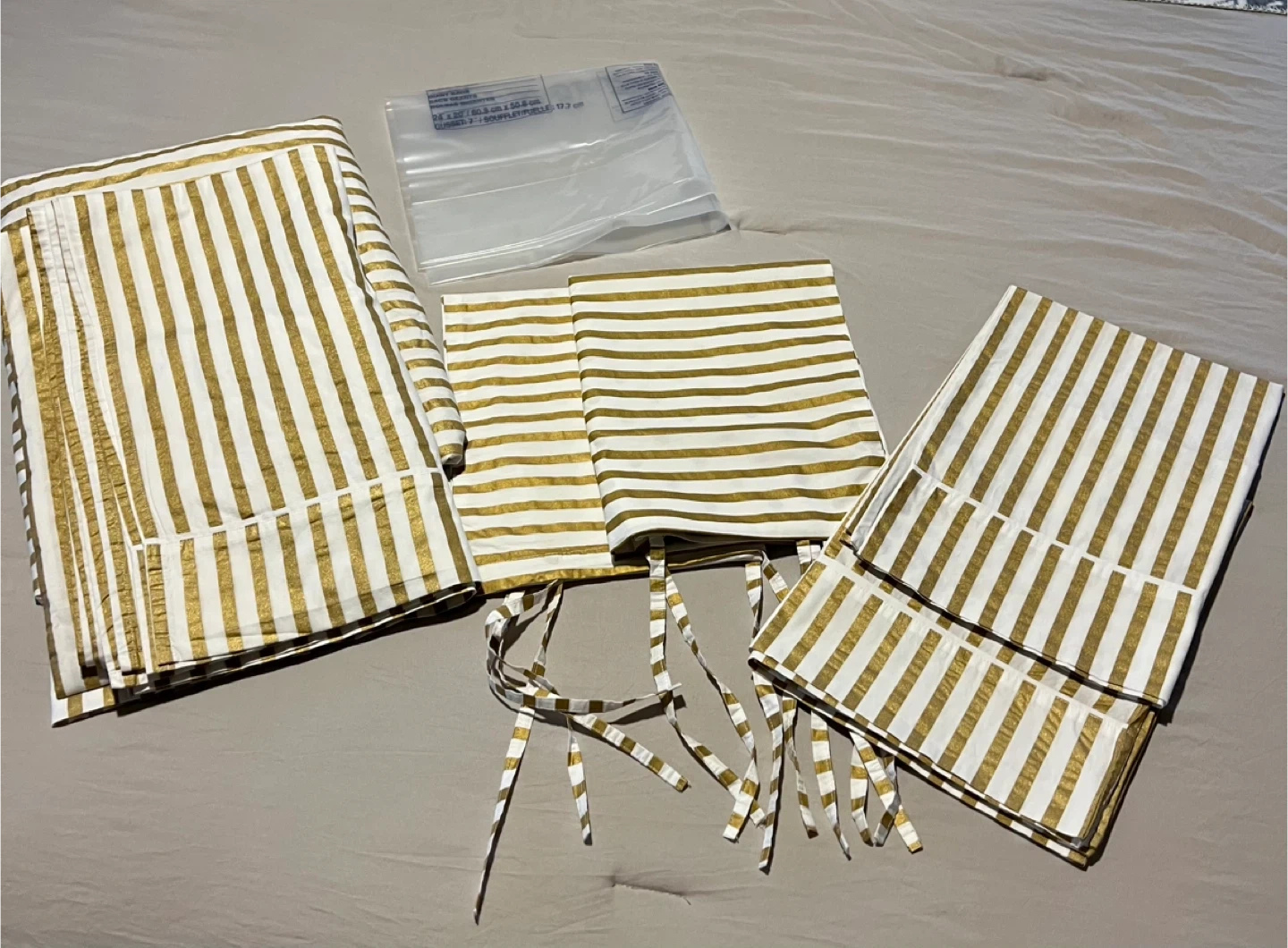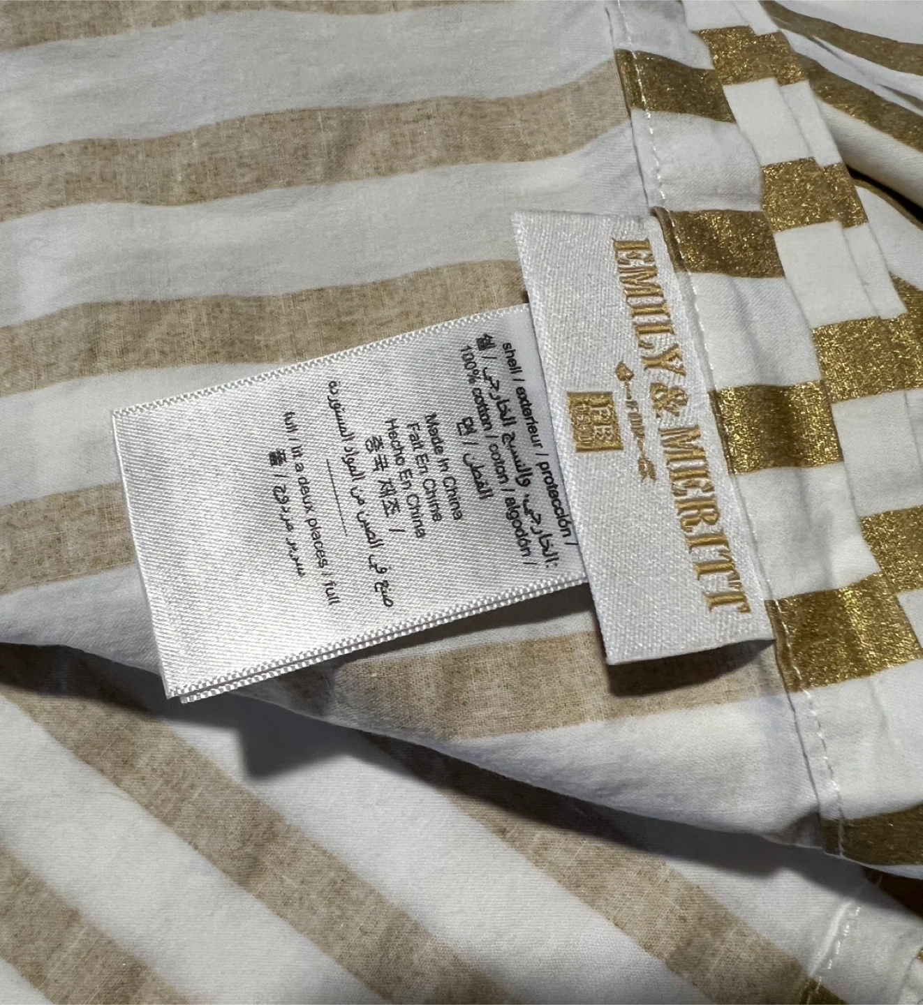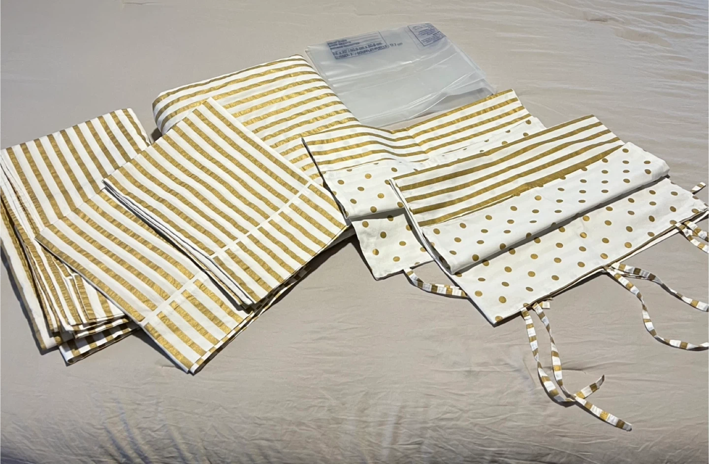 Stylish gold and white stripe , accented with polka dot pattern (shams)