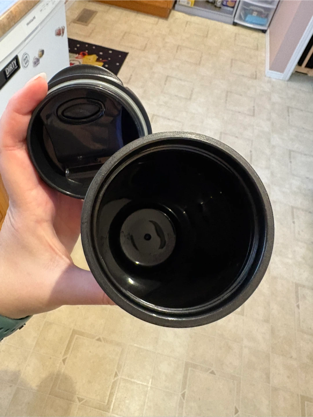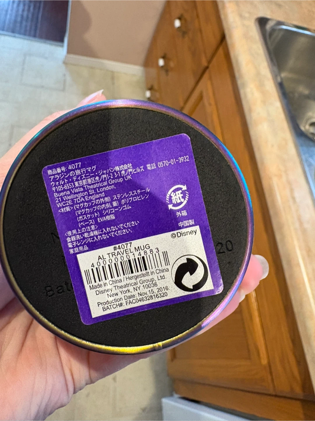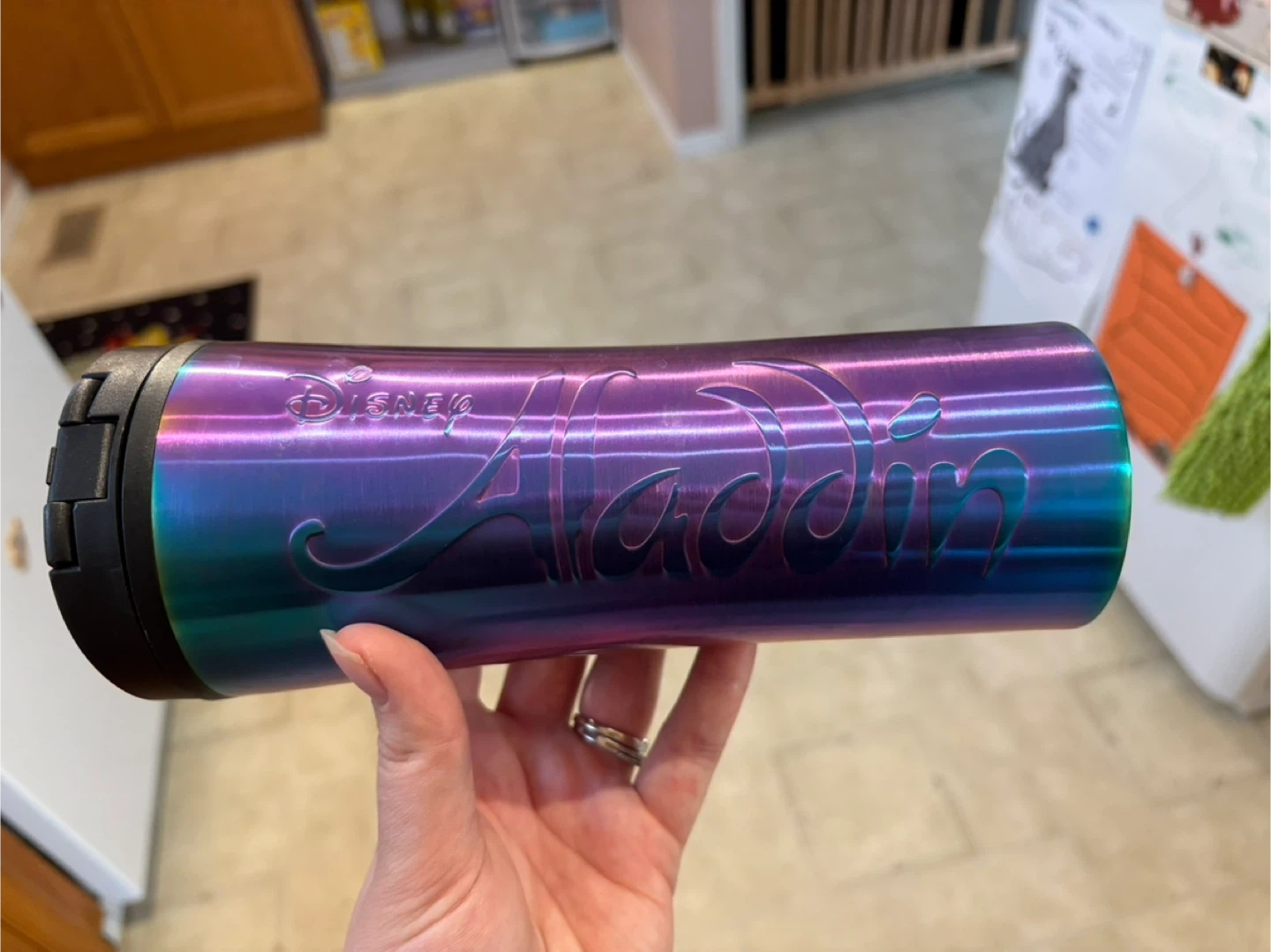 Here's a Disney Aladdin travel mug! It's in great condition. The mug is made of stainless steel and polypropylene.