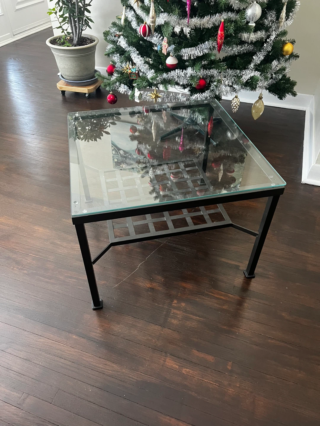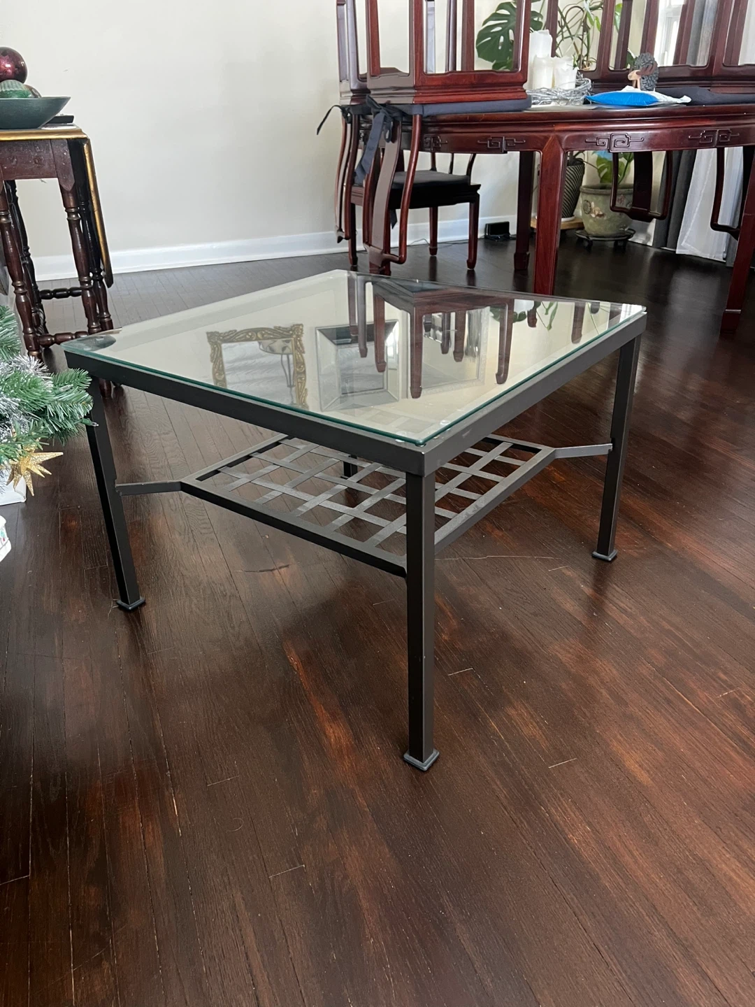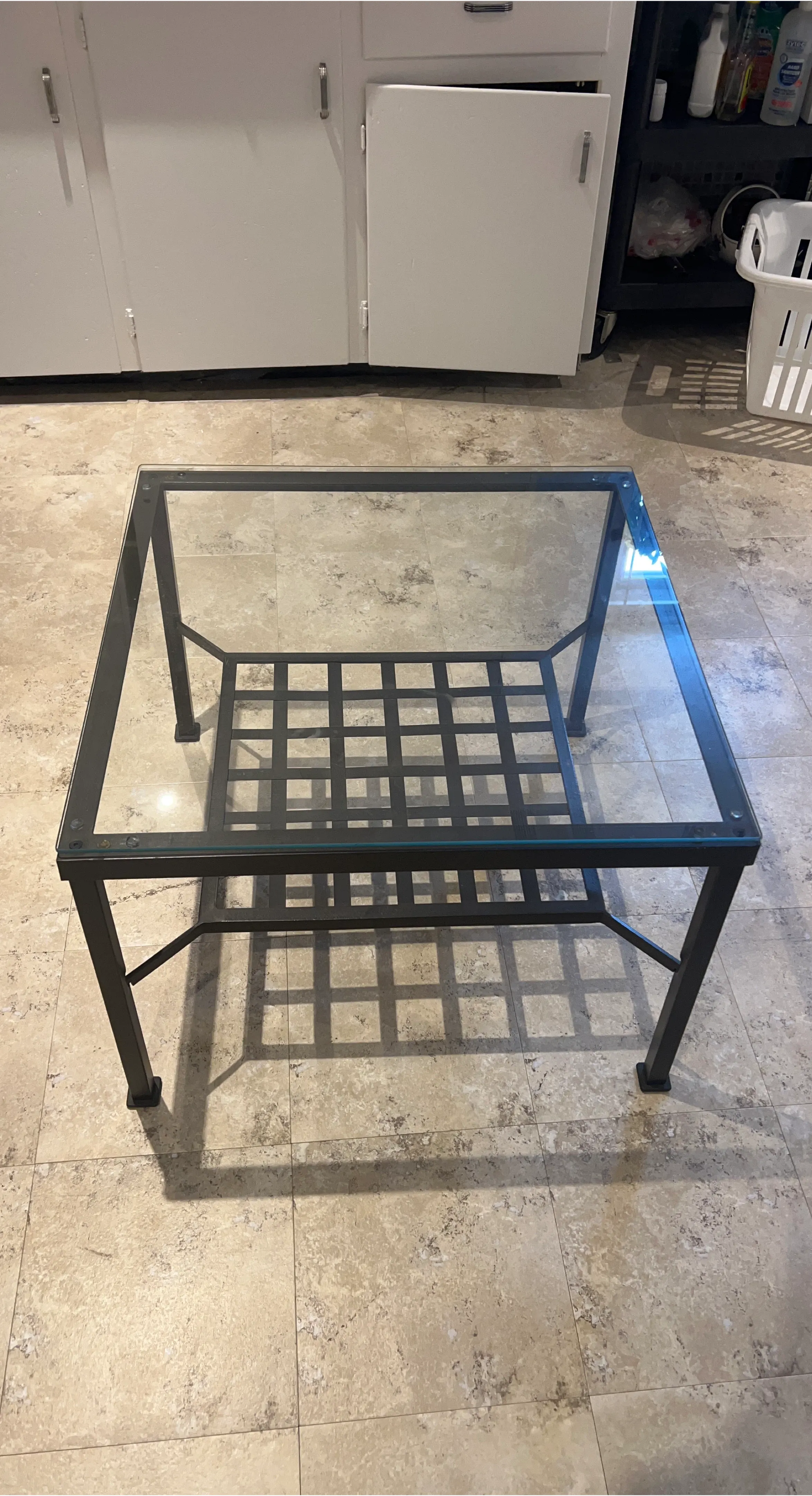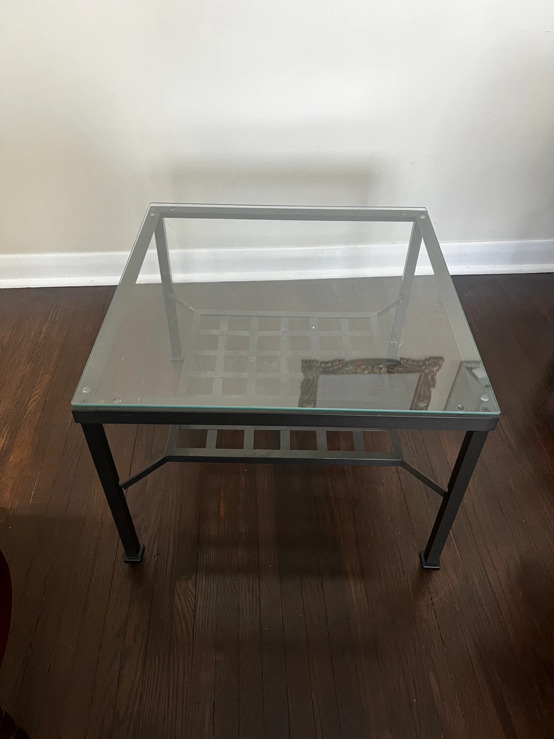 Selling a coffee table with a glass top and a dark brown metal frame. It's in great condition and would look lovely in any living room! The table has a grid design on the lower shelf, adding a touch of modern flair.
