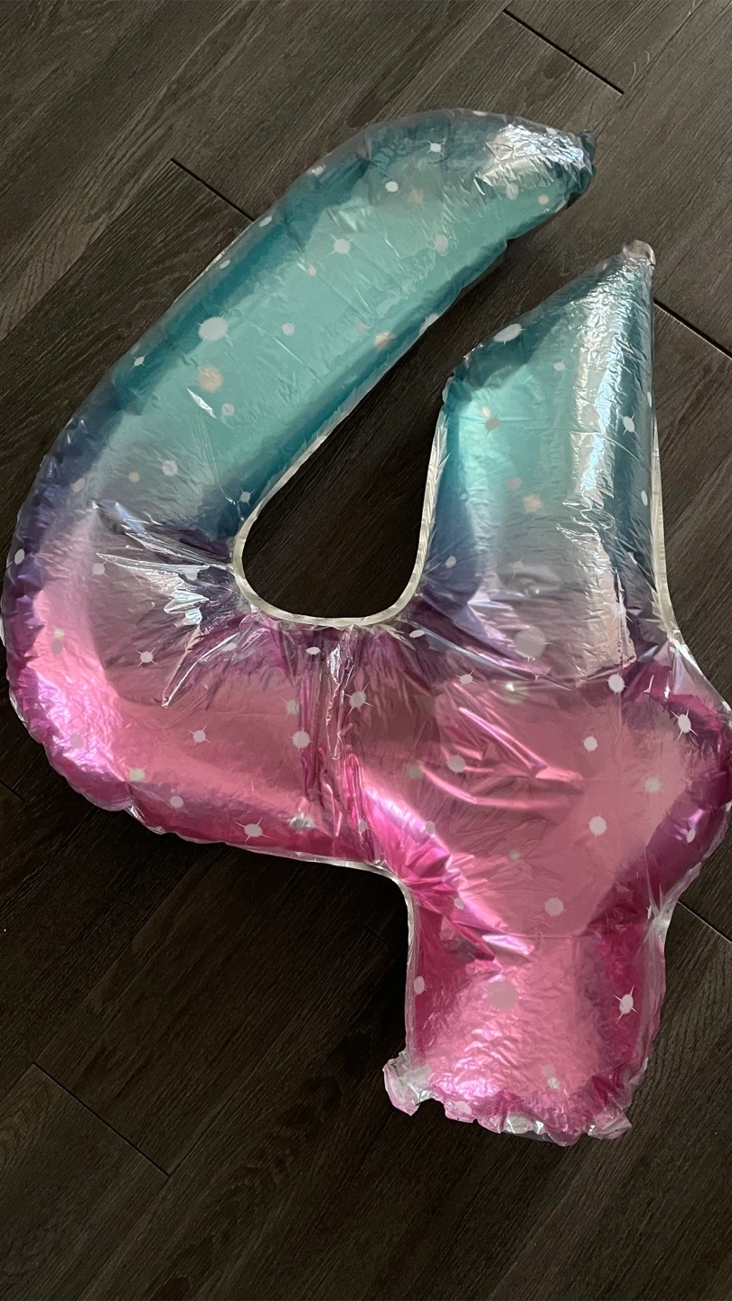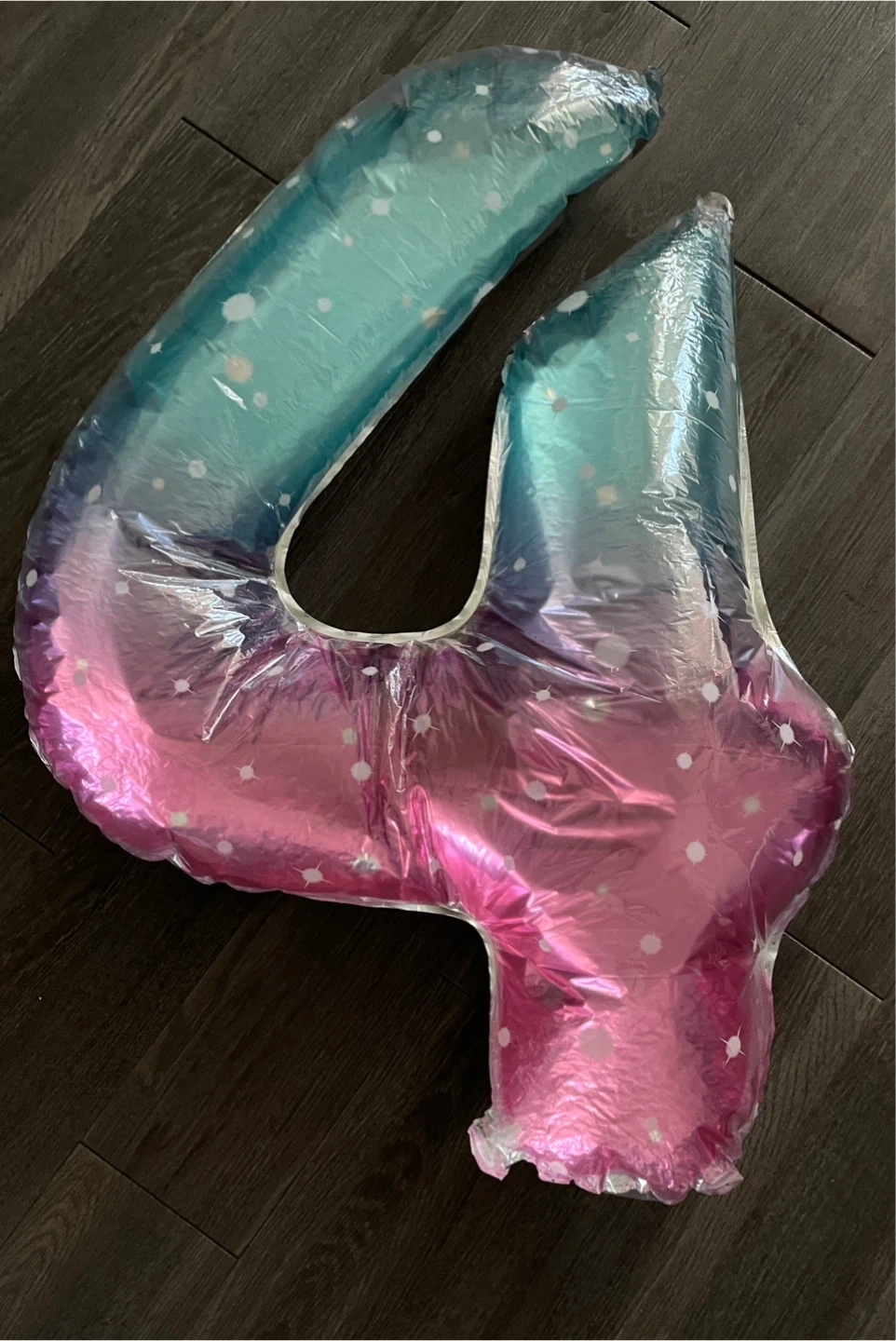 Here's a number 4 foil balloon, perfect for a birthday or celebration! It's a lovely gradient of blue and pink, ready to add a festive touch to any party