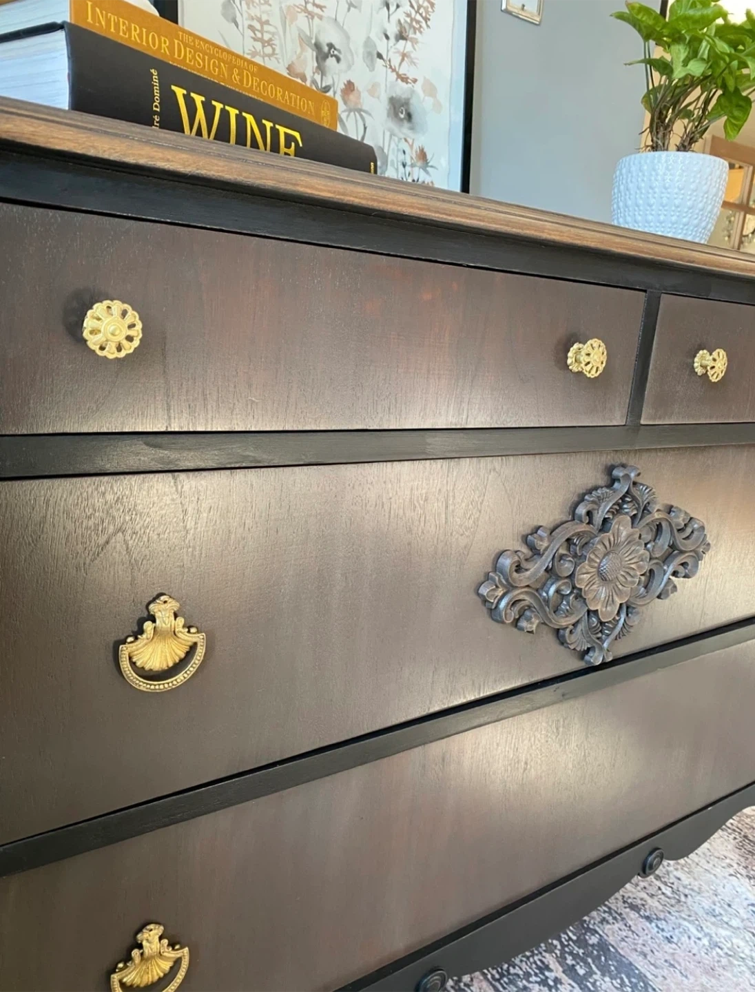 Crafted from solid walnut, this piece has been thoughtfully refinished to highlight its natural beauty while preserving its original charm. The top, drawer fronts, and front legs were stripped and stained in Cappuccino, bringing out the rich walnut grain. The body is finished in Coal Black, creating an elegant contrast that works beautifully in both classic and contemporary interiors.