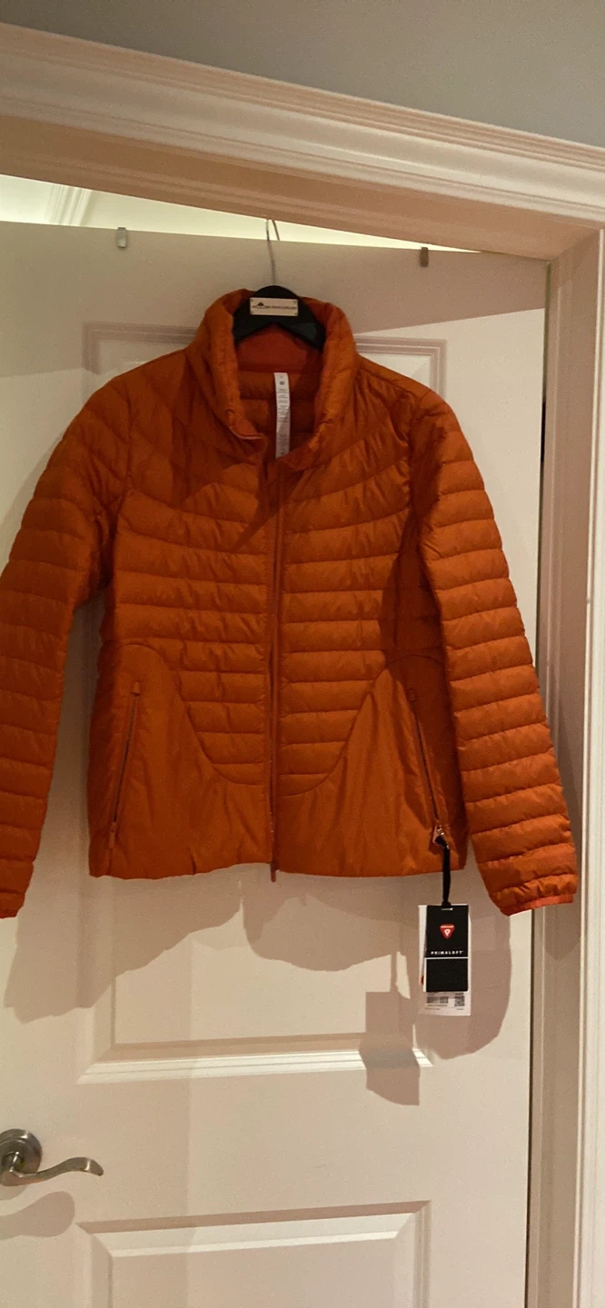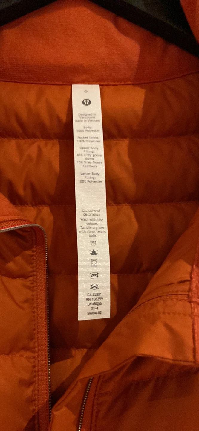 Selling a Lululemon Down For It All Jacket in size 6. It's in a lovely orange colour. - Body: 100% Polyester - Pocket lining: 100% Polyester - Upper body: 85% Grey goose down, 15% Grey goose feathers - Lower body: 100% Polyester