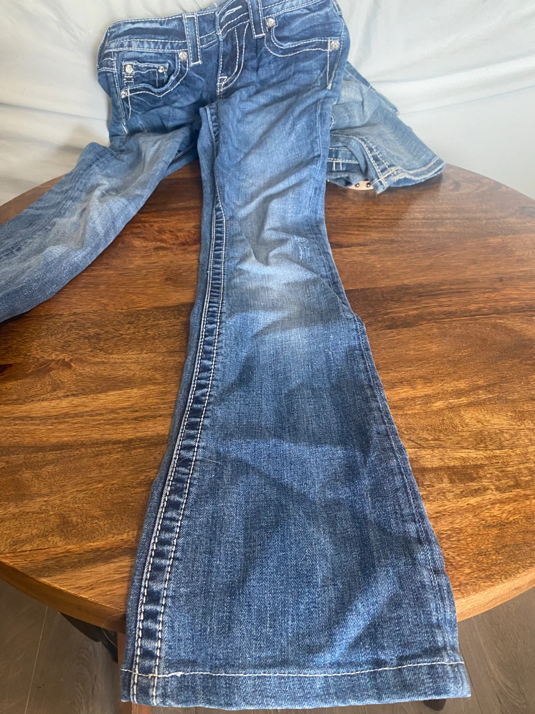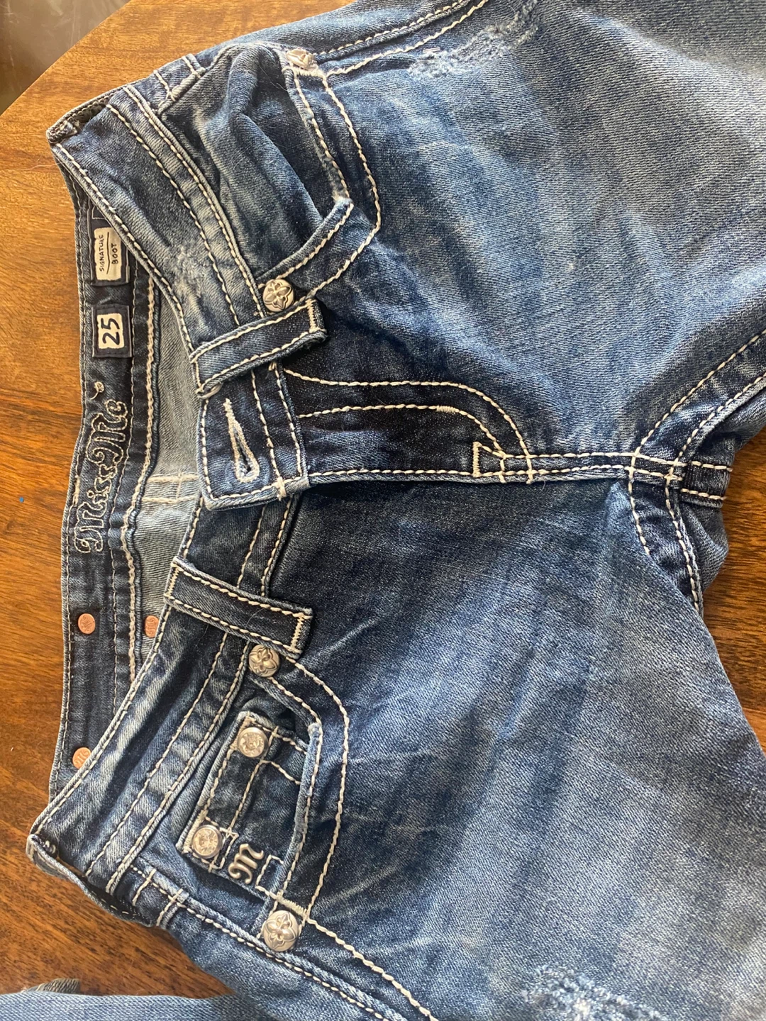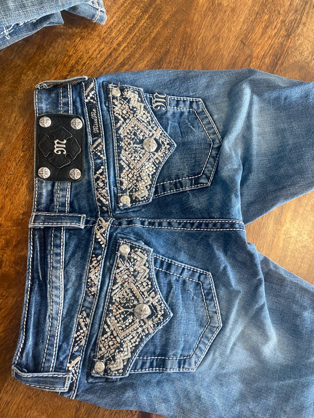 Selling a pair of Miss Me jeans, low rise, in size 25. They are in good condition and feature detailed embellishments on the pockets. Perfect for adding a bit of sparkle to your wardrobe!
