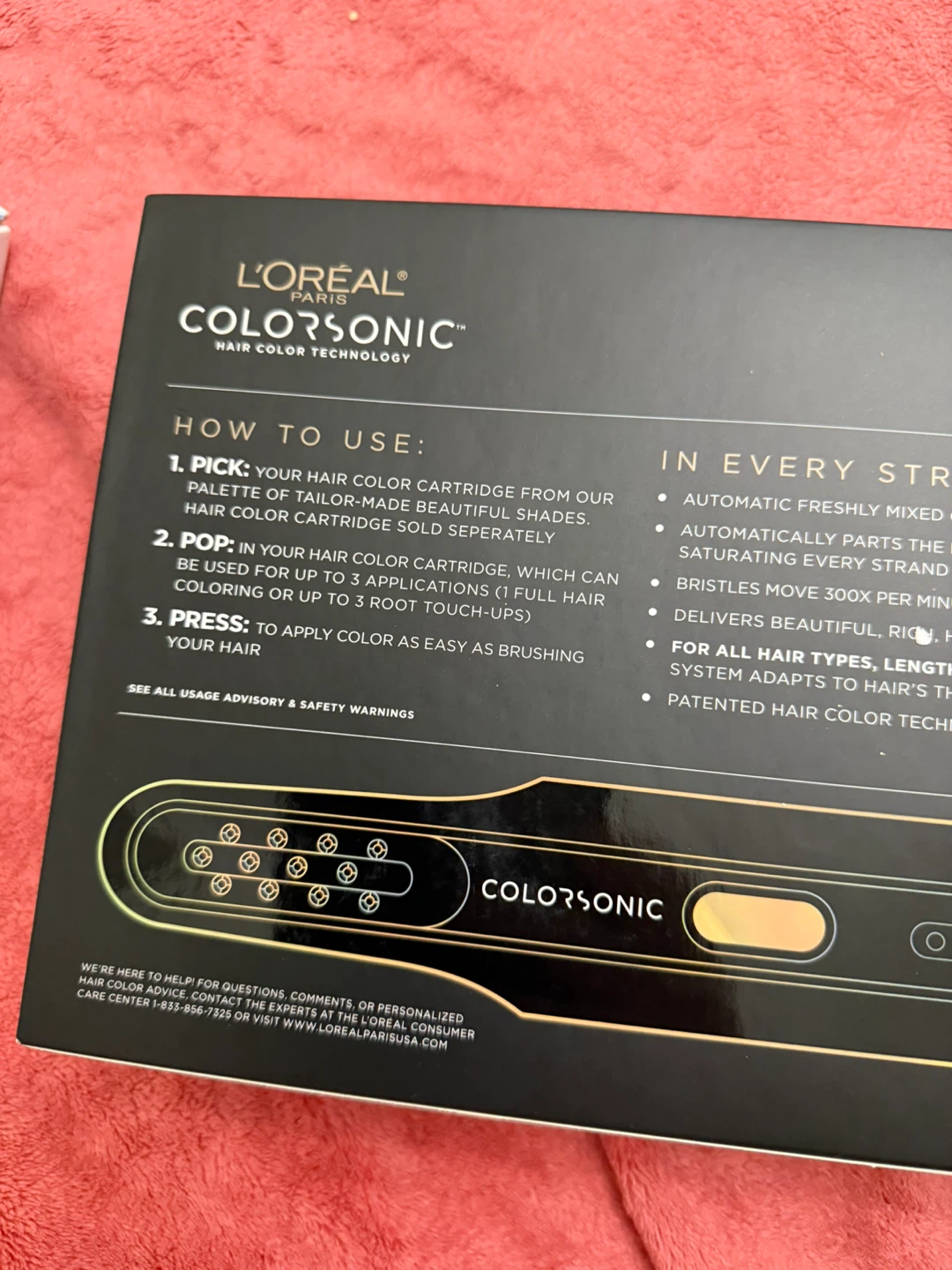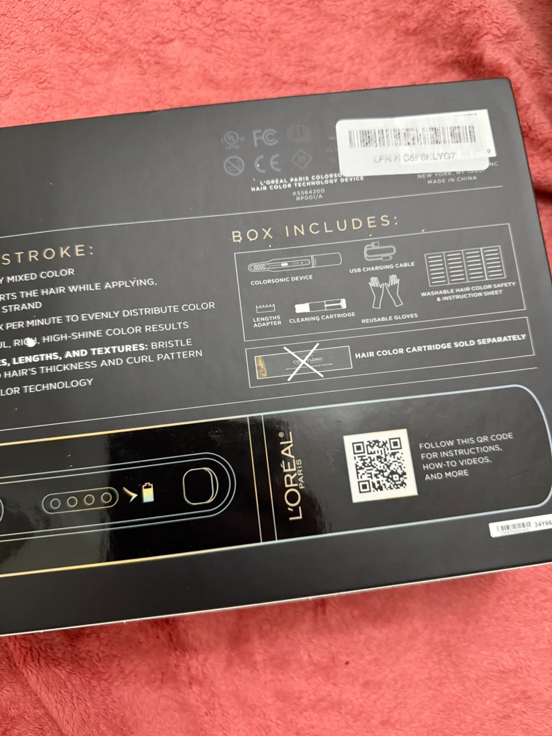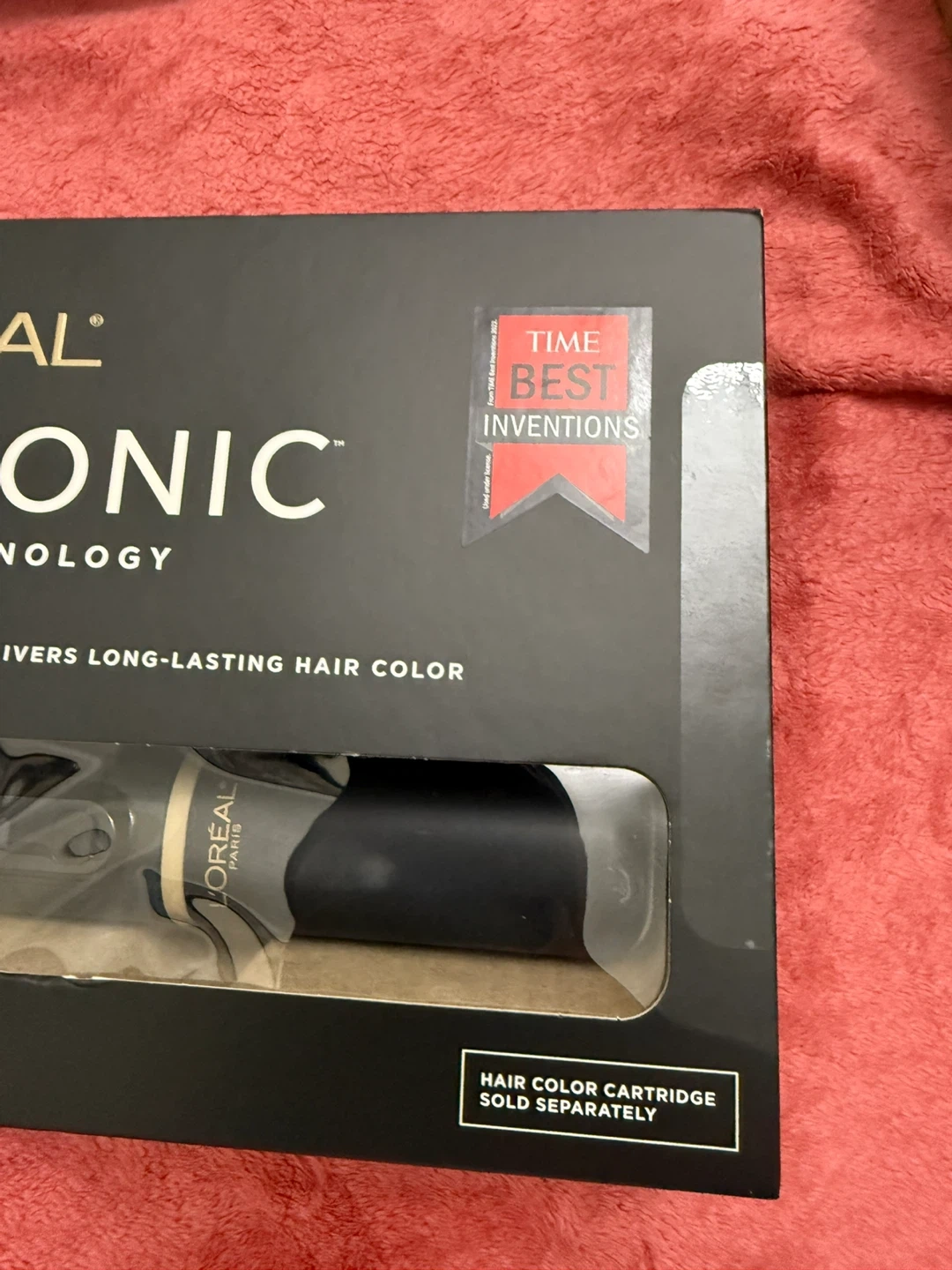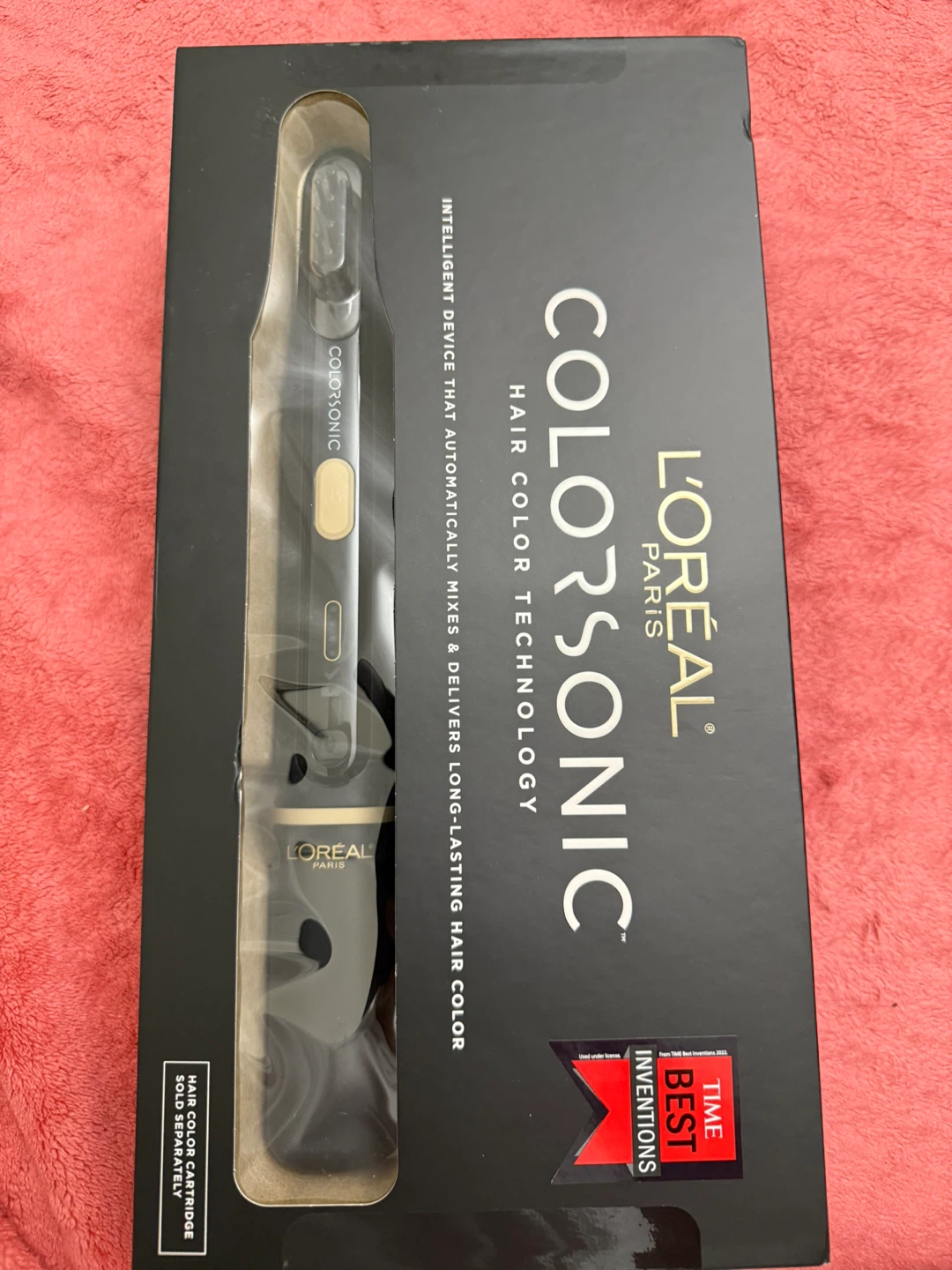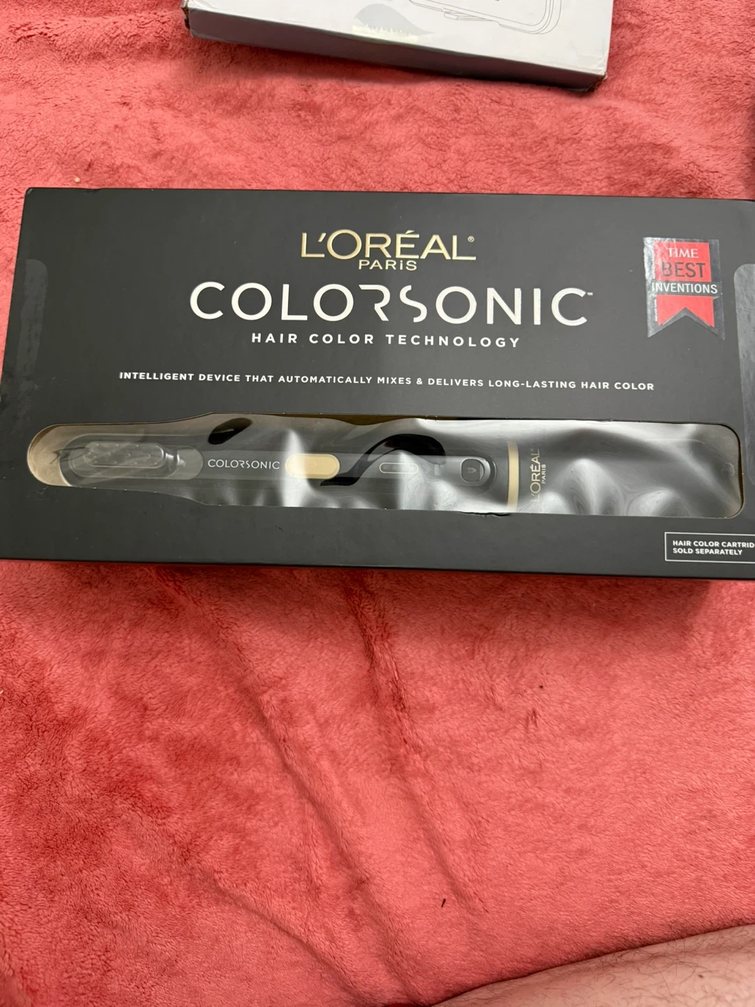 Selling a L'Oreal Paris Colorsonic hair color device! This intelligent device automatically mixes and delivers long-lasting hair color. The box includes the Colorsonic device, a USB charging cable, a lengths adapter, a cleaning cartridge, reusable gloves, and a washable hair color safety & instruction sheet