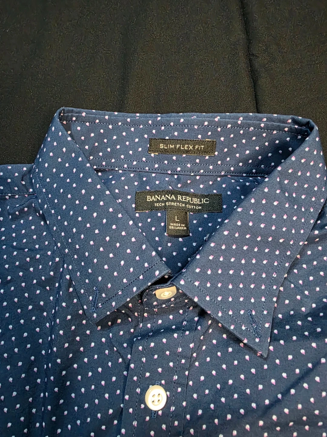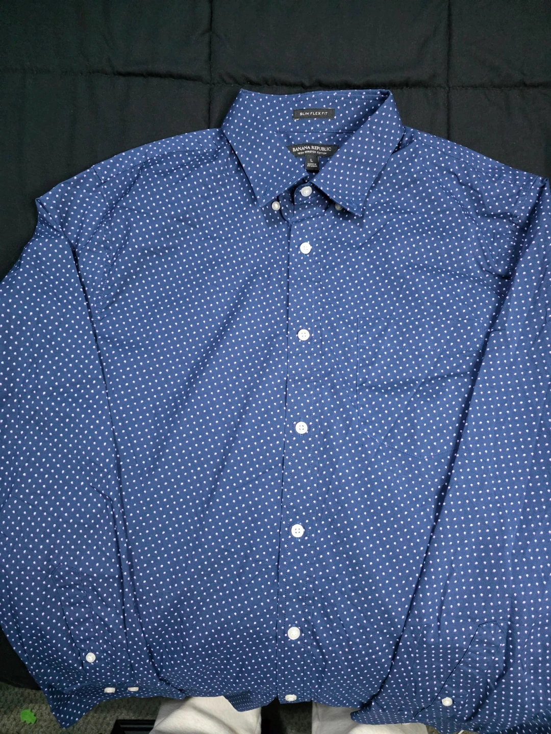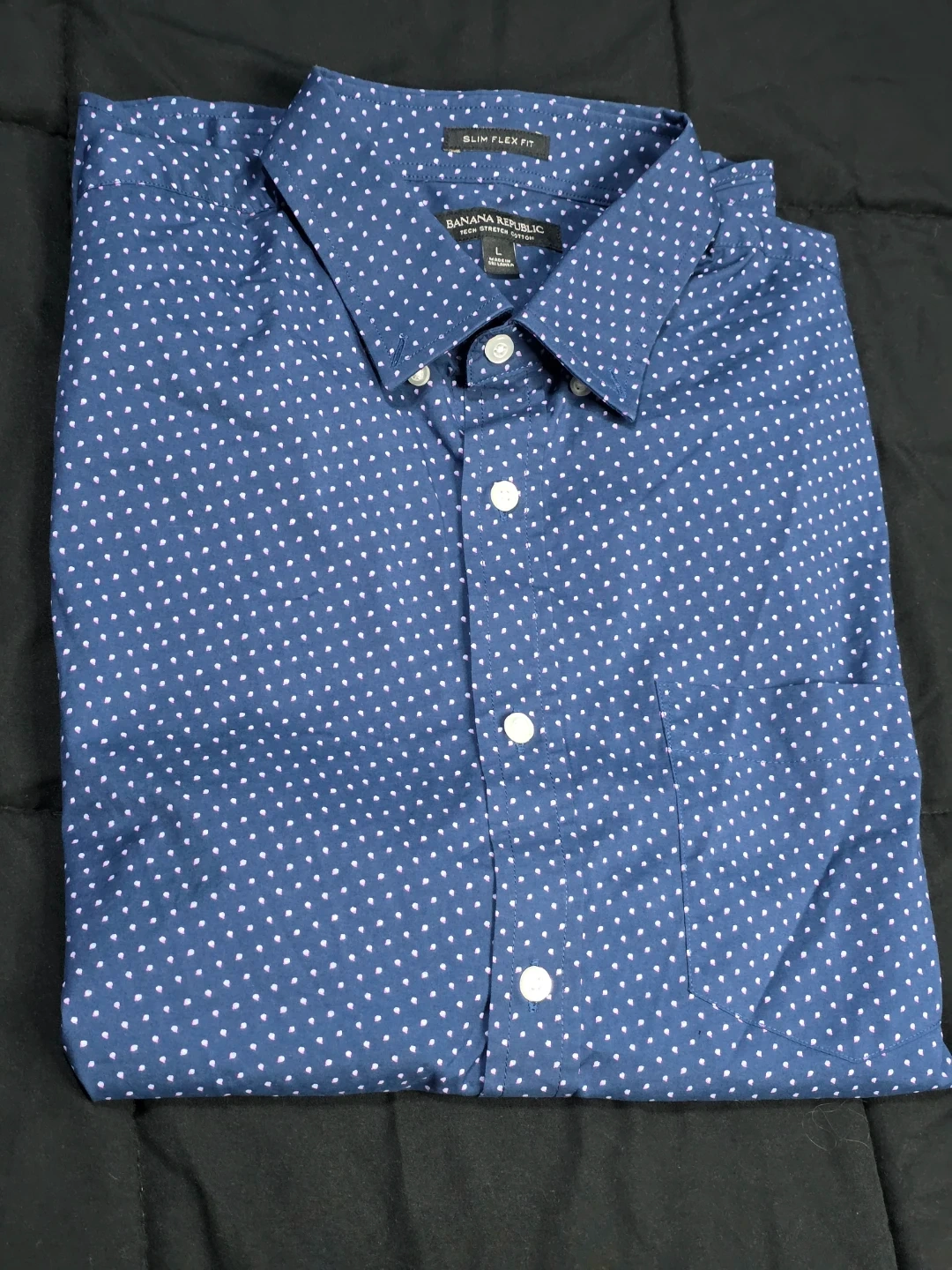 Banana Republic button-down shirt in size L. It's a slim flex fit, made with tech stretch cotton. The shirt is blue with a subtle white polka dot pattern. Great for a smart-casual look!