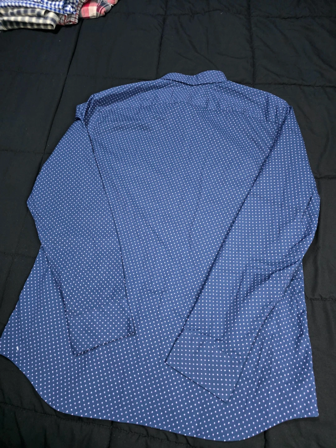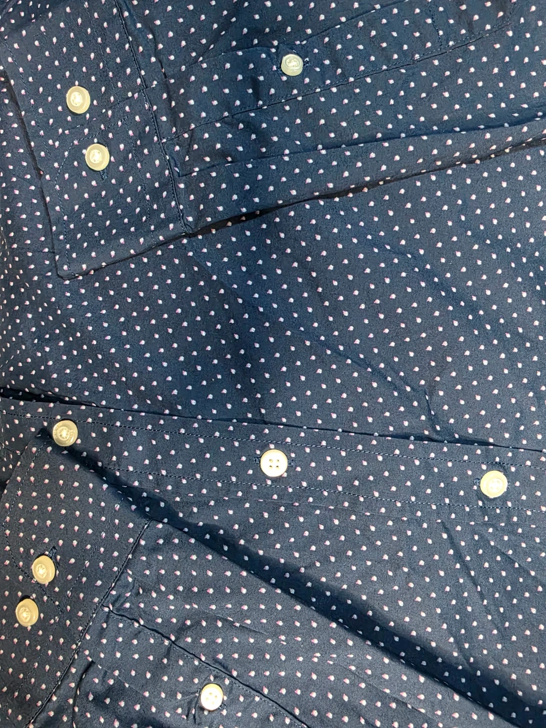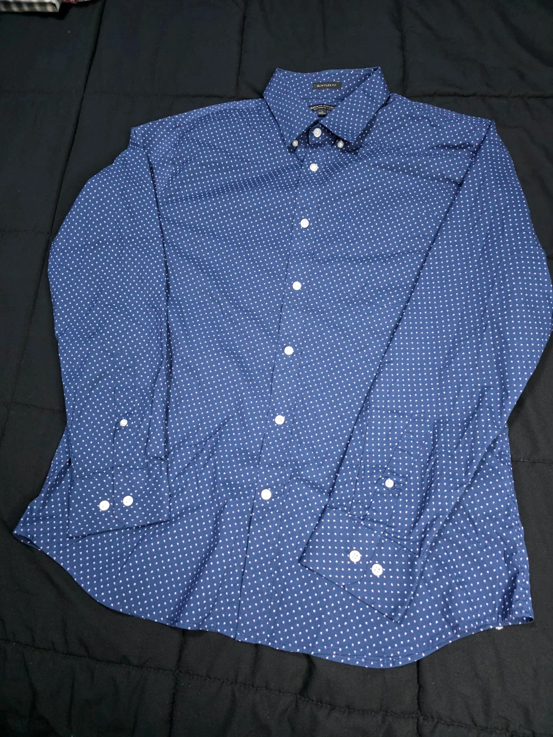 Banana Republic button-down shirt in size L. It's a slim flex fit, made with tech stretch cotton. The shirt is blue with a subtle white polka dot pattern. Great for a smart-casual look!