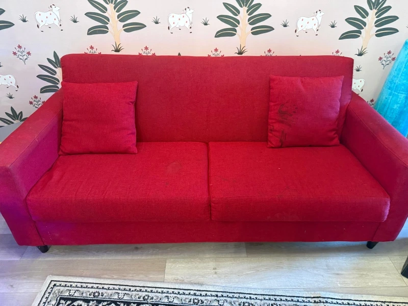 I'm selling a comfy red sofa. It's a great size for apartments or smaller living rooms. It has a modern look and is in good condition. Perfect for relaxing after a long day!