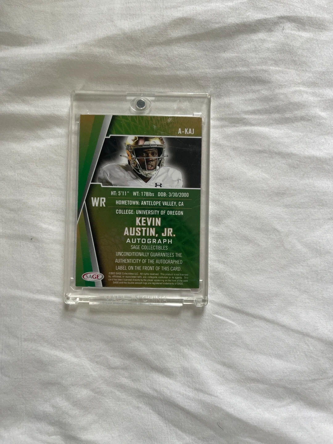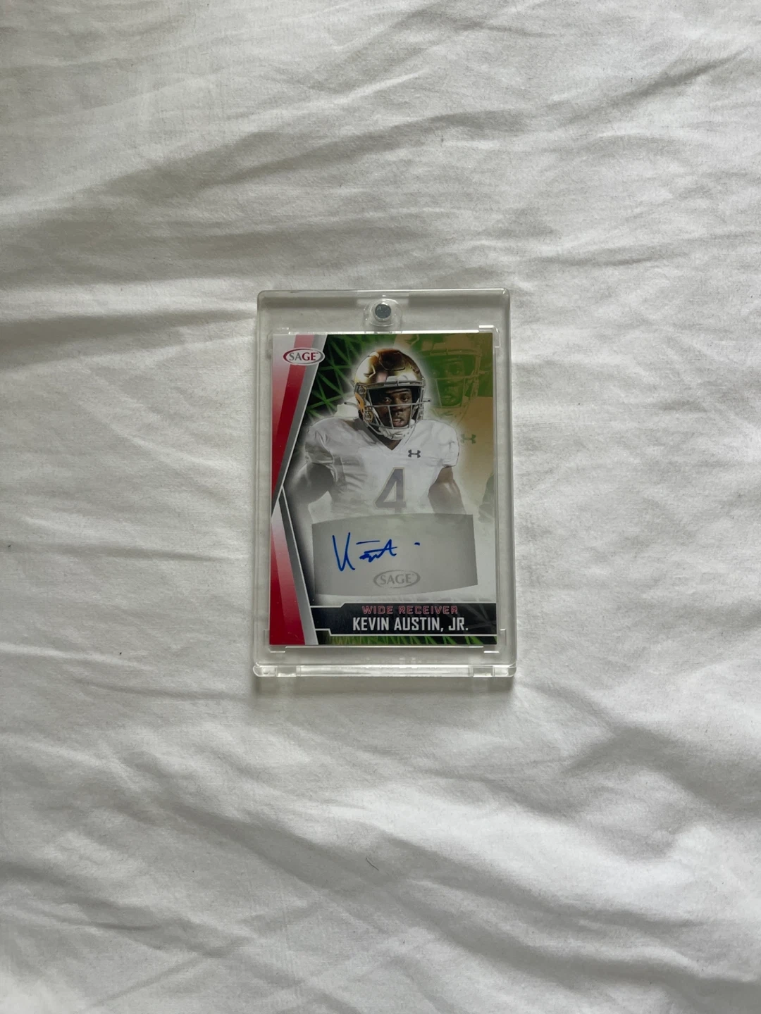 Selling a Kevin Austin Jr. autographed football card. It's from SAGE Collectibles and unconditionally guarantees the authenticity of the autographed FACSIMILE on the front of this card