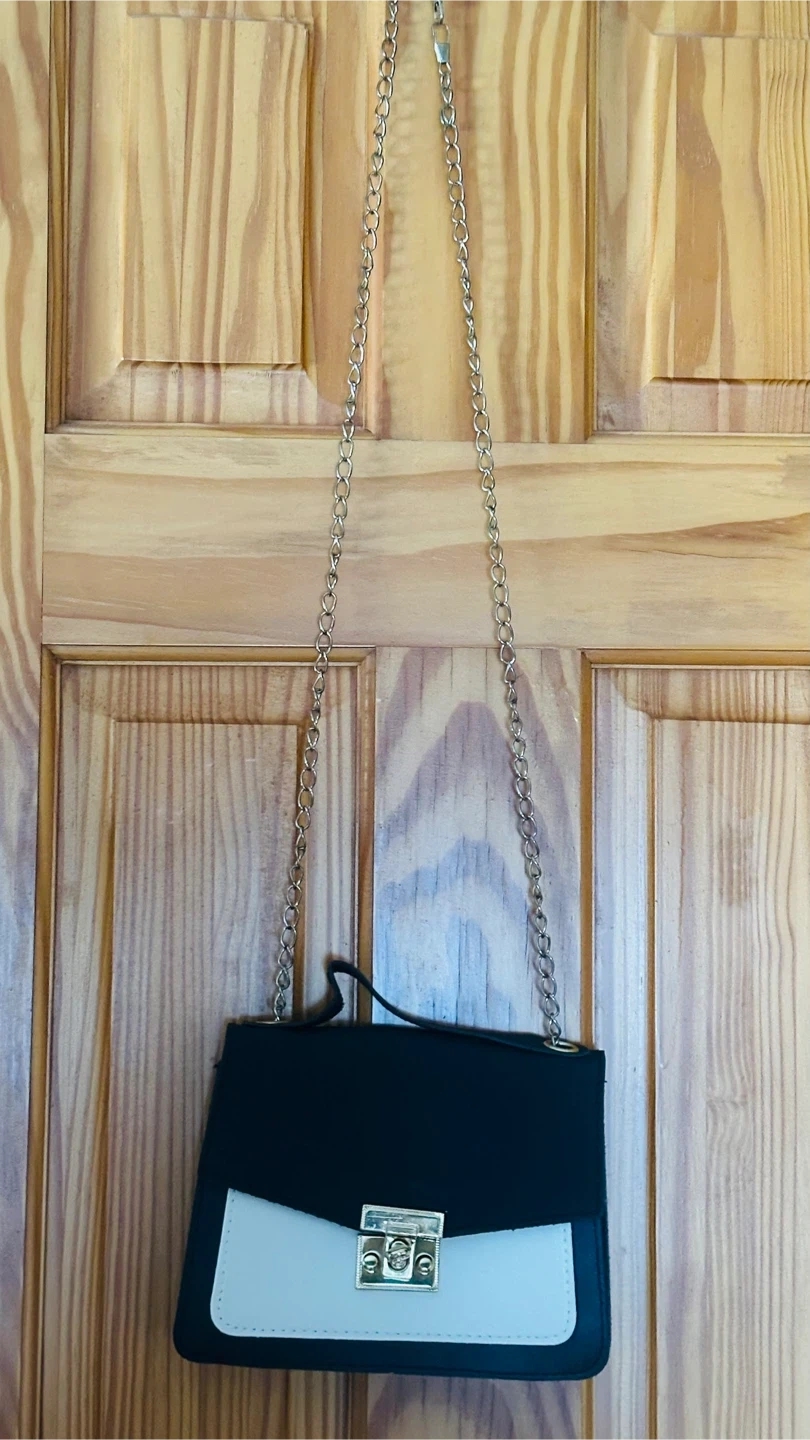 Here's a cute black and cream shoulder bag with a chain strap! It's perfect for adding a touch of style to any outfit. The bag is in great condition and ready for a new owner